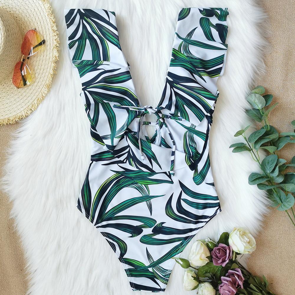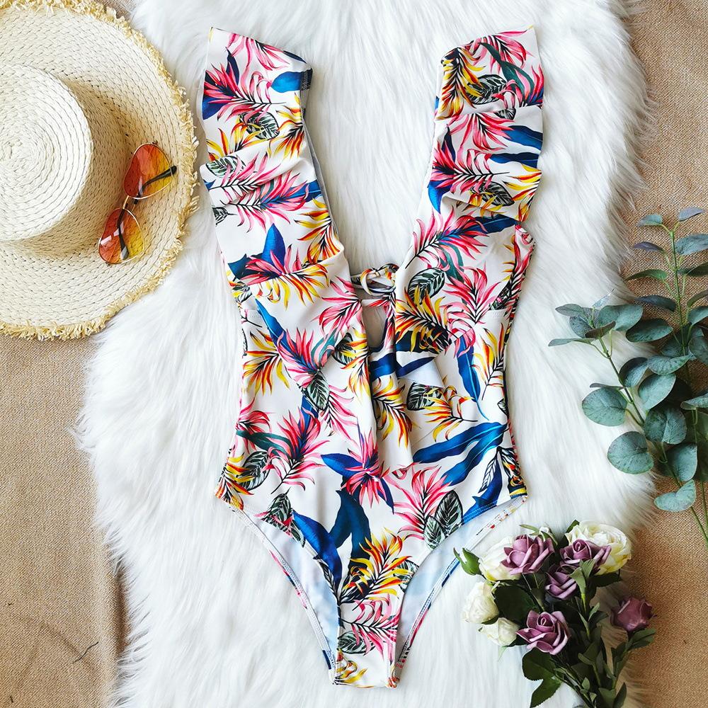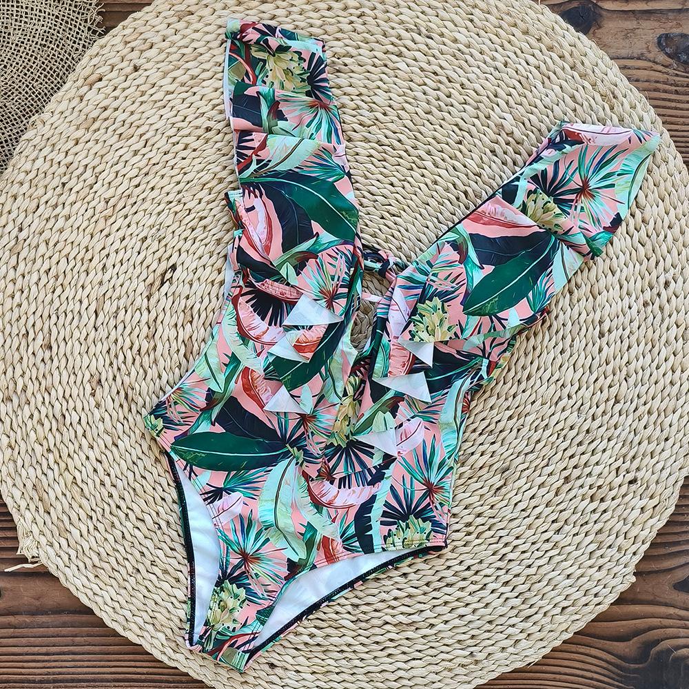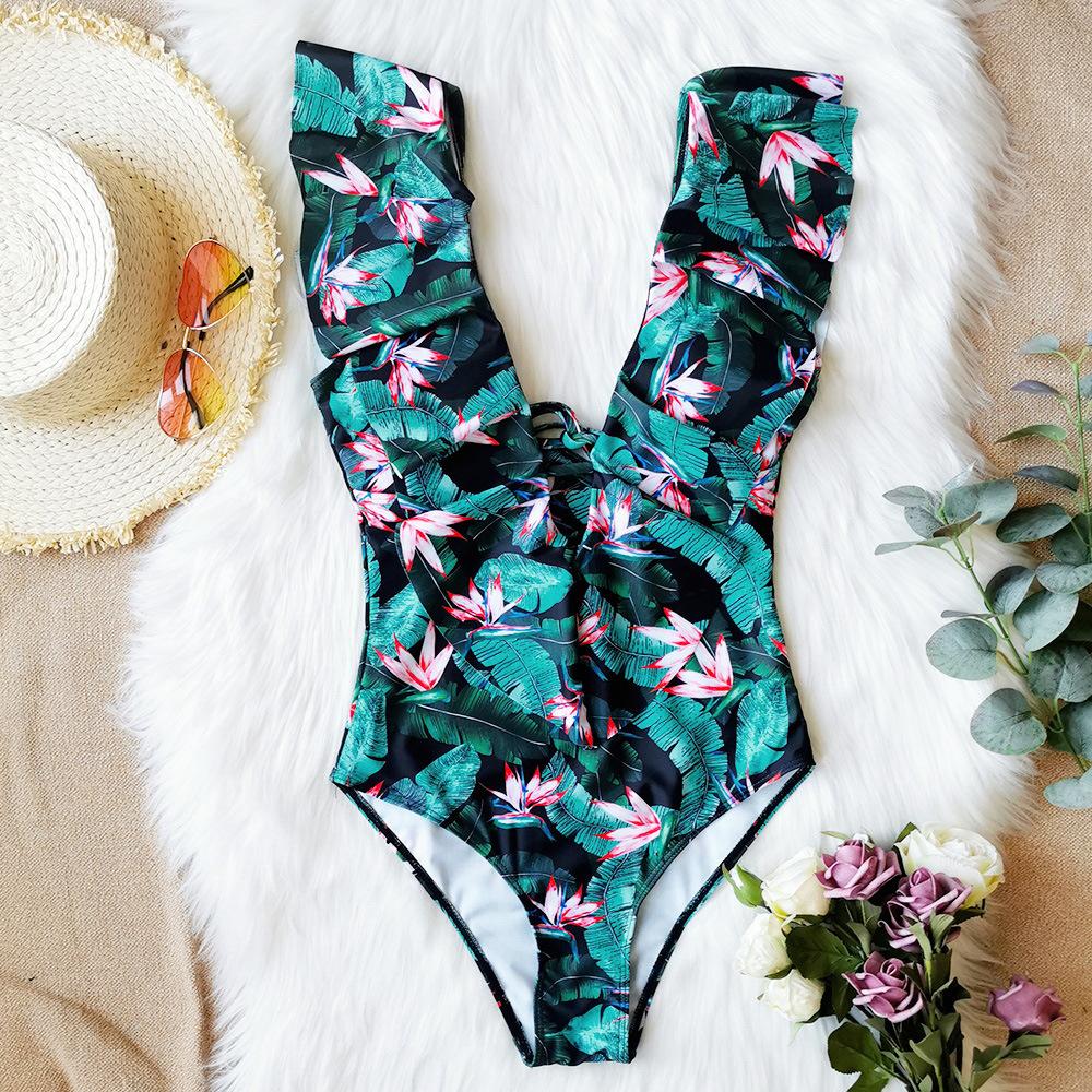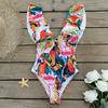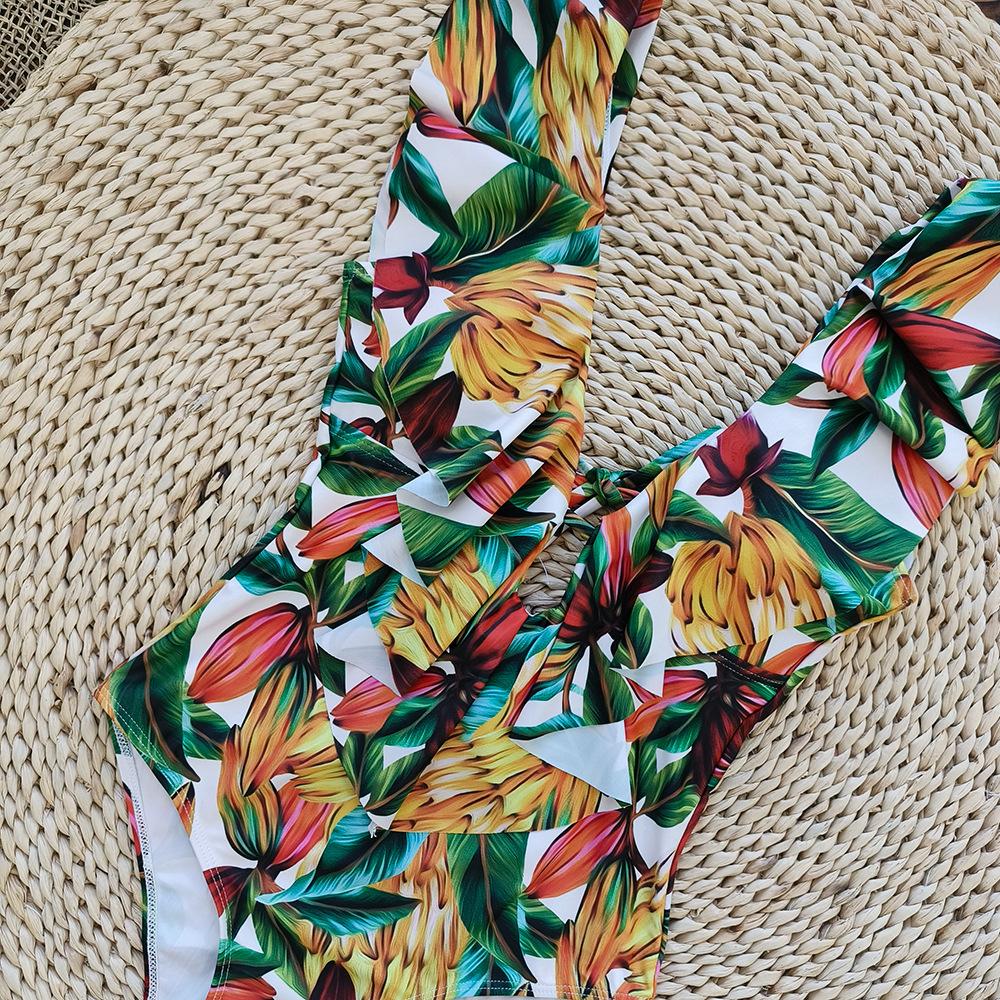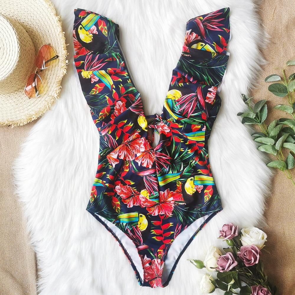 Traje de baño de cuerpo entero con estampado floral europeo y americano con volantes para mujer 2025 Nuevo Comercio Exterior Transfronterizo Sin Espalda Amazon