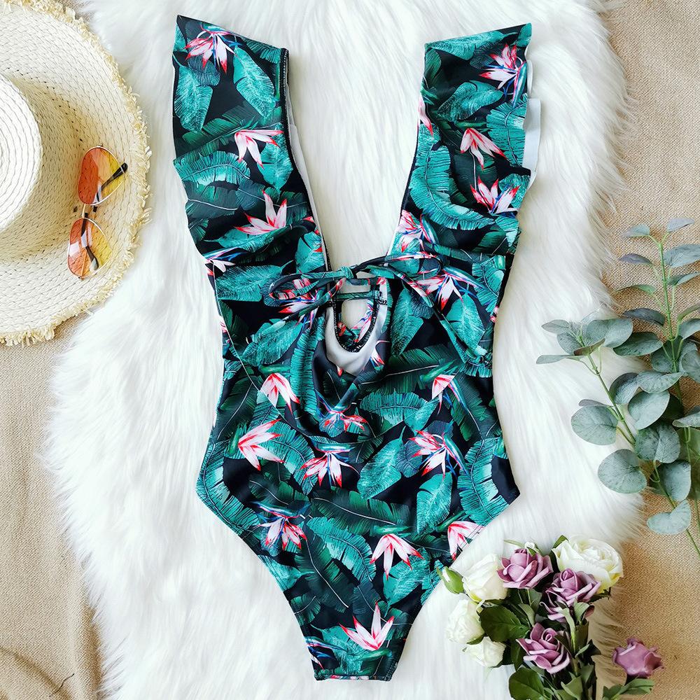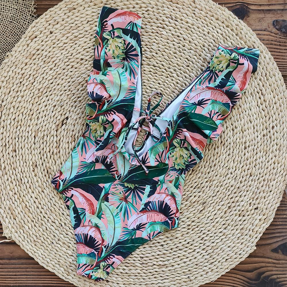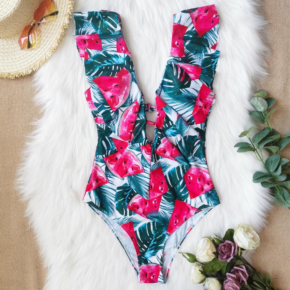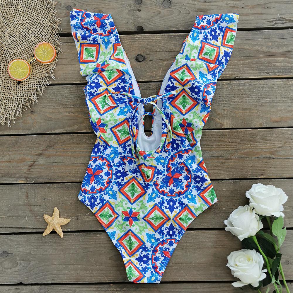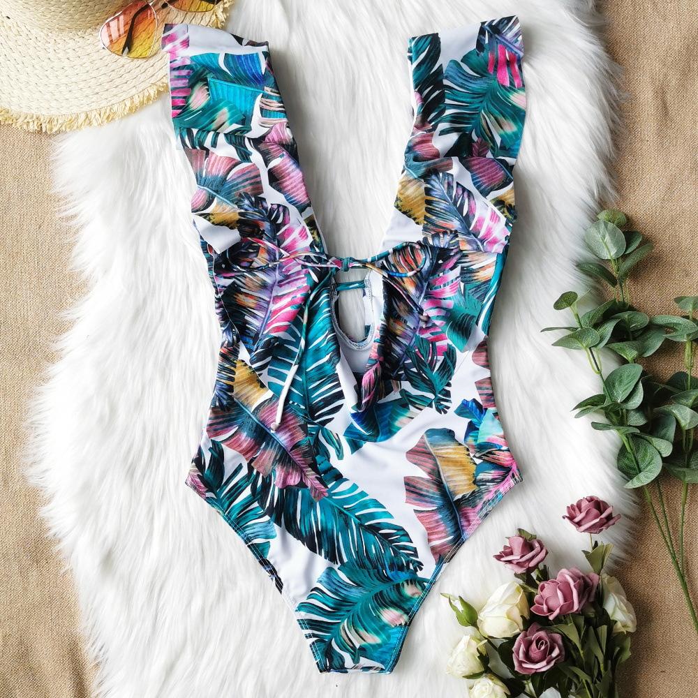 Traje de baño de cuerpo entero con estampado floral europeo y americano con volantes para mujer 2025 Nuevo Comercio Exterior Transfronterizo Sin Espalda Amazon