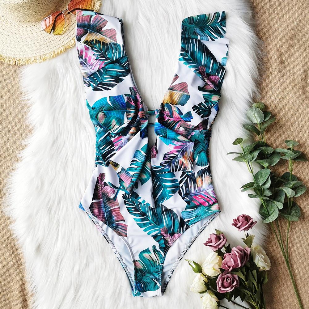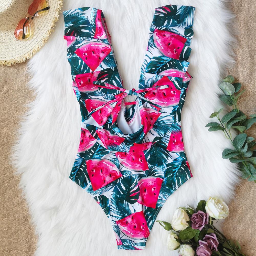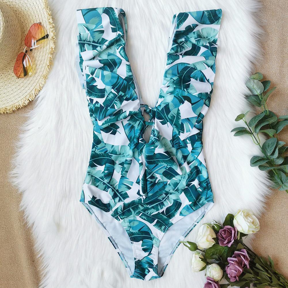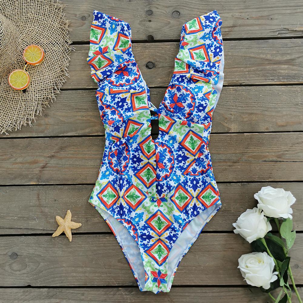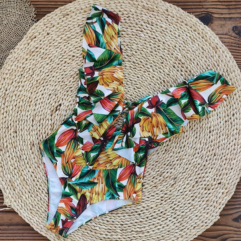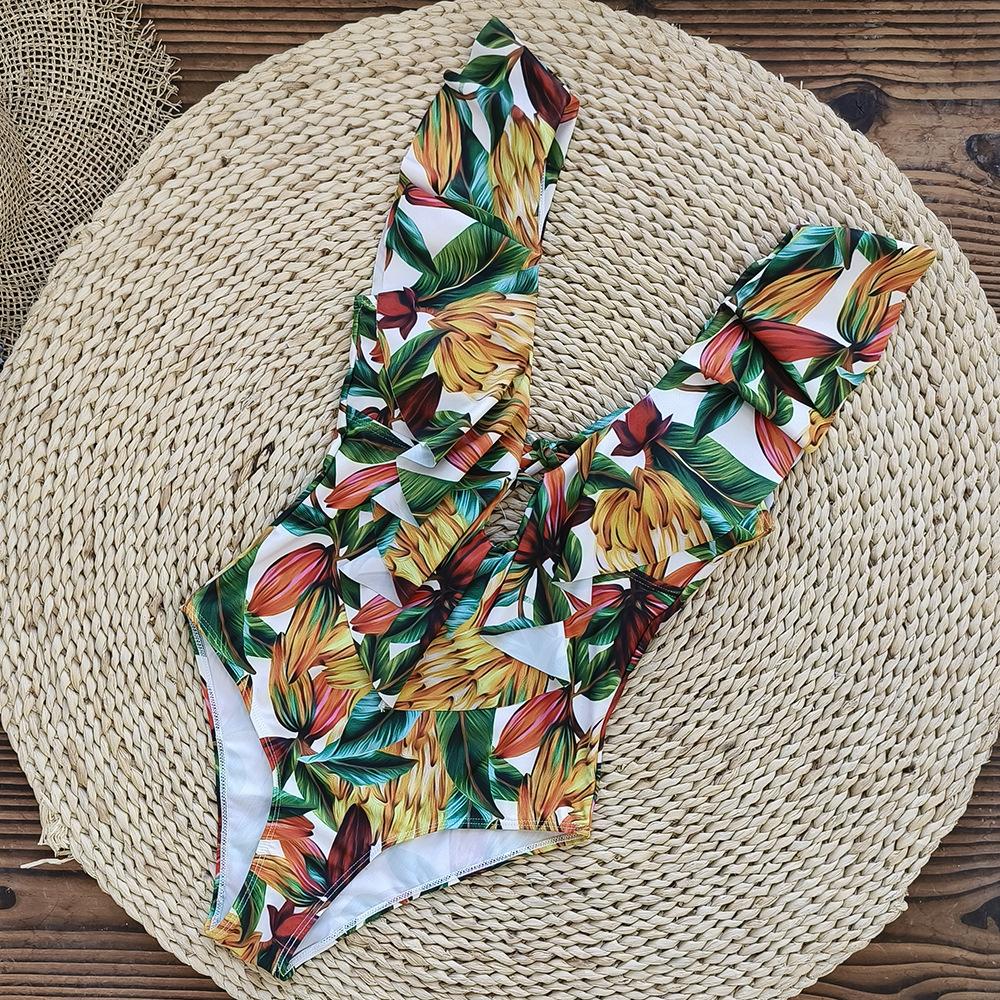 Traje de baño de cuerpo entero con estampado floral europeo y americano con volantes para mujer 2025 Nuevo Comercio Exterior Transfronterizo Sin Espalda Amazon