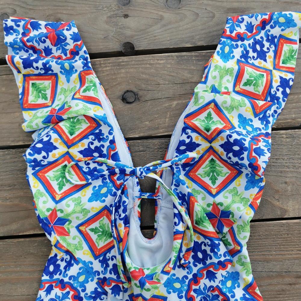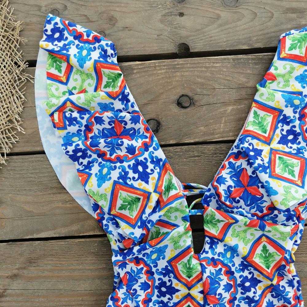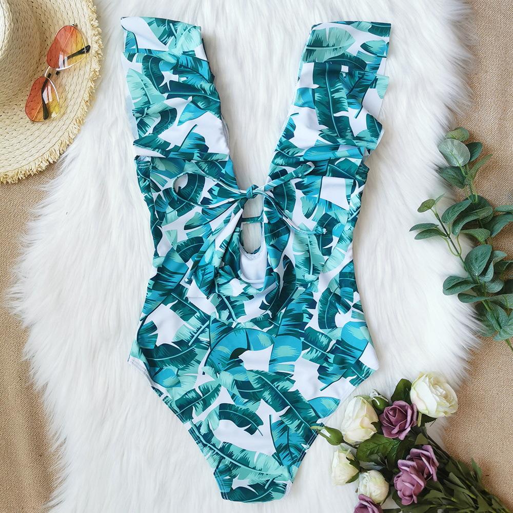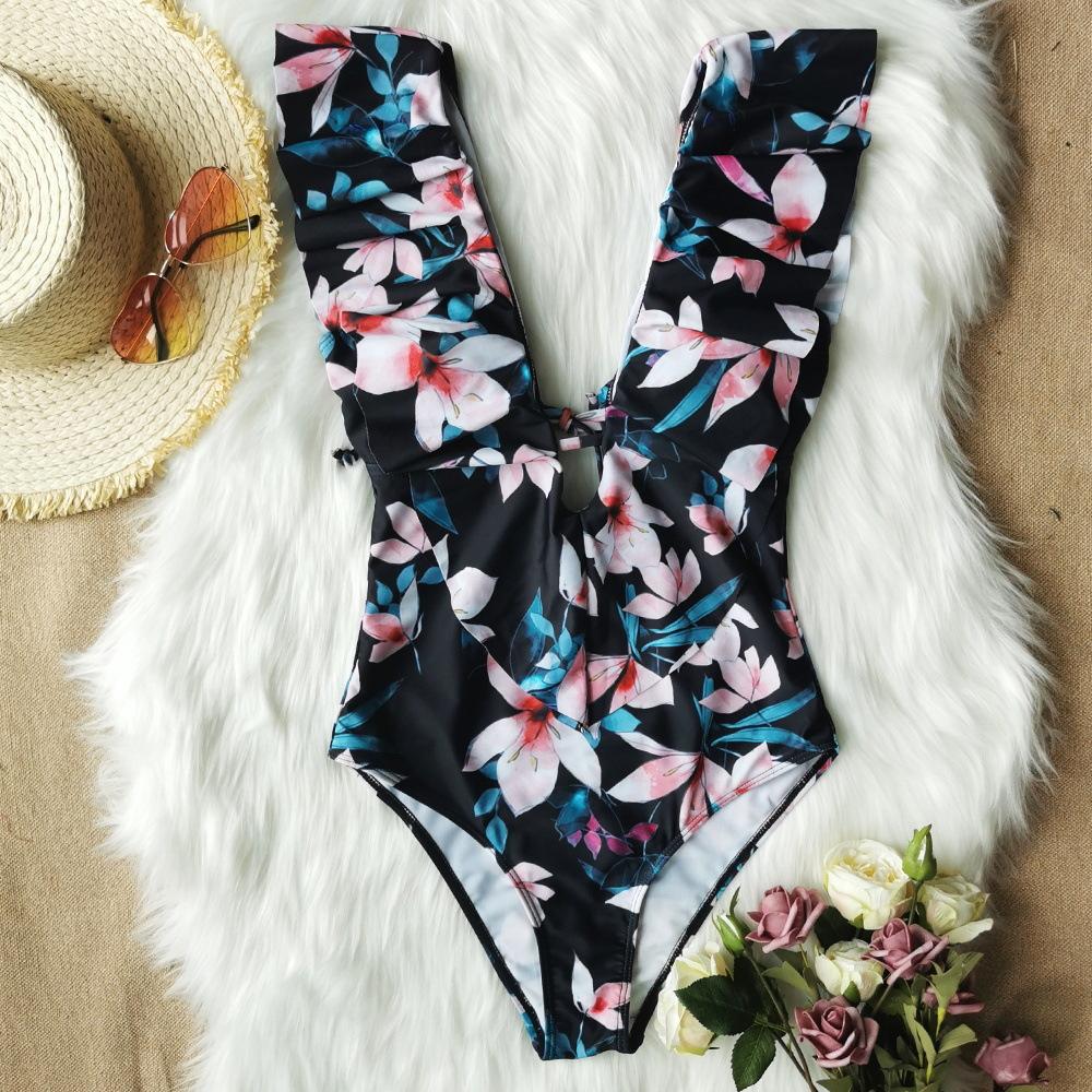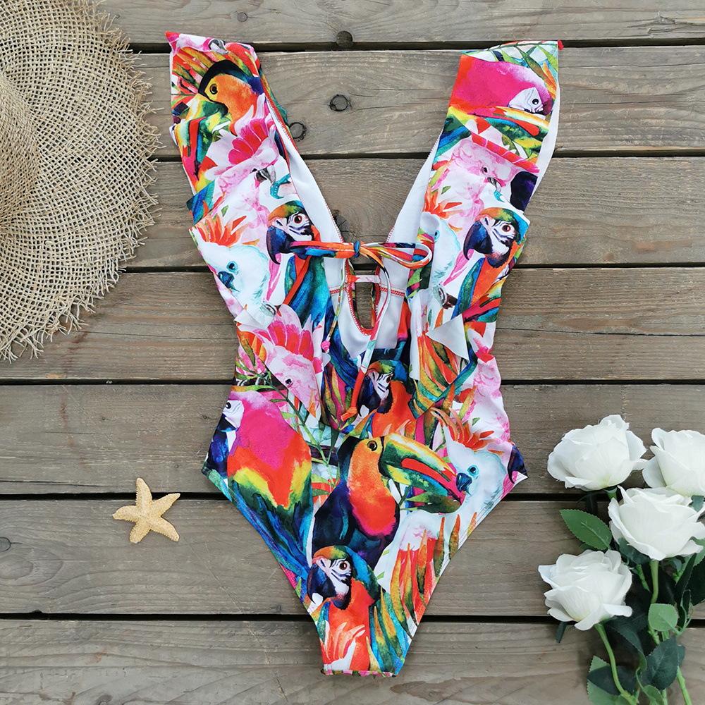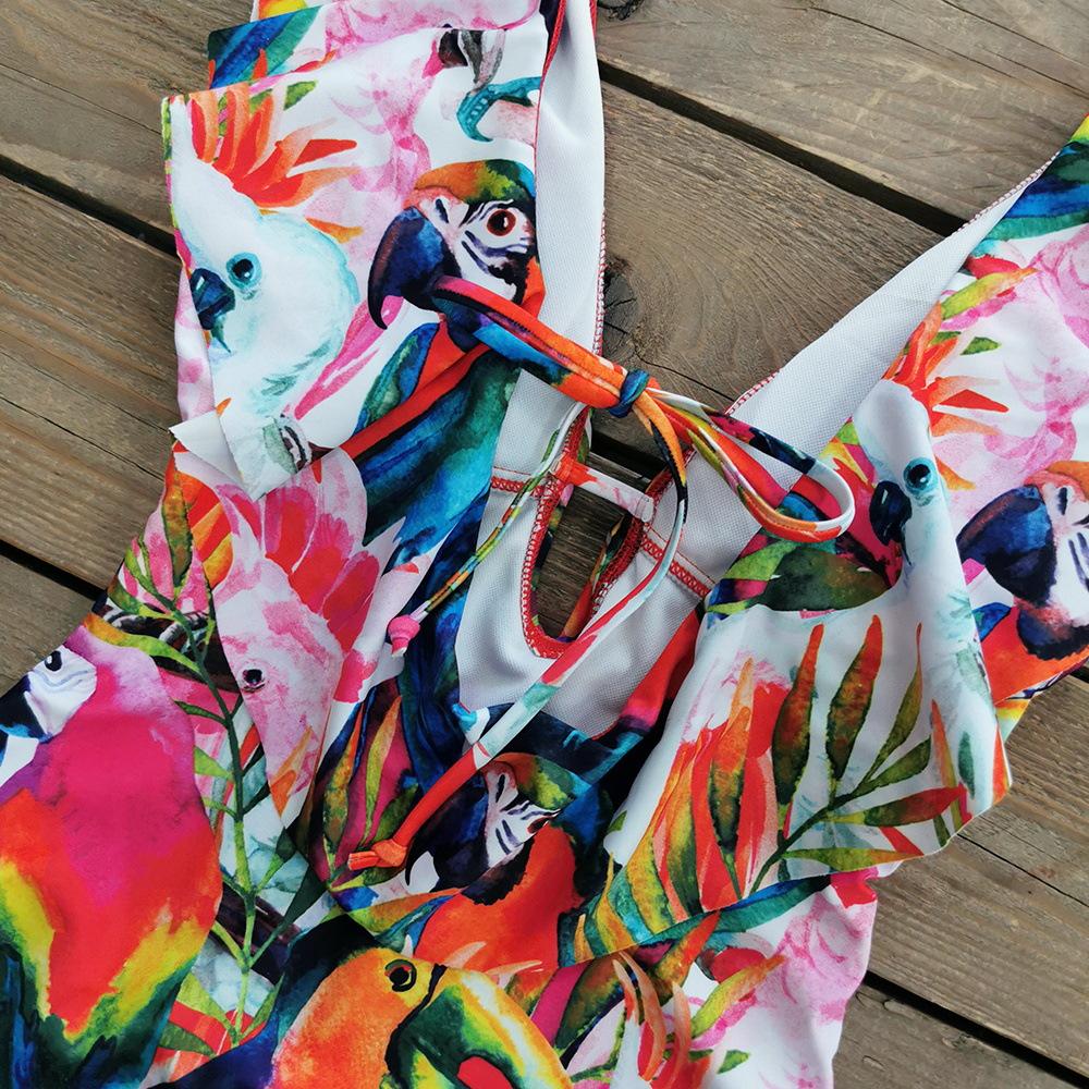 Traje de baño de cuerpo entero con estampado floral europeo y americano con volantes para mujer 2025 Nuevo Comercio Exterior Transfronterizo Sin Espalda Amazon