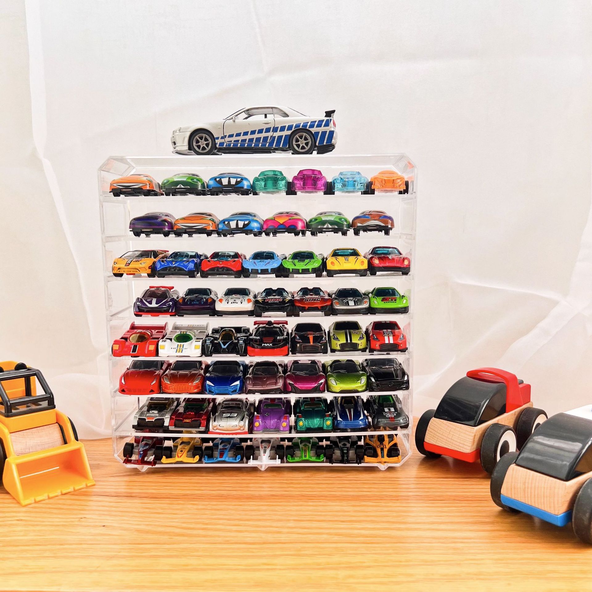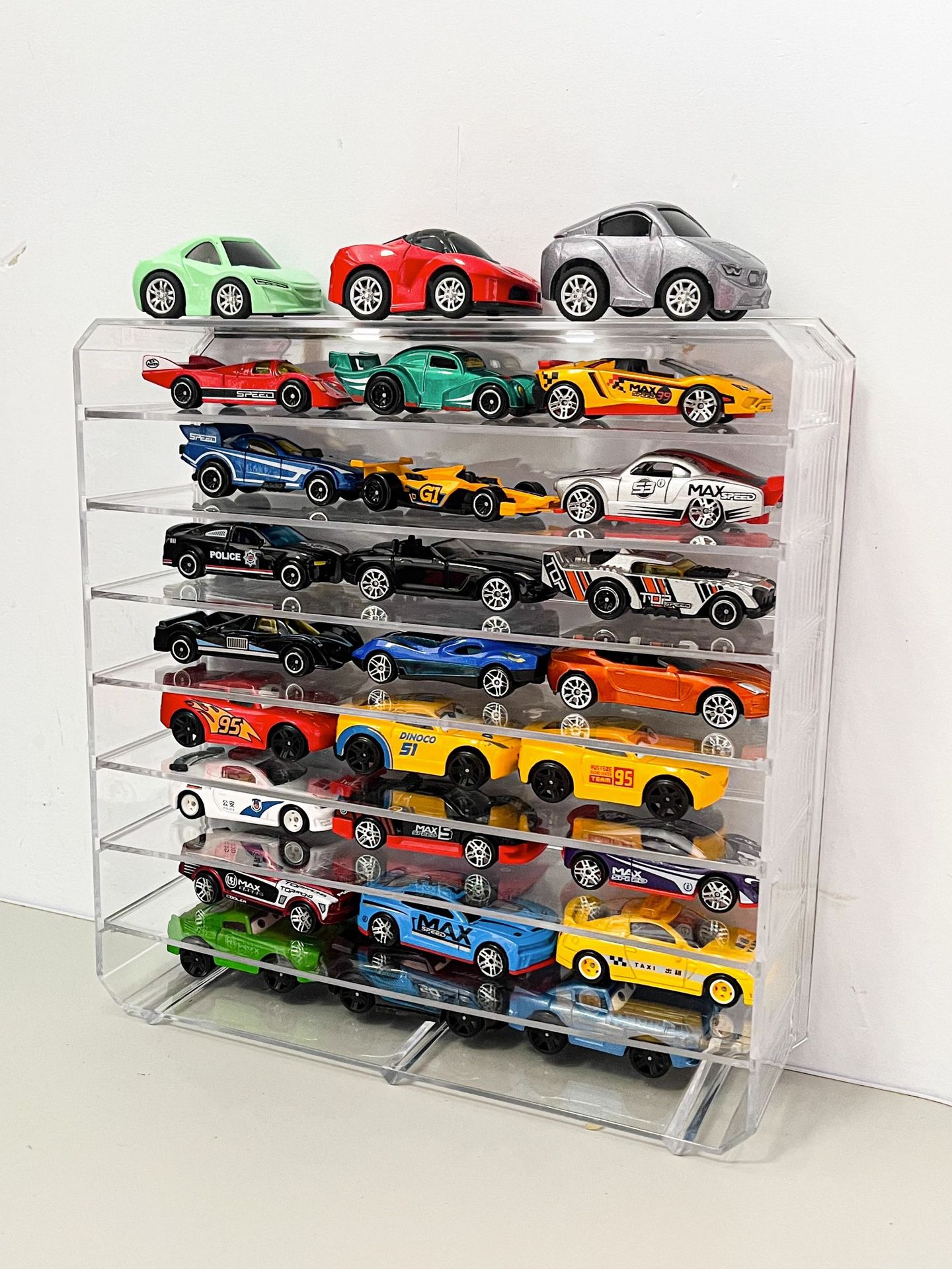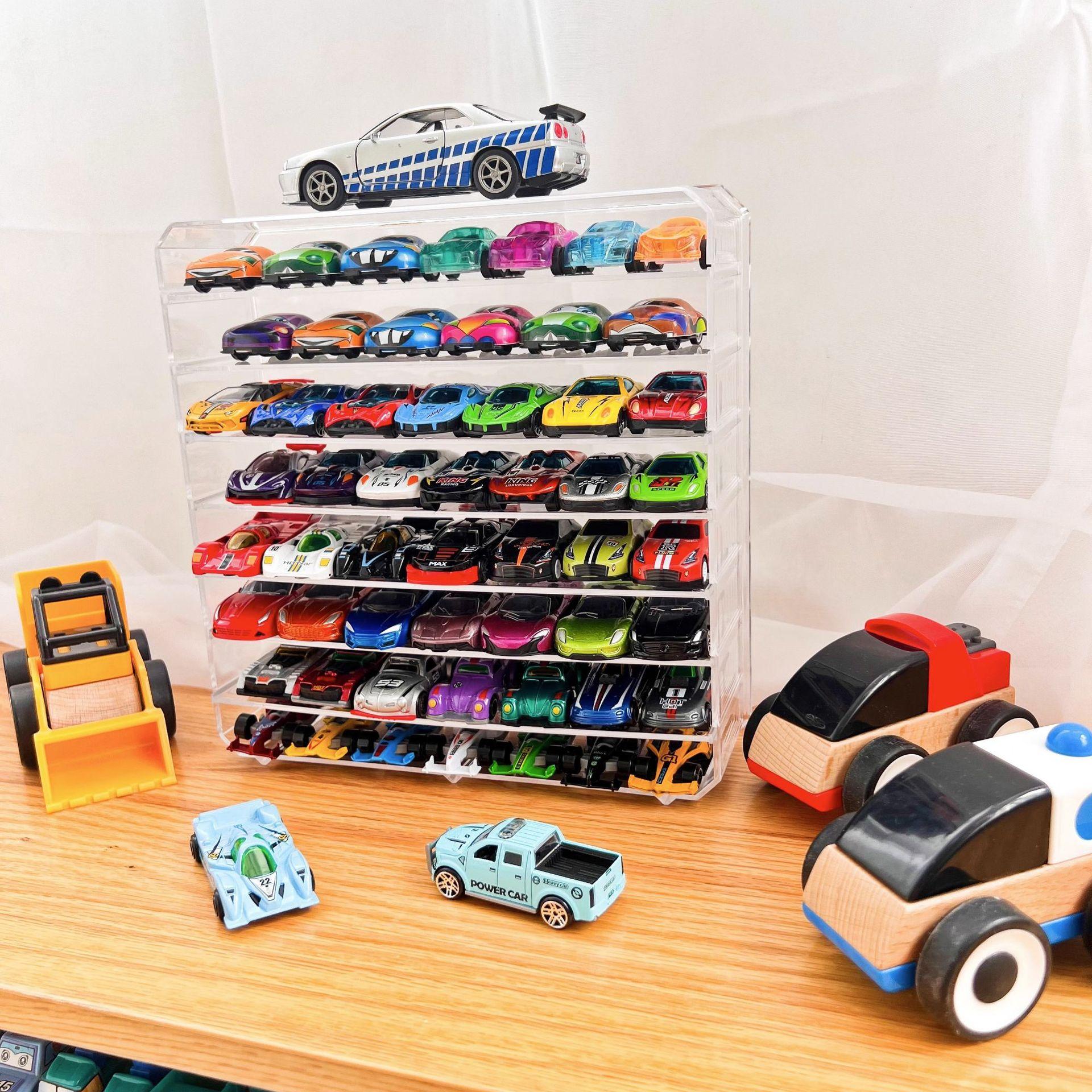 Modelo de Coche de Juguete Caja de Almacenamiento Transparente Coche de Aleación para Niños Partición Multicapa Estante de Almacenamiento de Escritorio Ajustable