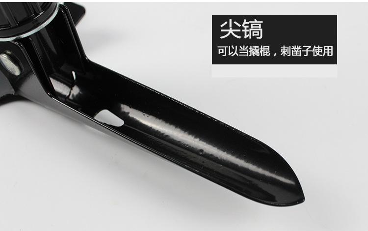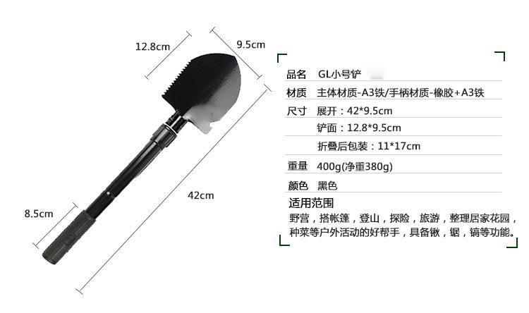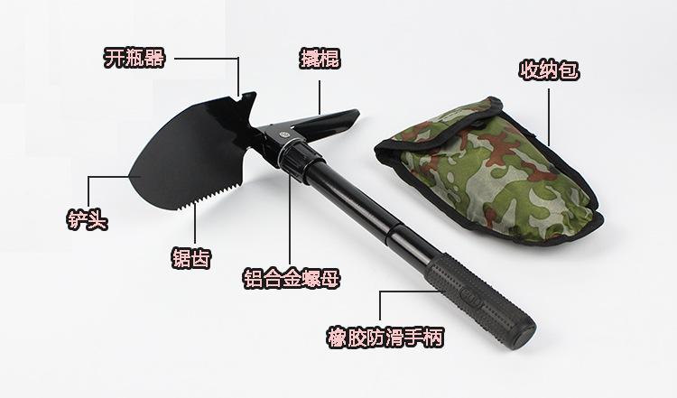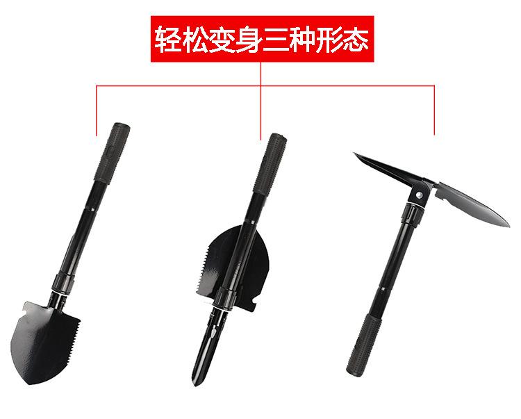 Características: Plegable, tamaño pequeño, fácil de transportar. Cuando se despliega, un extremo es una pala y el otro extremo es un pico. Flexible y plegable, el mango puede ser horizontal o vertical, es un artículo común para actividades de camping al aire libre