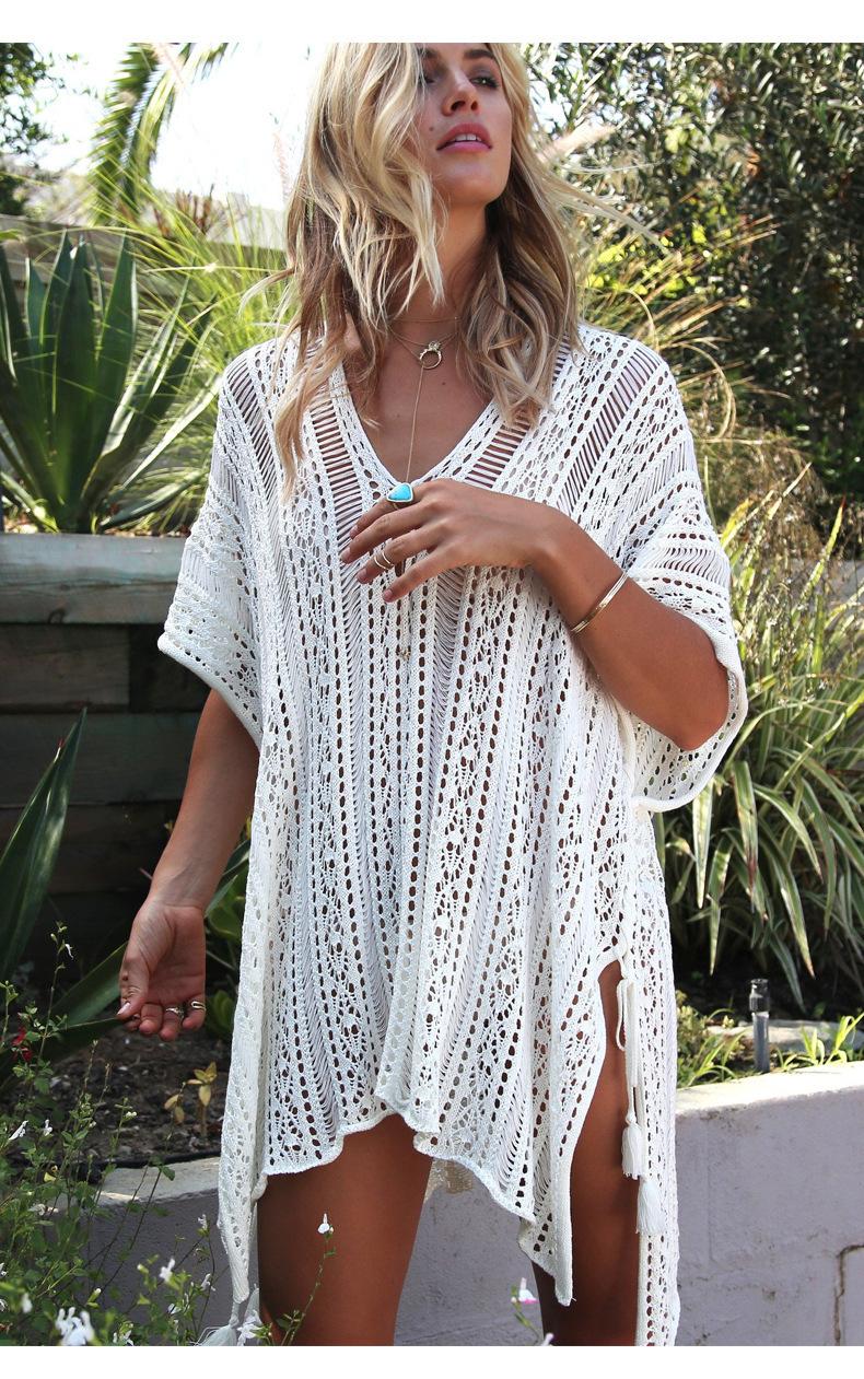 Traje de Baño Tejido Calado de Color Sólido Transfronterizo para Mujer Cubre Traje de Baño Ropa de Playa Exterior Camisa de Protección Solar Cubre Bikini Sombrilla