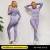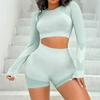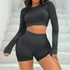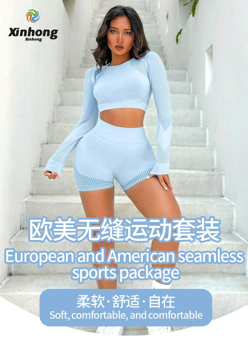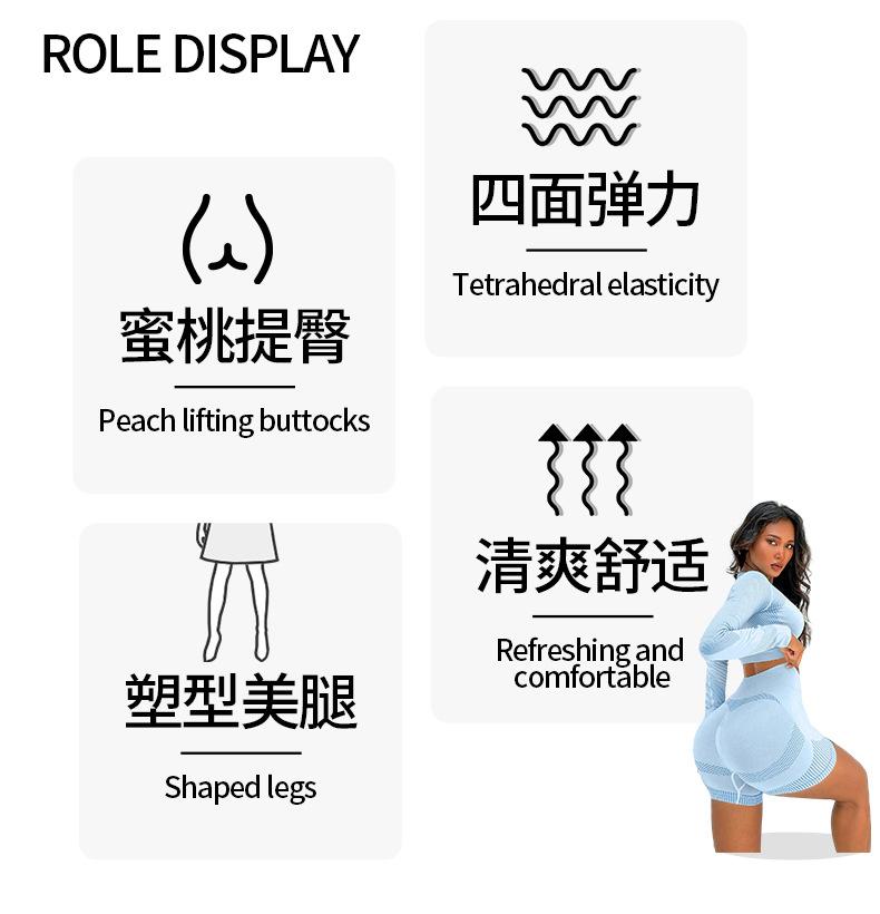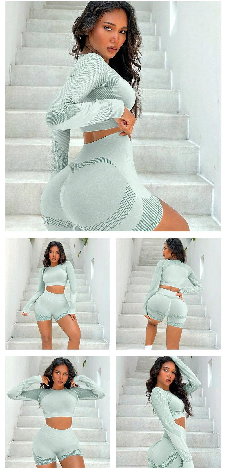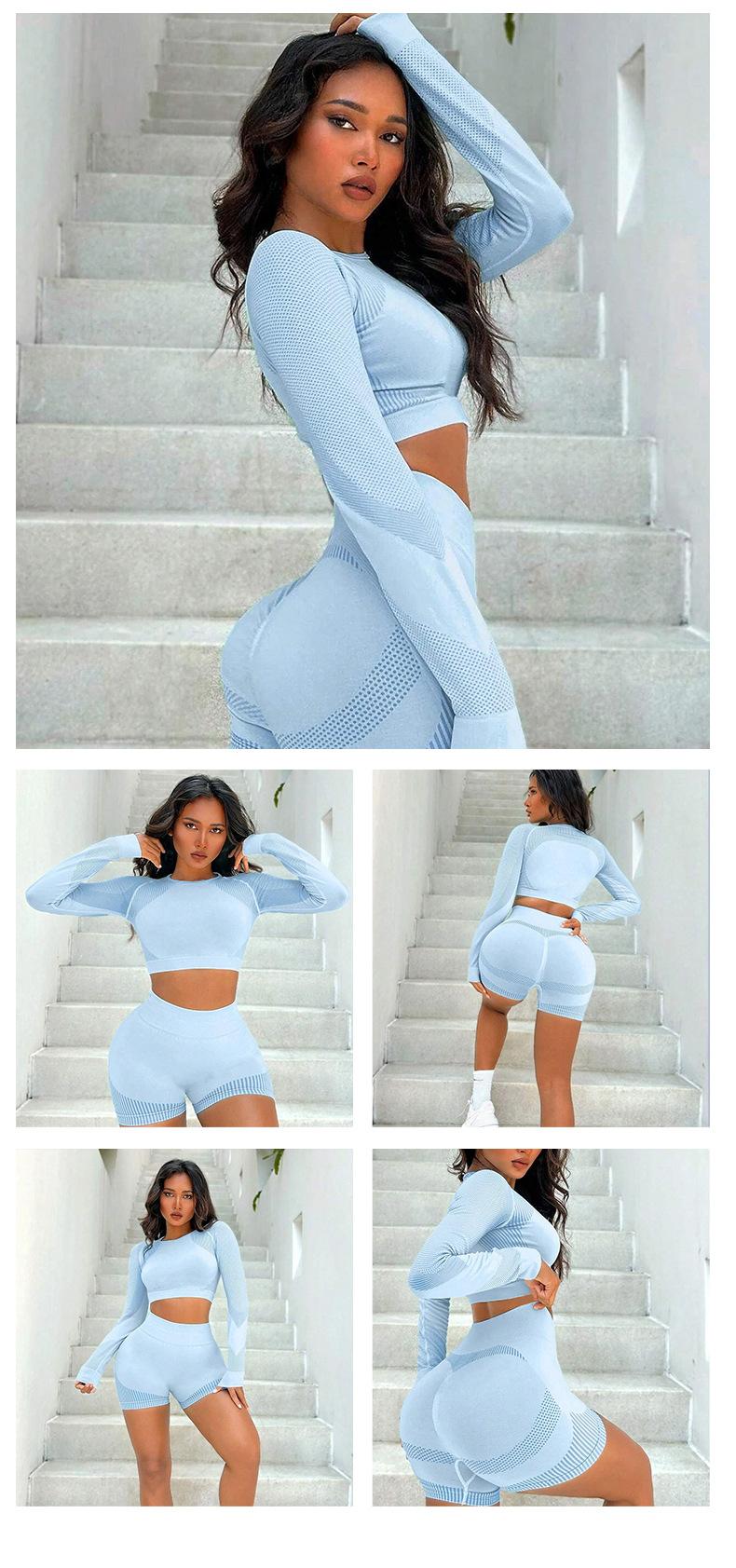 Traje de fitness sin costuras transfronterizo europeo y americano, color melocotón, cintura alta, fitness, manga larga, pantalones cortos deportivos de yoga de tres puntos, traje para mujer