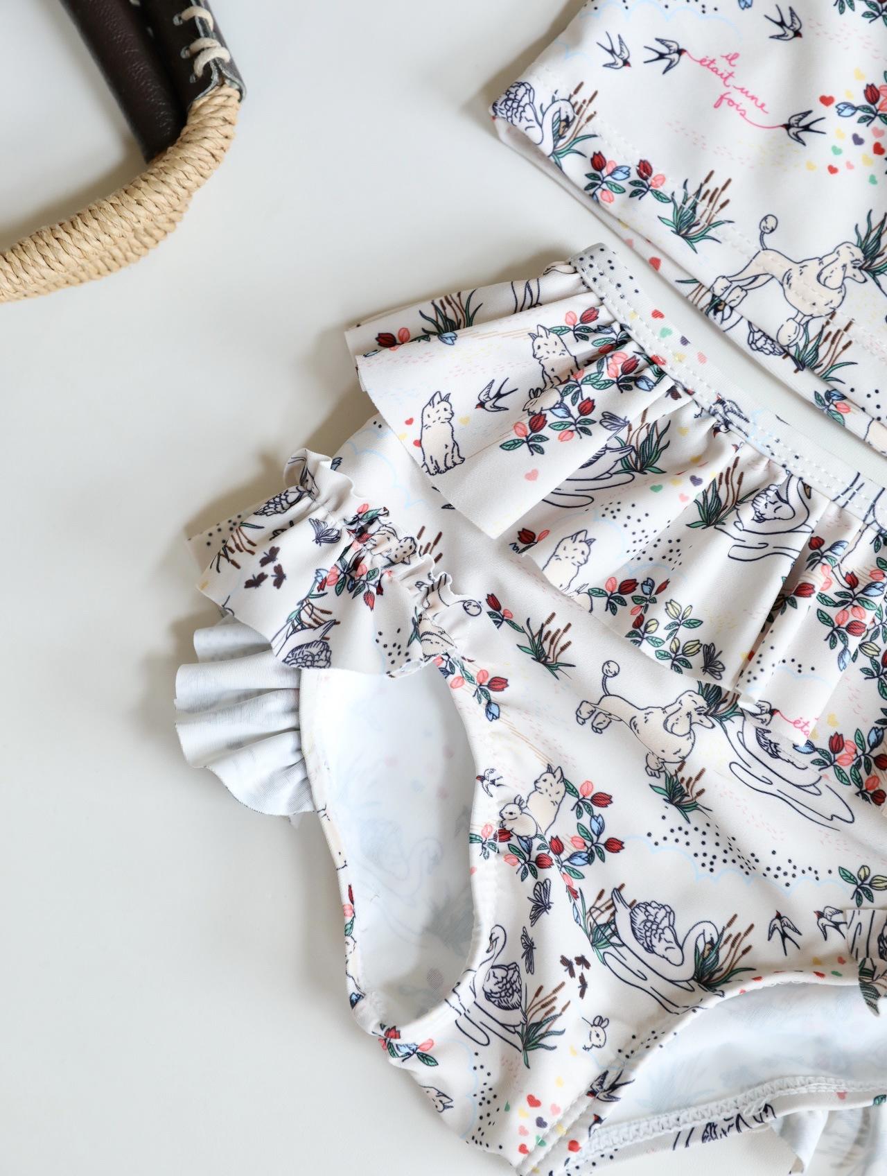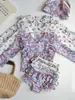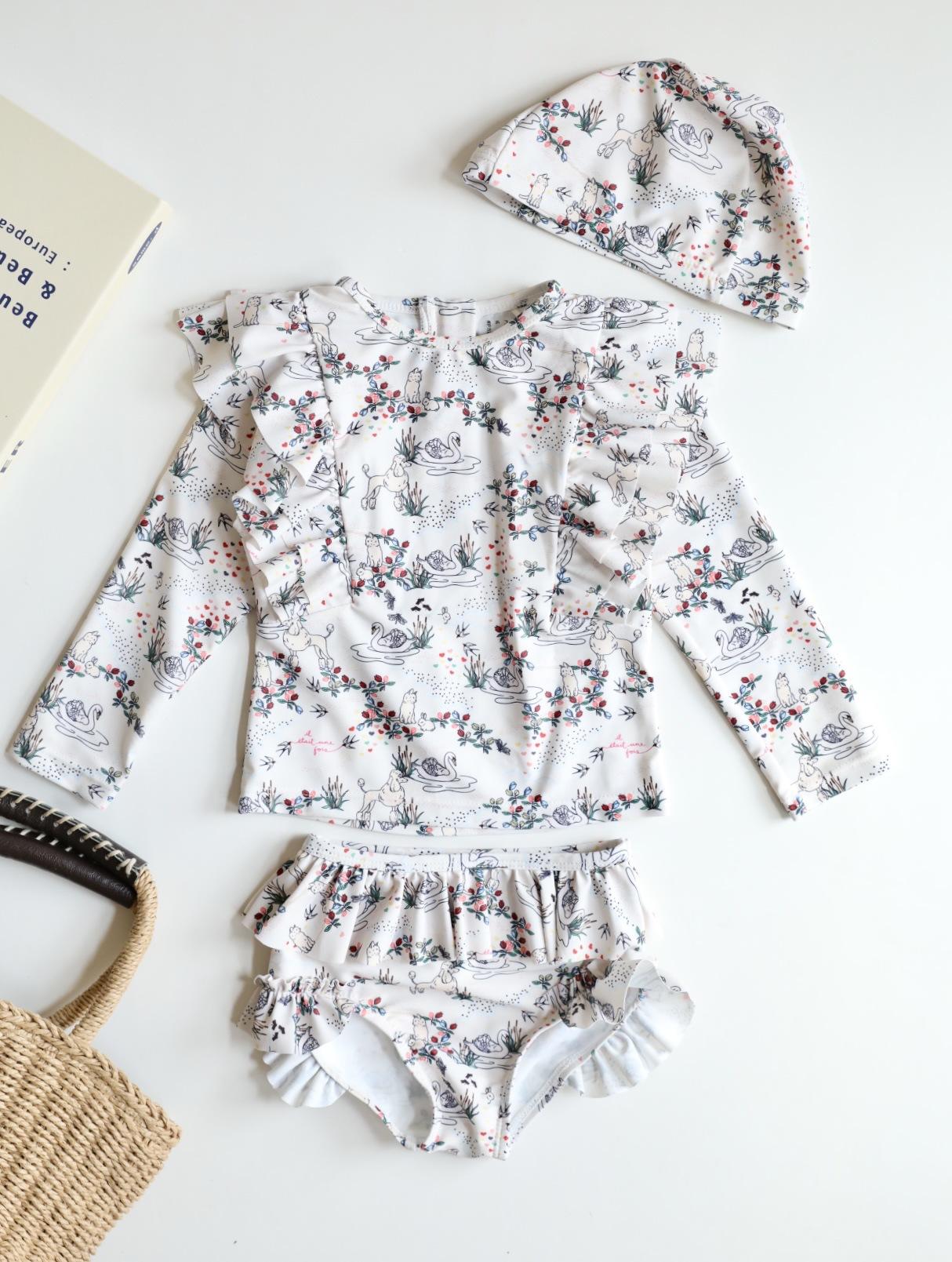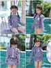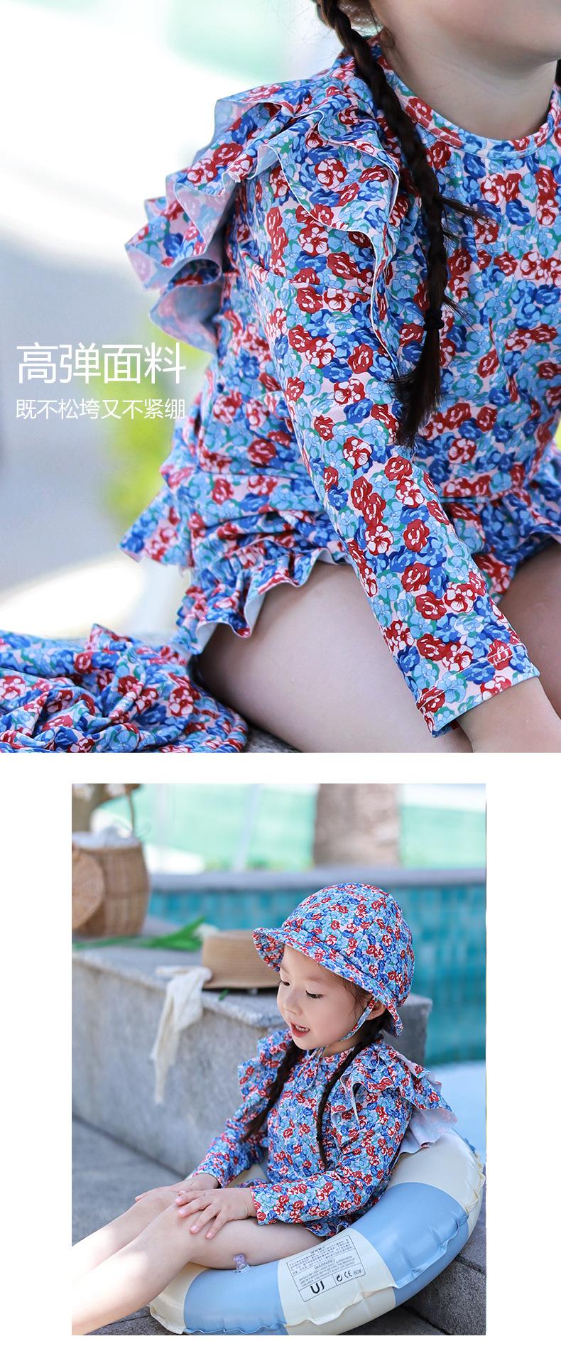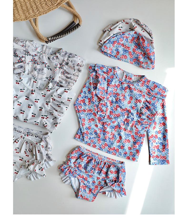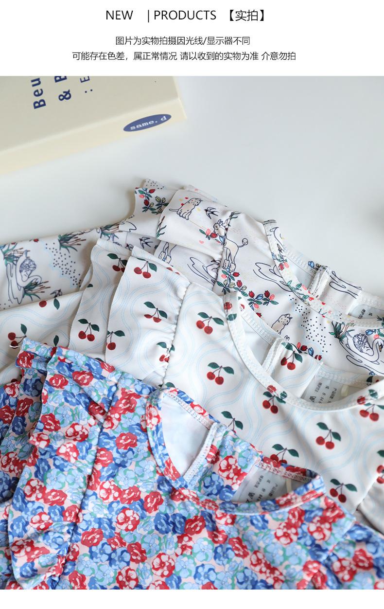 Traje de baño dividido de verano para niñas 2025, nuevo estilo Ins, traje de baño de manga larga con protección solar para bebés, traje de baño de encaje para niñas.