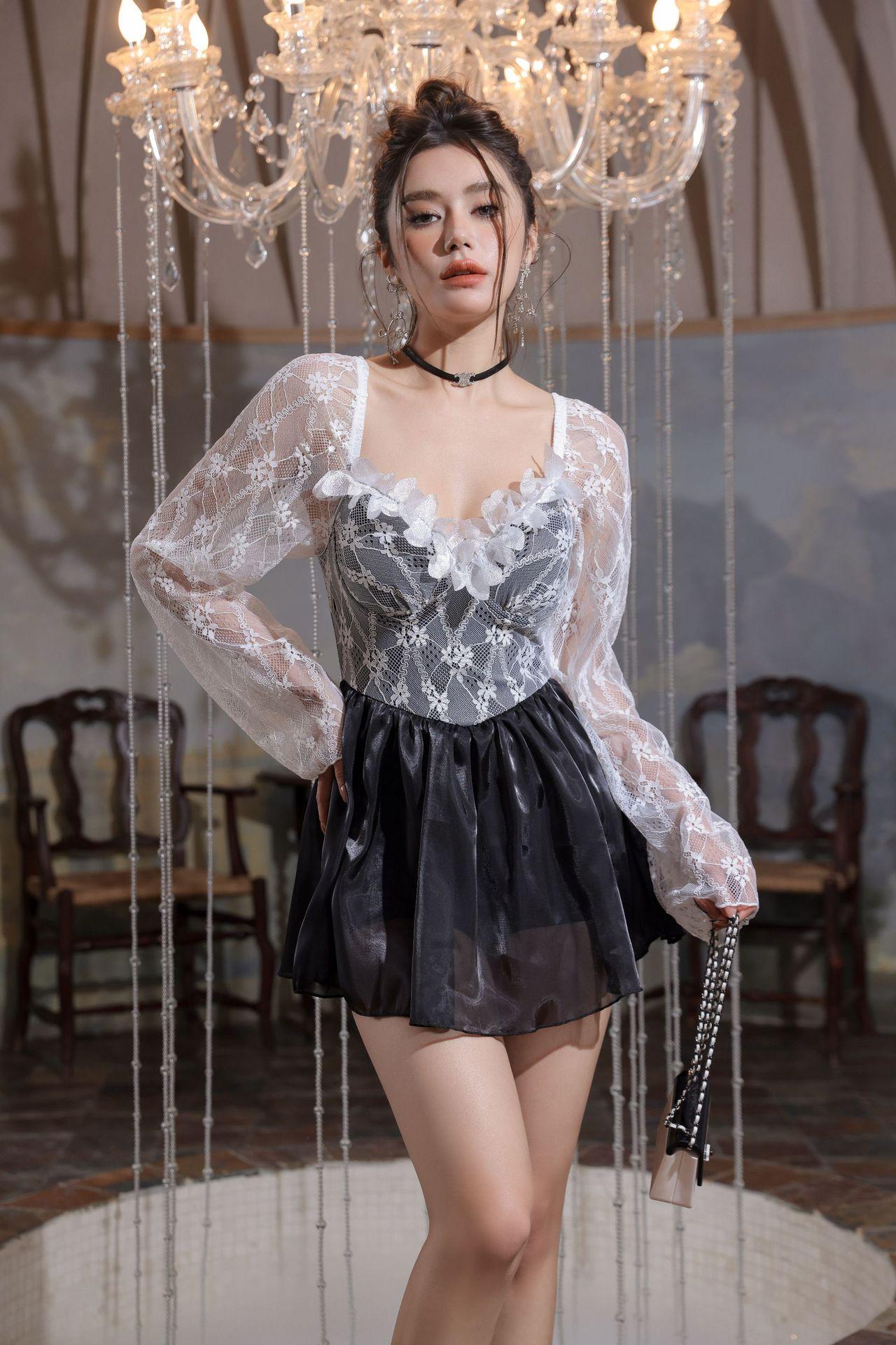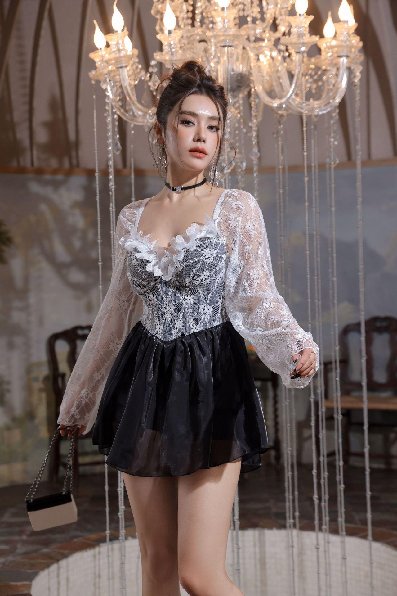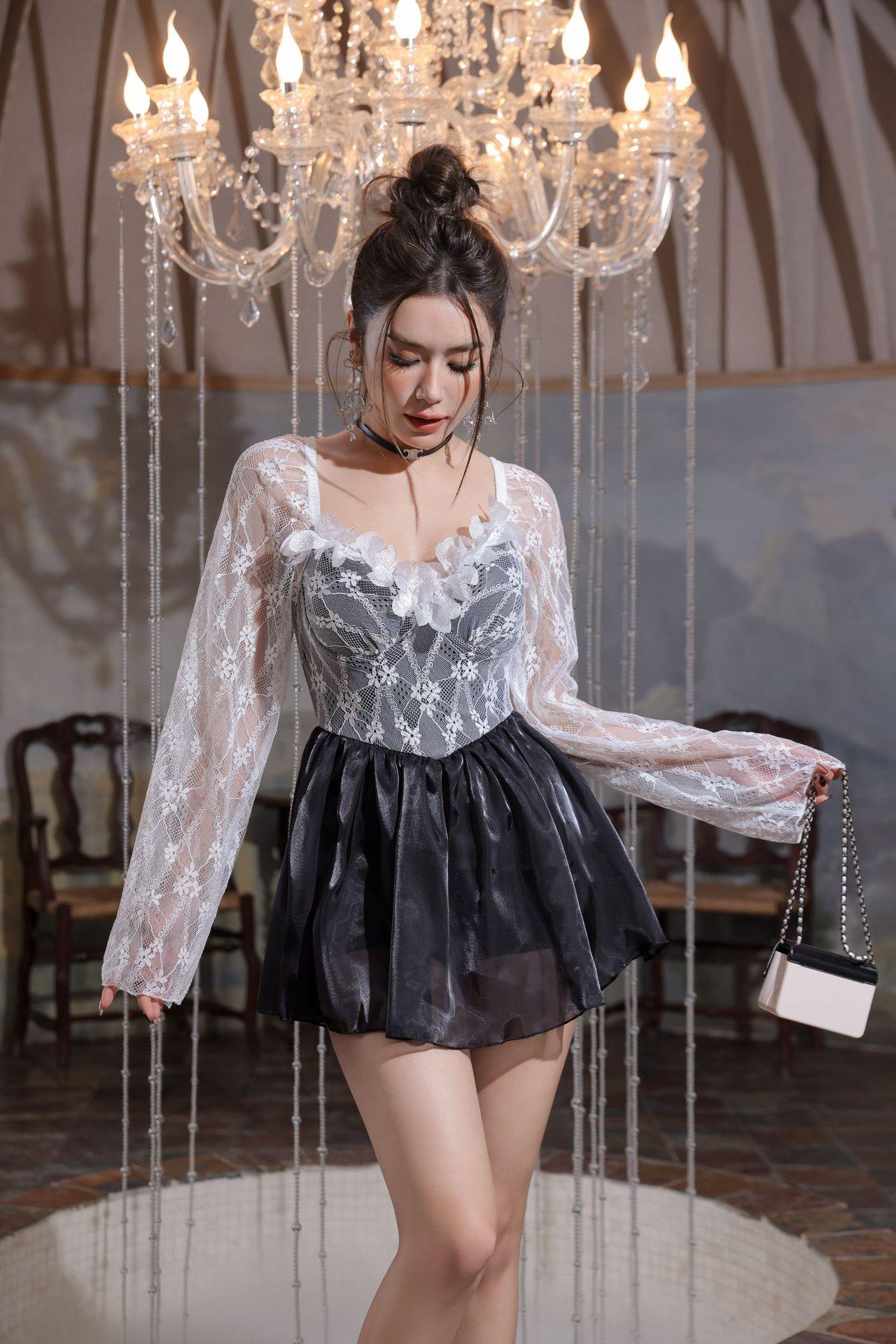 Traje de Baño Estudiante 2024 Nuevo Explosiones Pecho Pequeño Una Pieza Cubre Vientre Adelgazante Conservador Aguas Termales Traje de Baño Manga Larga