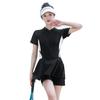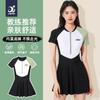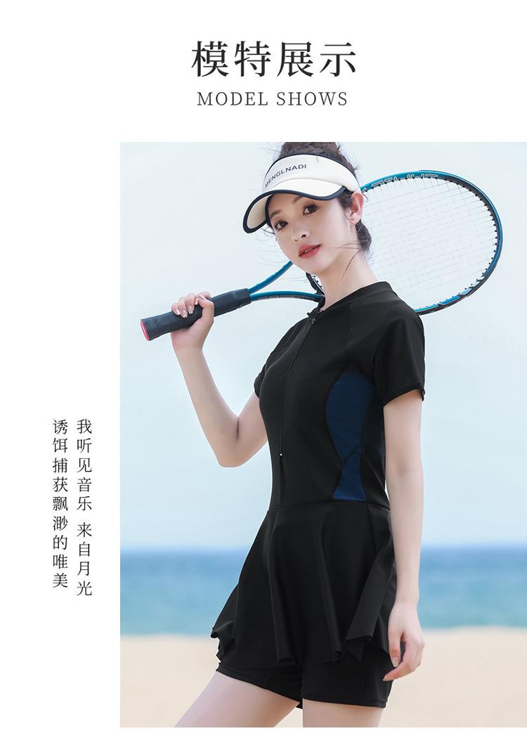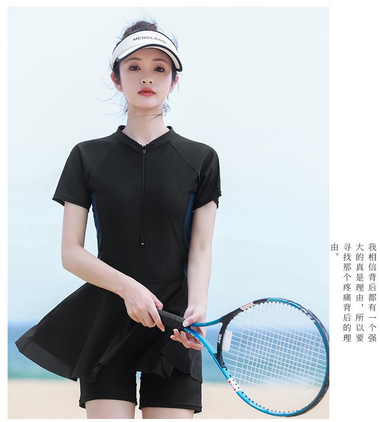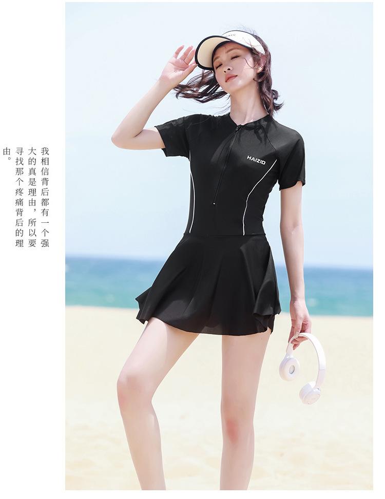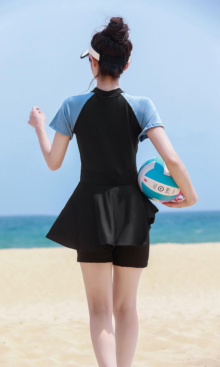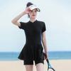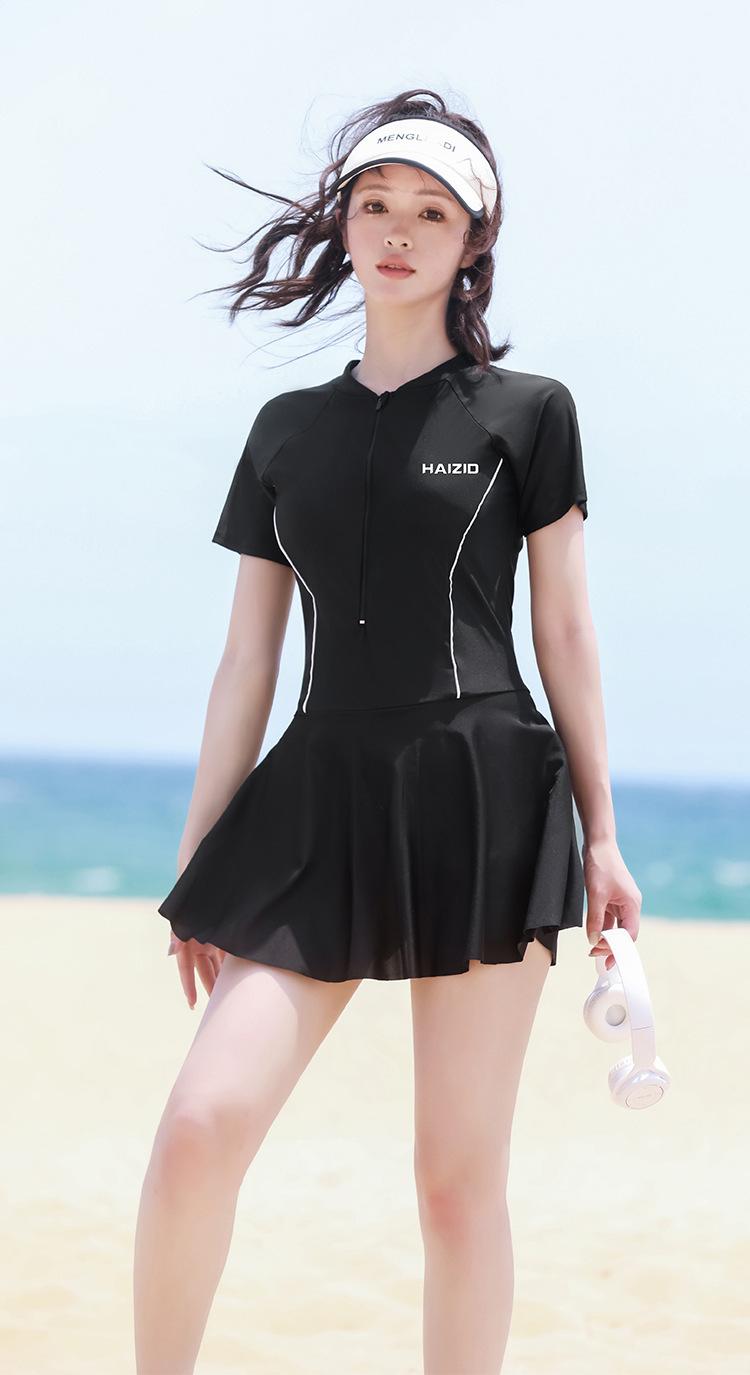 Traje de baño de una pieza de manga corta conservador para vacaciones deportivas de natación que cubre el vientre y muestra una falda fina de cintura alta para aguas termales para mujeres