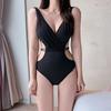 Traje de baño de una pieza negro sexy sin espalda Source Factory 2023, bikini de cintura alta adelgazante para mujer