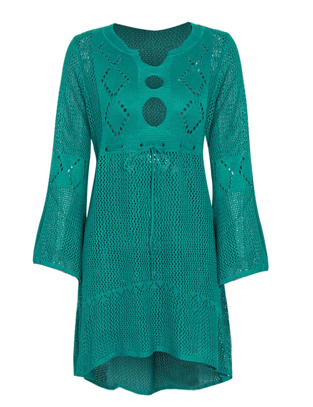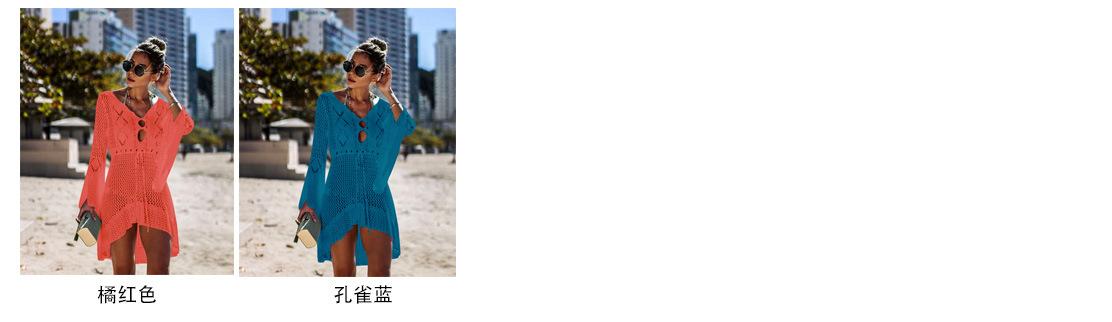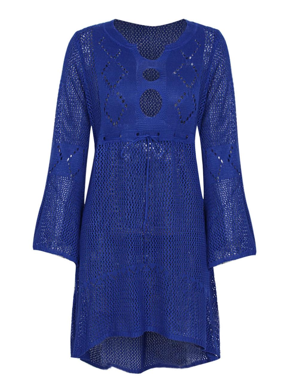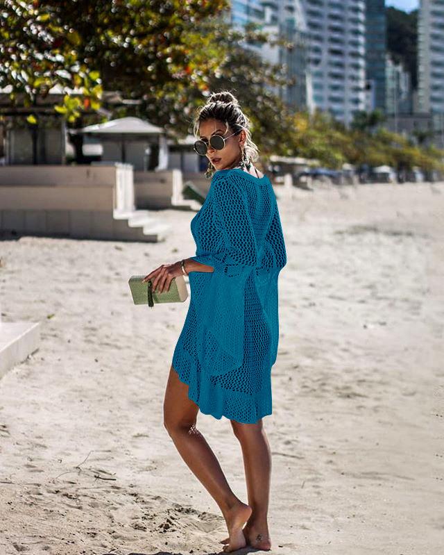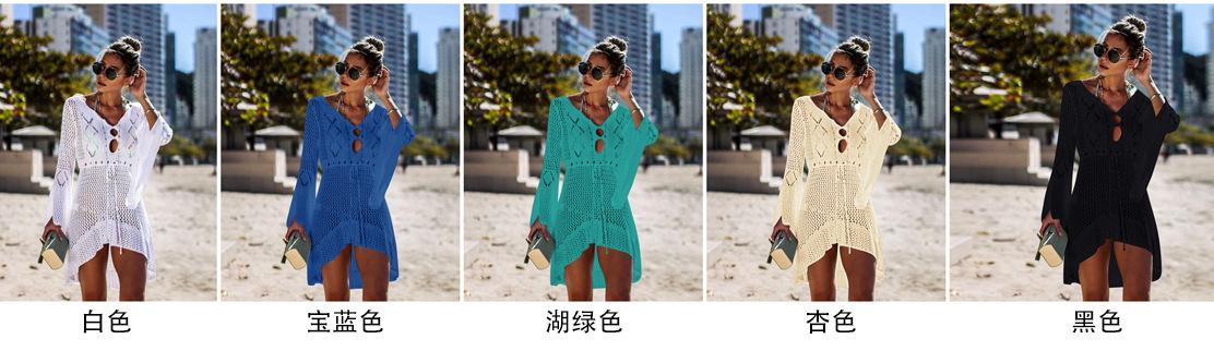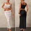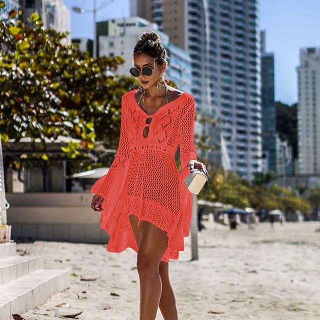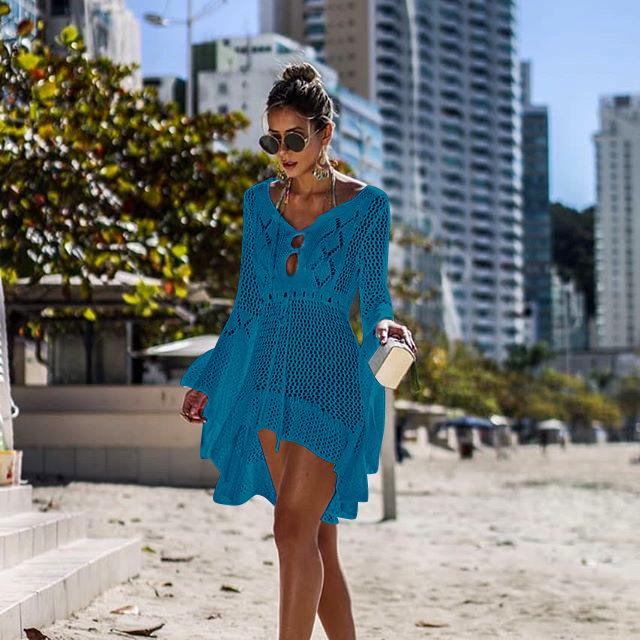 Suéter de vacaciones para cubrir bikini, estilo europeo y americano, falda de malla con hombros descubiertos de punto hueco, falda de playa, camisa de protección solar para mujer