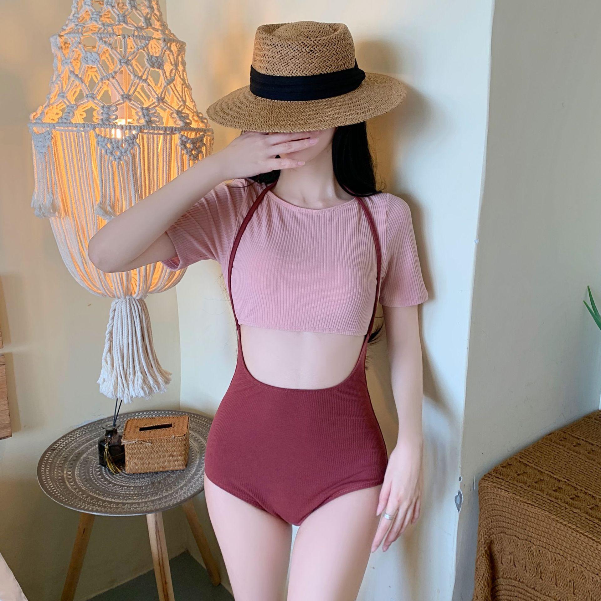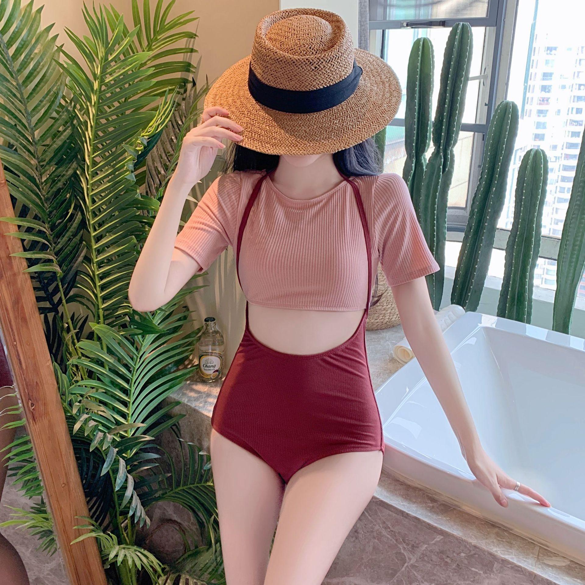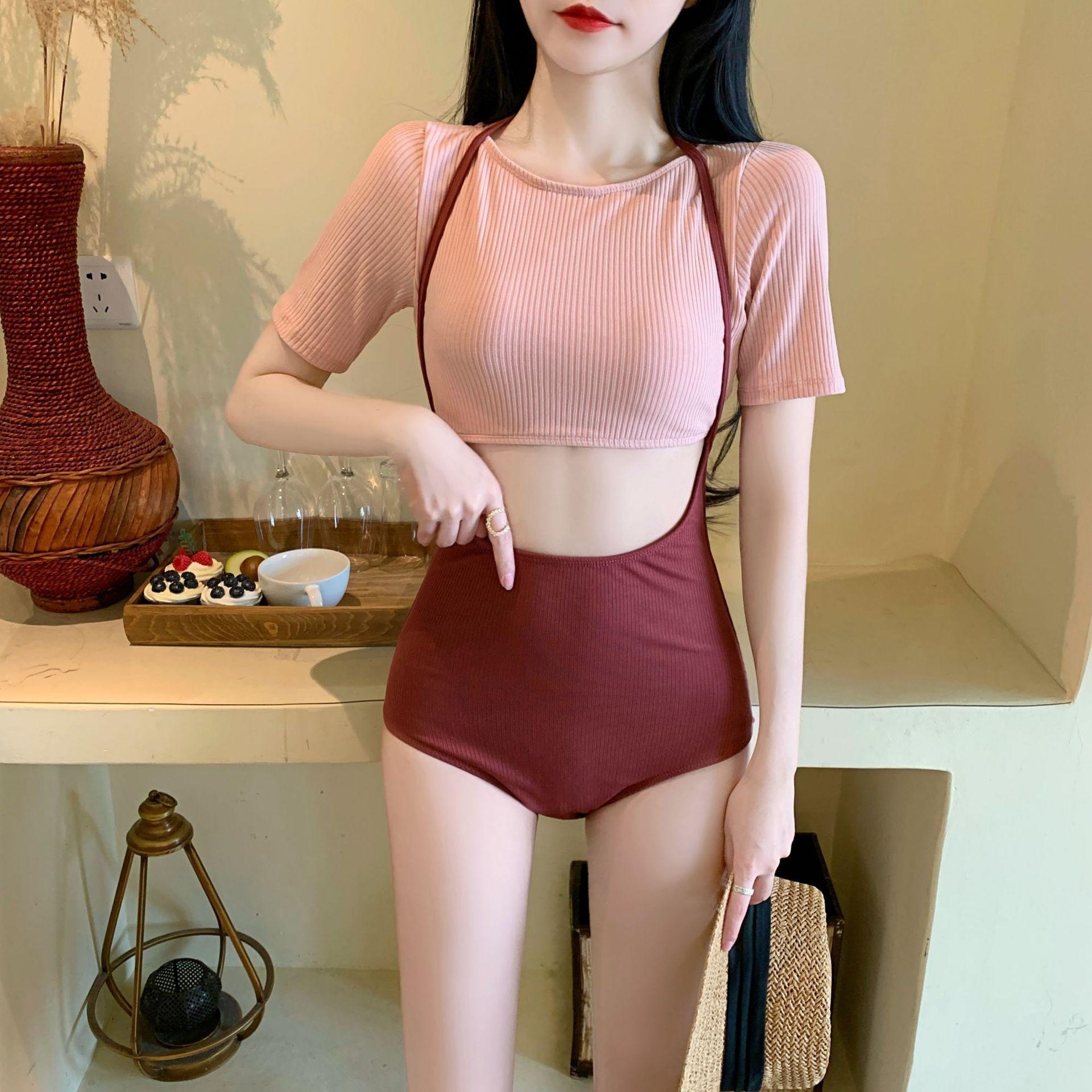 Traje de baño nuevo de fábrica para mujer, moda, combinación de colores, manga media, conservador, adelgazante, cintura alta, aguas termales, estudiante fresca