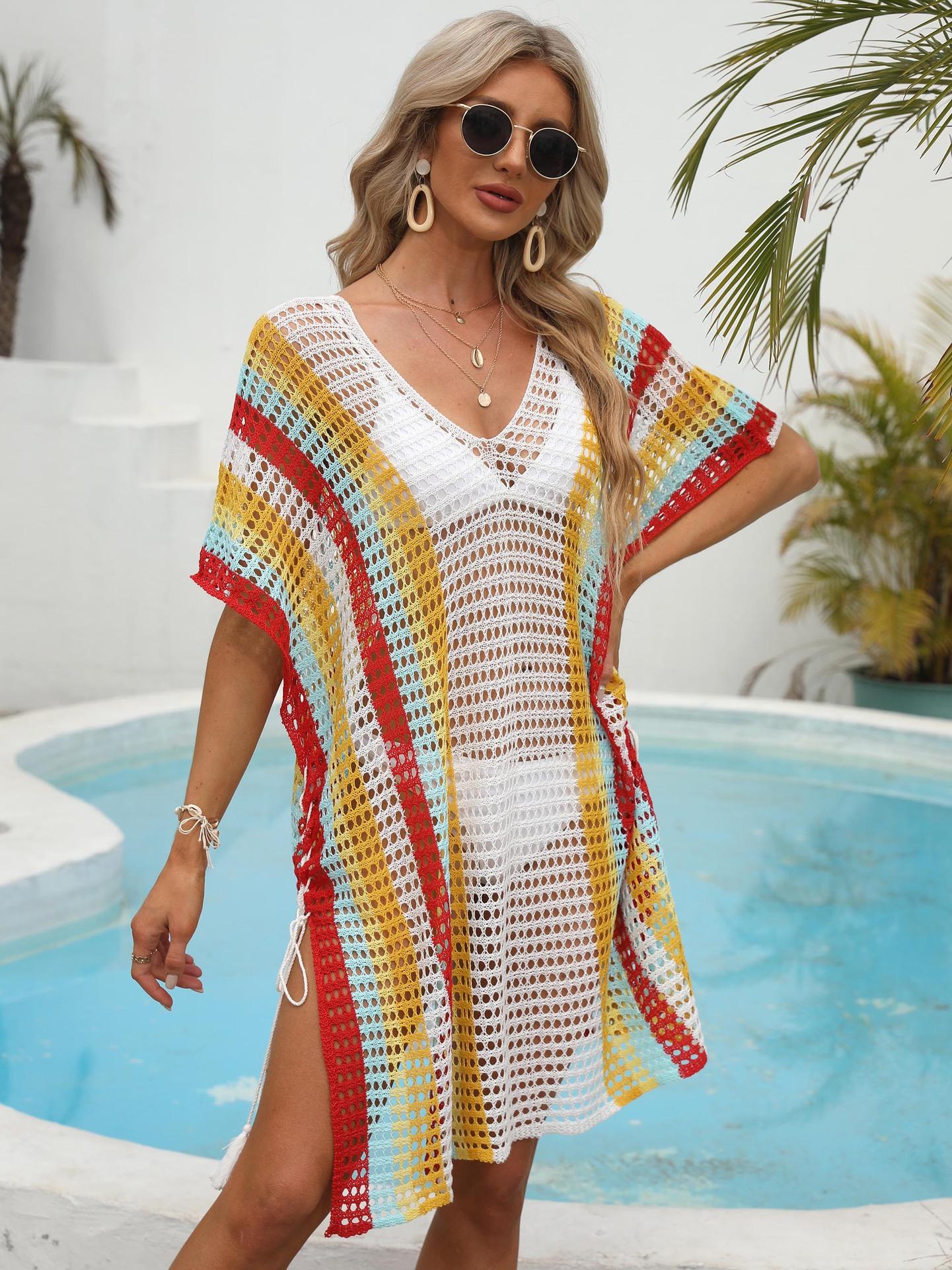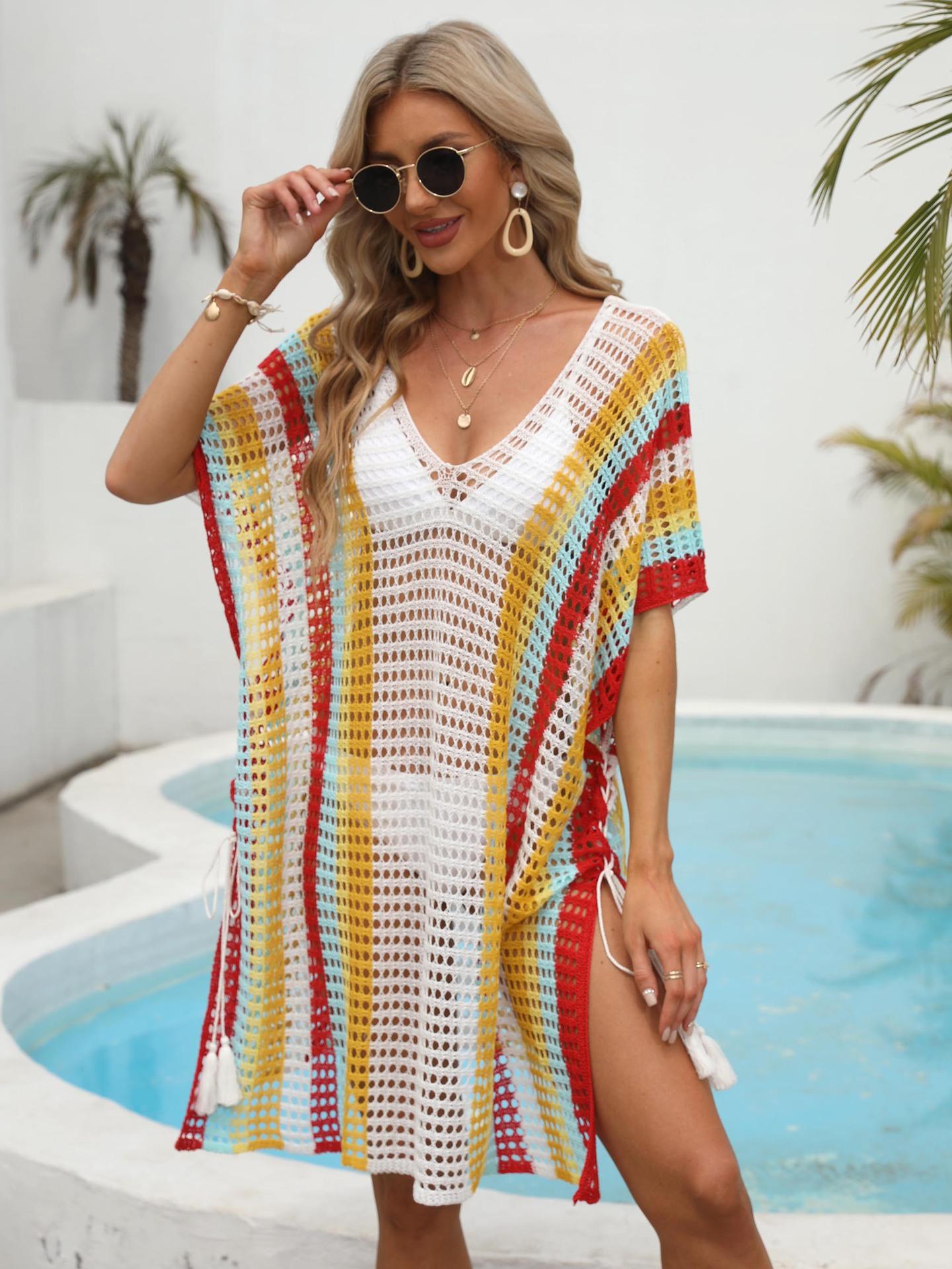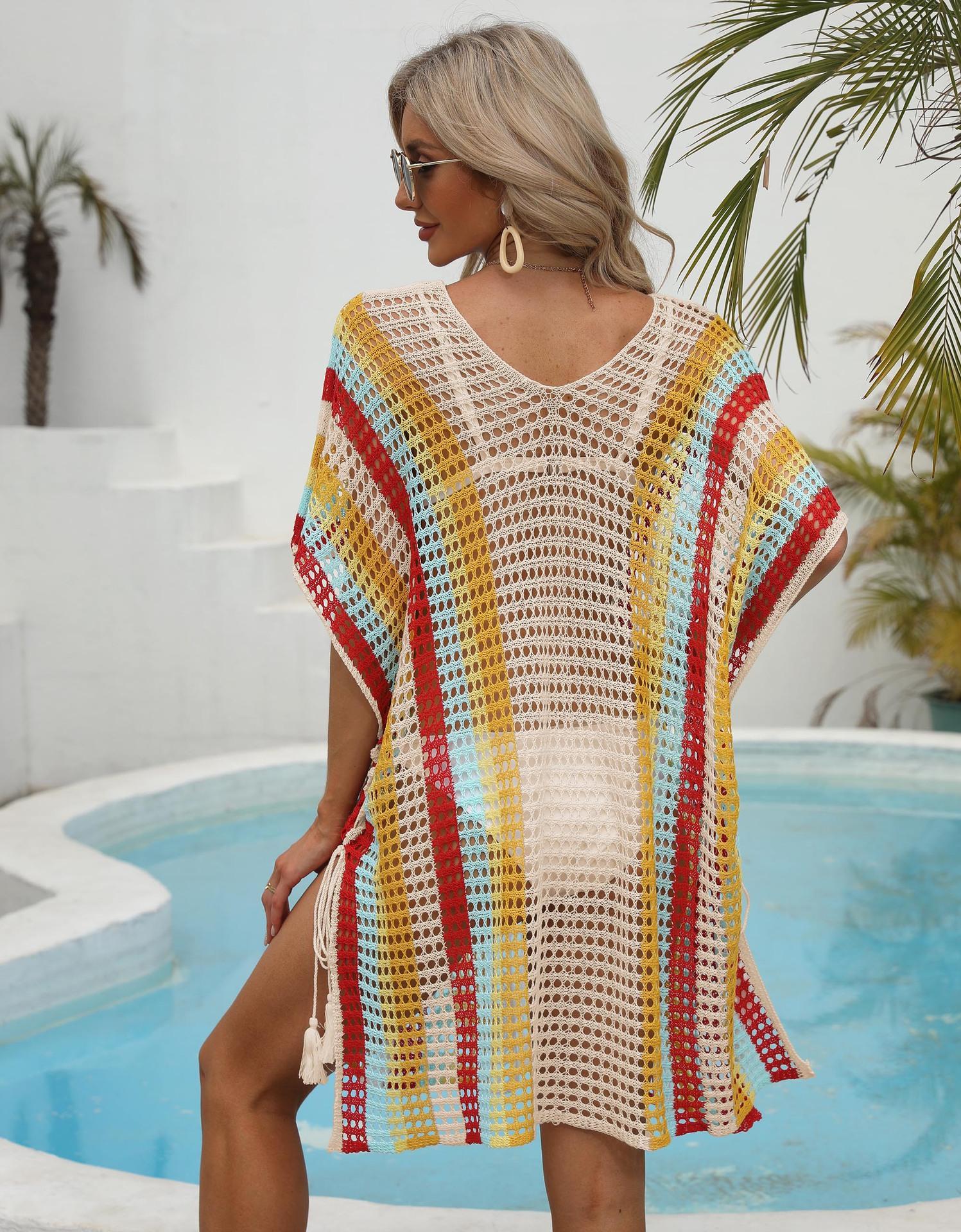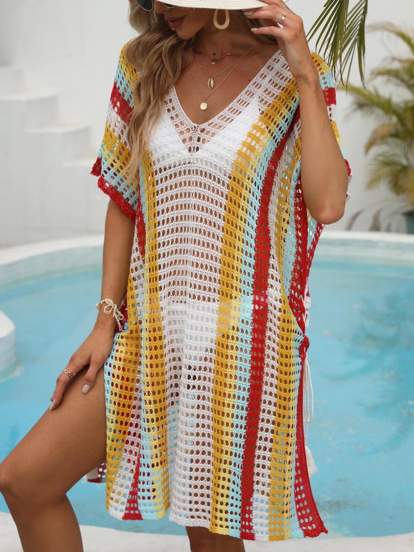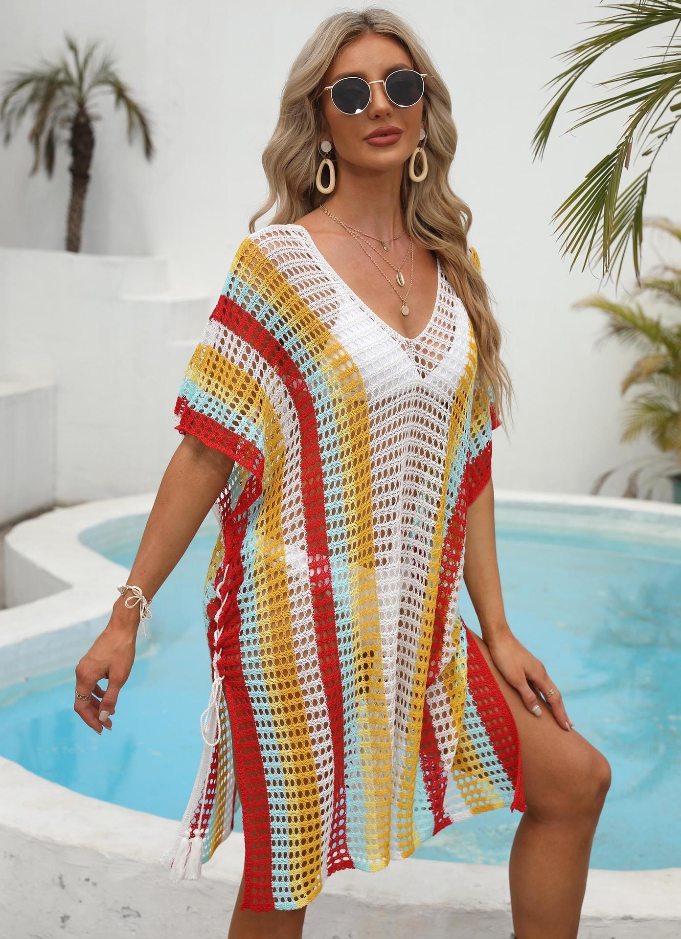 Ropa de Mujer Europea y Americana Transfronteriza Costuras en Color de Contraste Tejido Calado Vacaciones de Playa Bikini Blusa Vestido con Cordones 847