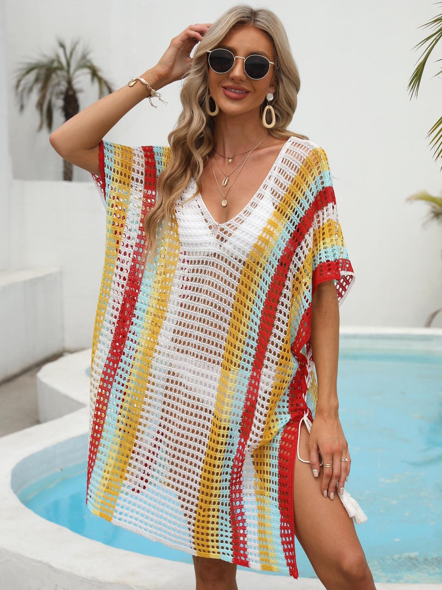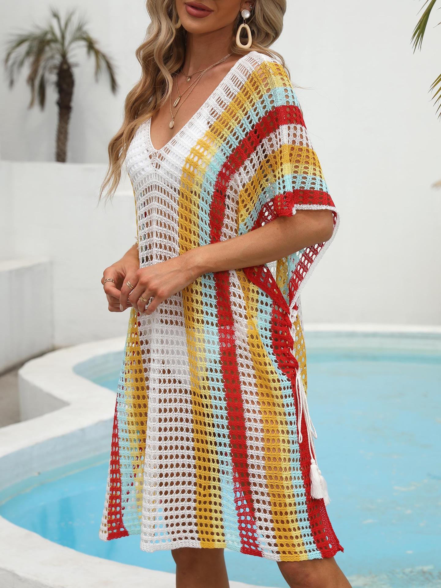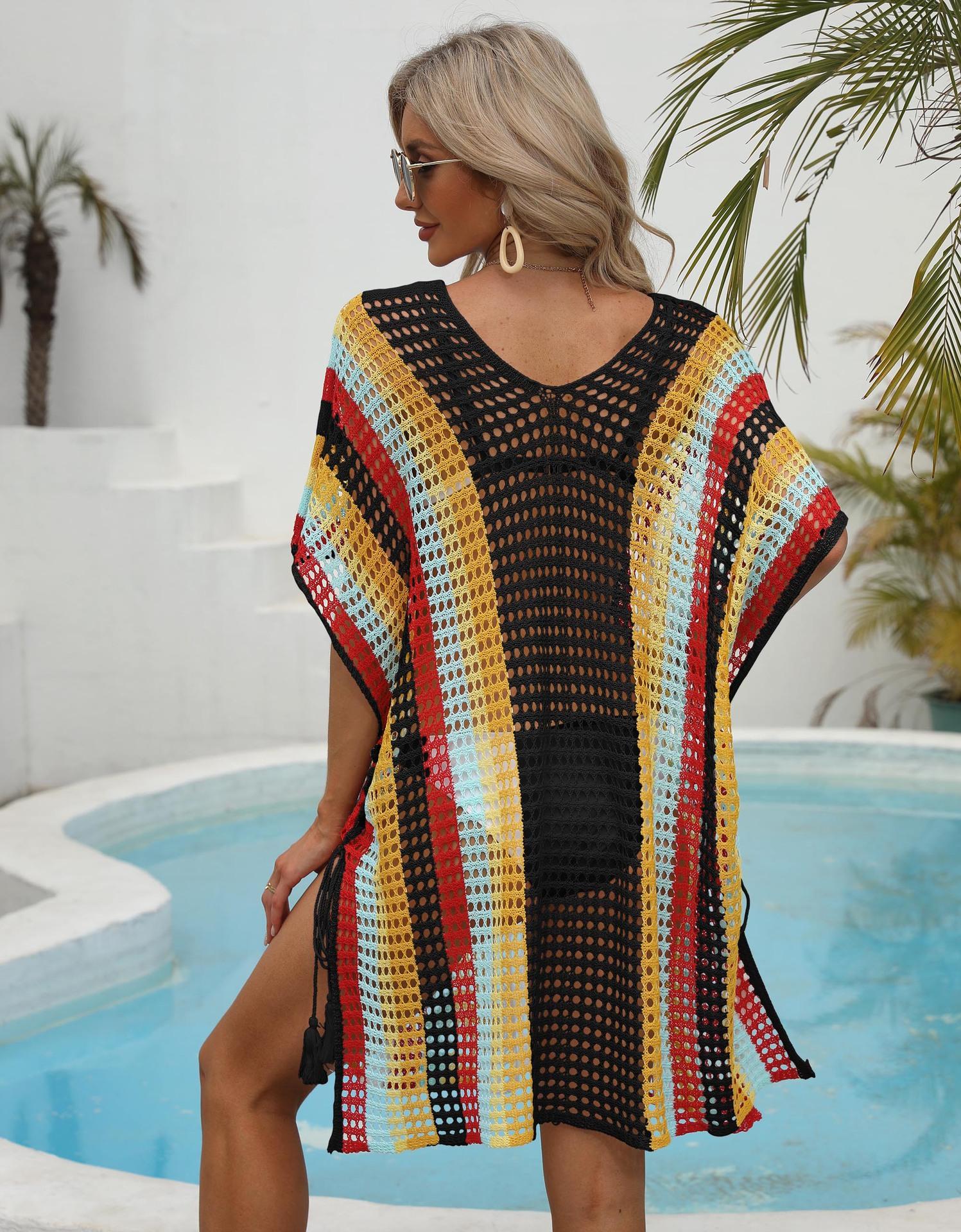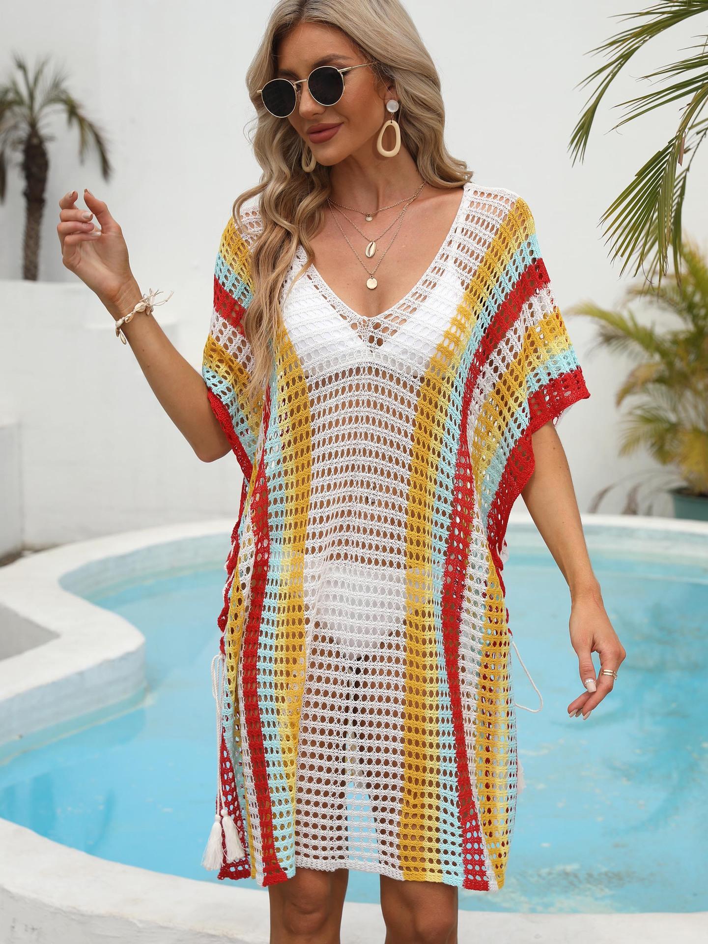 Ropa de Mujer Europea y Americana Transfronteriza Costuras en Color de Contraste Tejido Calado Vacaciones de Playa Bikini Blusa Vestido con Cordones 847