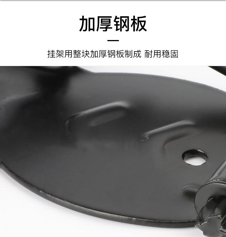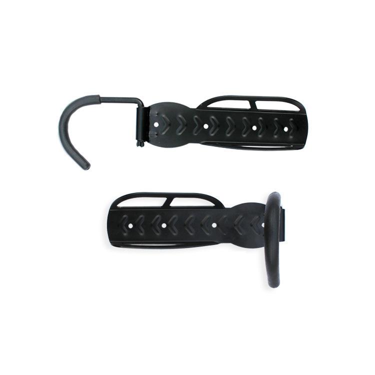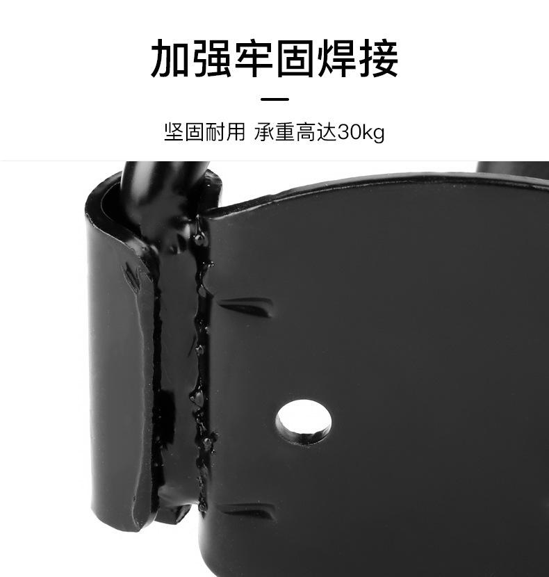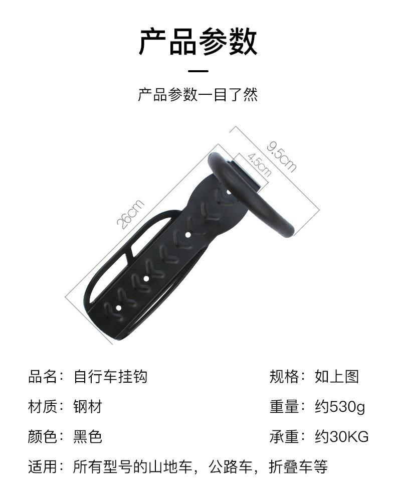 Este gancho para bicicleta está hecho de materiales sólidos, buen acero, lo suficientemente grueso, y pesa 550 gramos. El diseño general es bueno, fijado con 4 tornillos, distribuidos uniformemente en el cuerpo principal y la parte superior. El lado izquierdo del cuerpo principal está diseñado con nervaduras de refuerzo, que no se doblarán por la bicicleta. La placa protectora en el lado derecho está diseñada para ser más pequeña, por lo que no obstaculizará la rueda delantera al colocar y quitar el vehículo. El extremo delantero del gancho tiene un arco grande, el ángulo del gancho es apropiado y la rueda delantera no se caerá. La funda de goma es larga para proteger la llanta y los radios. El cuerpo principal y el gancho están soldados en dos partes, que son de alta resistencia y duraderas.