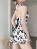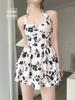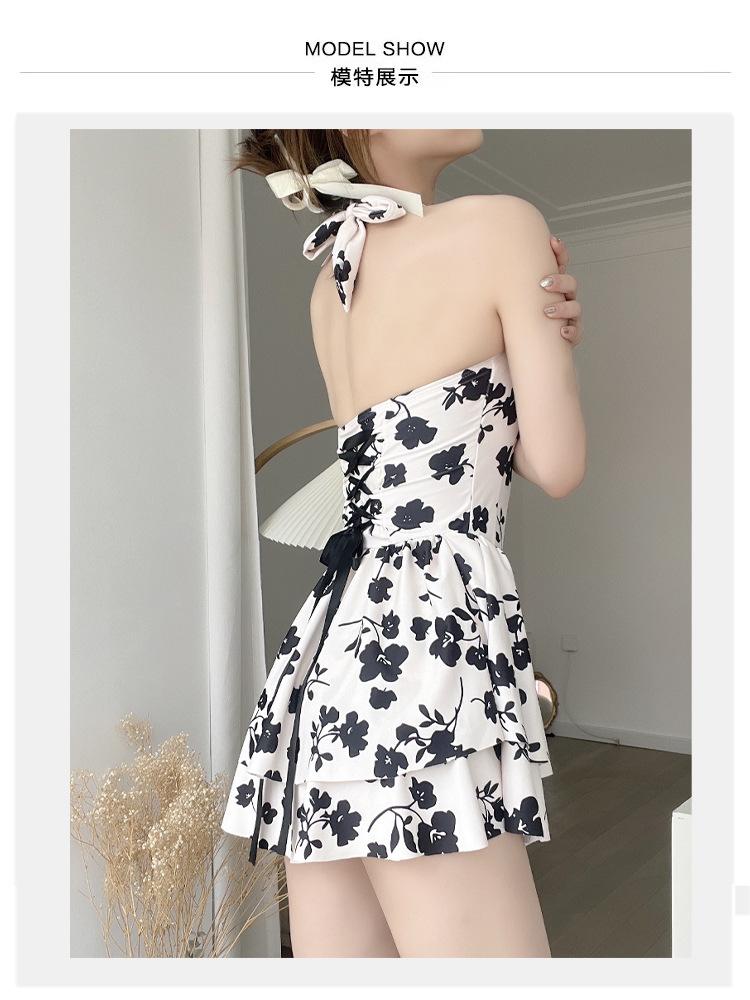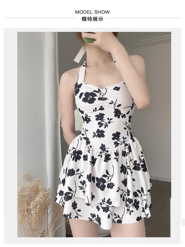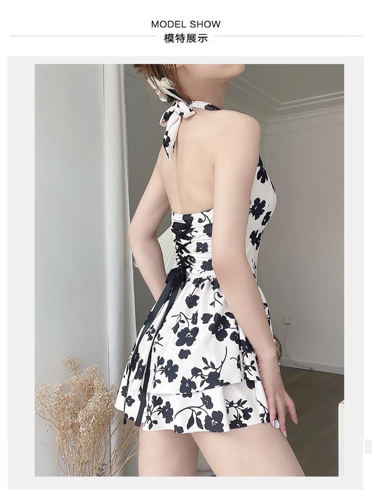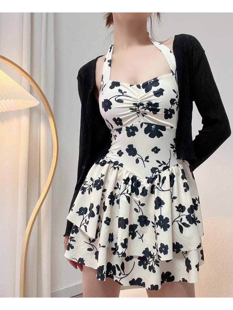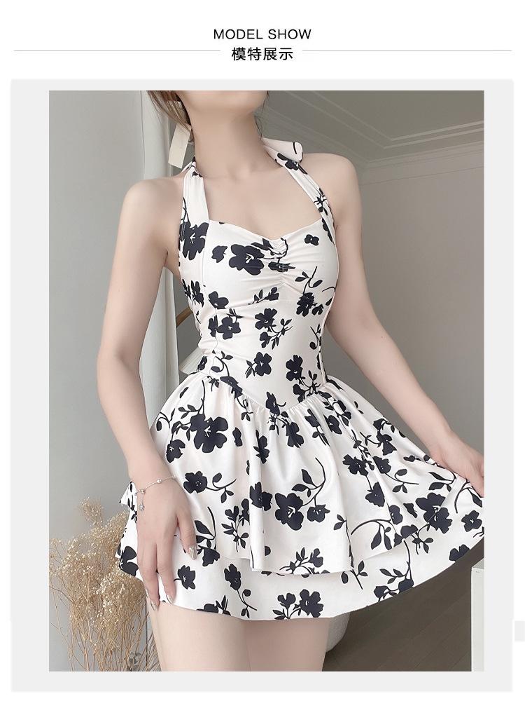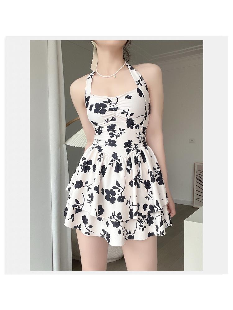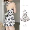 Traje de Baño Entero Nuevo 2025 para Mujer Negro Amapola Boxer Esquina Conservadora Chica Tirante Halter Cintura Alta Cubriendo Vientre Aguas Termales