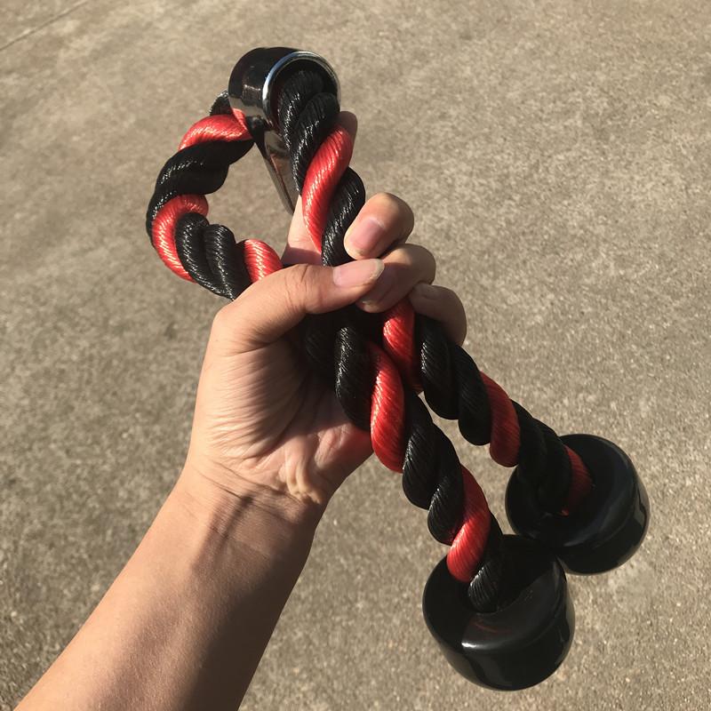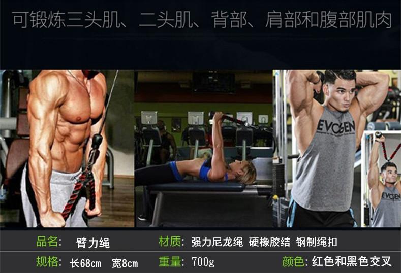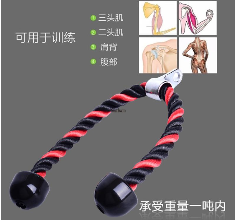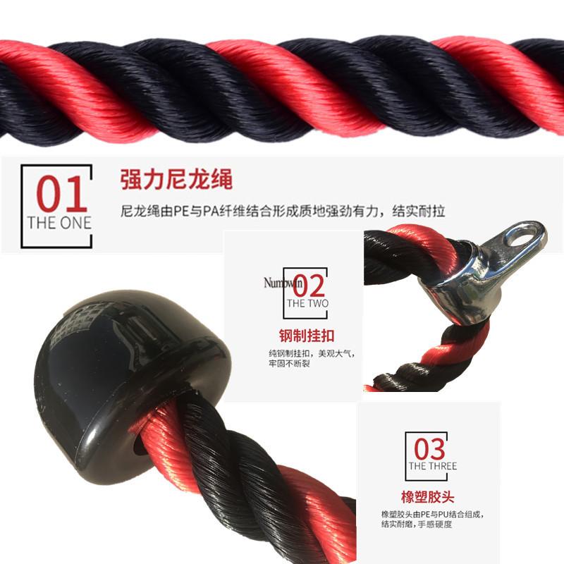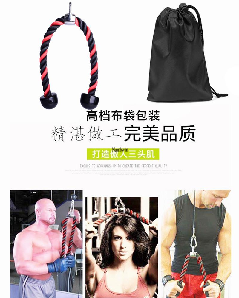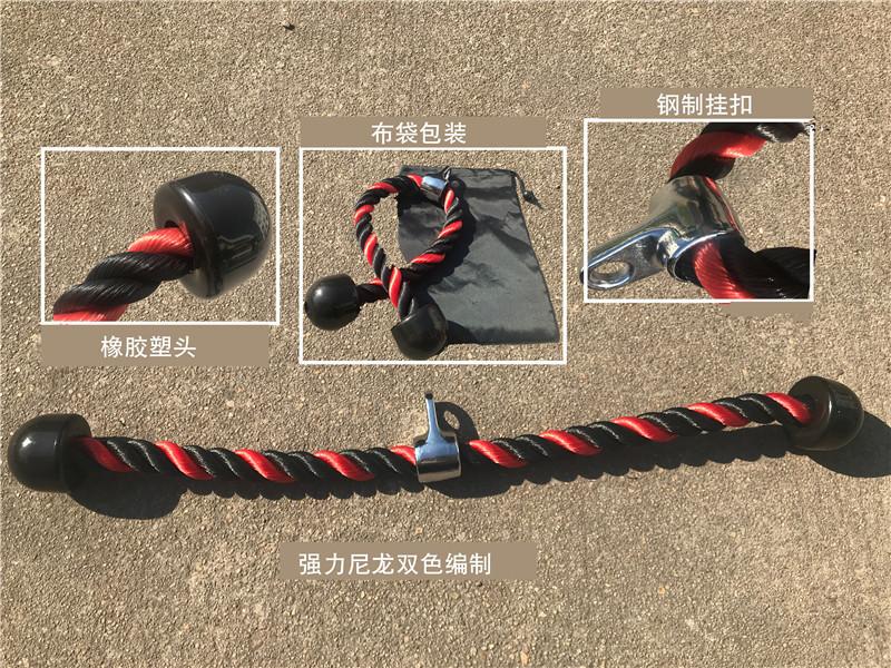 Embalaje de bolsa de tela de alta calidad, cuerda de brazo colorida, embalaje de bolsa de tela negra, peso 700g, longitud 68cm, ancho 8cm. Se puede utilizar para entrenar tríceps, bíceps, hombros y abdomen de espalda. La cuerda de nailon está formada por la combinación de fibras de PE y PA. Es fuerte y resistente, fuerte y resistente a la tensión y puede soportar una carga de menos de 1 tonelada. Hebilla de acero puro, hermosa y fuerte. El cabezal de caucho-plástico está compuesto de PE y PU, fuerte y resistente al desgaste, y tiene una gran dureza.