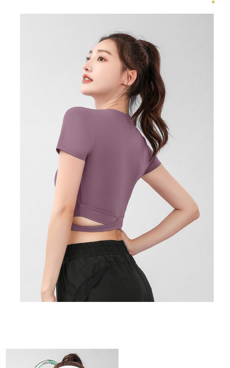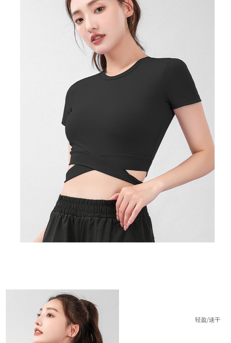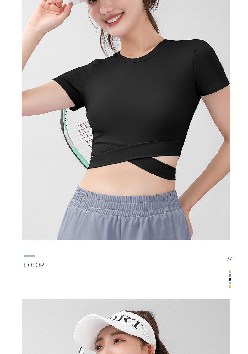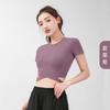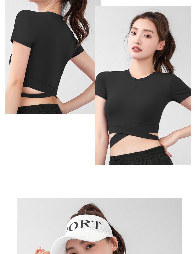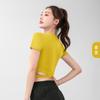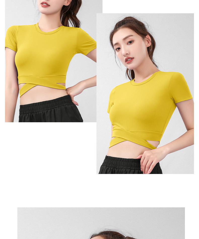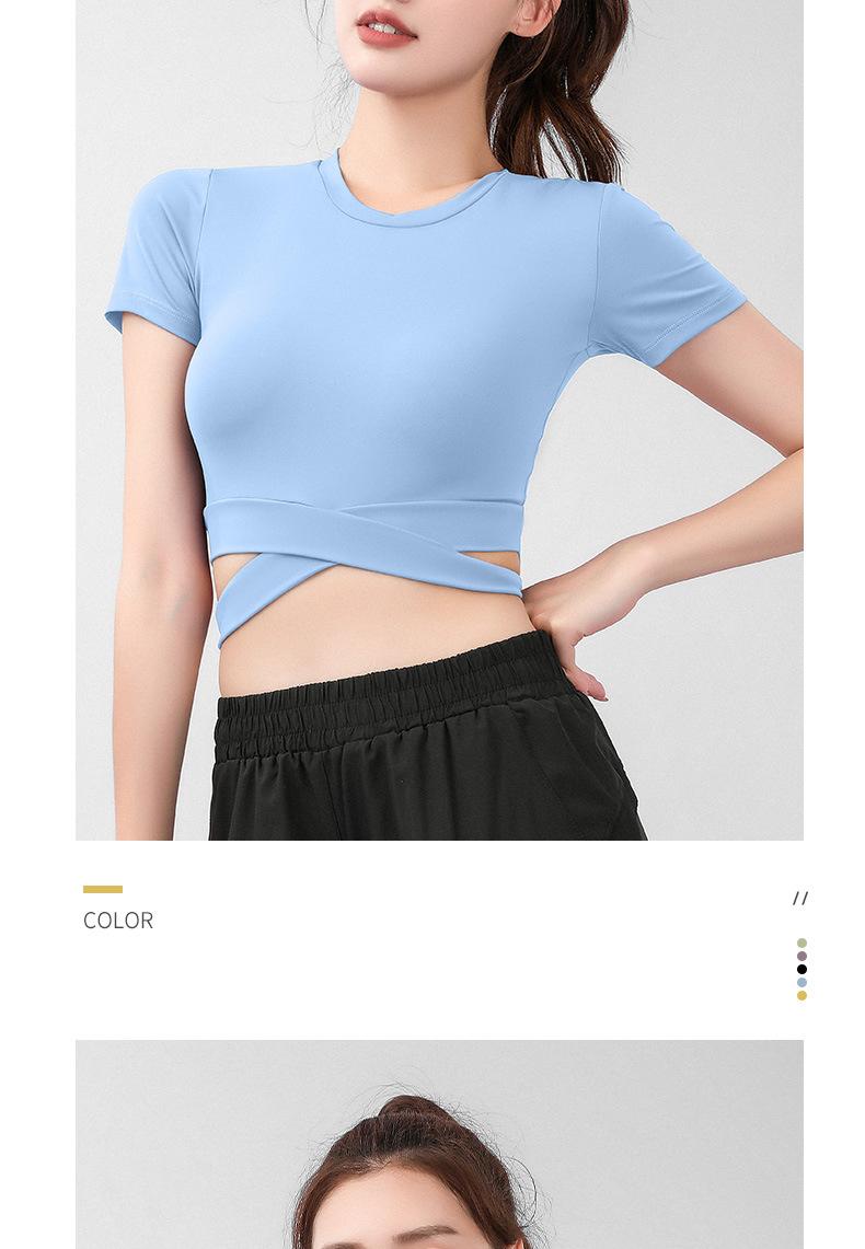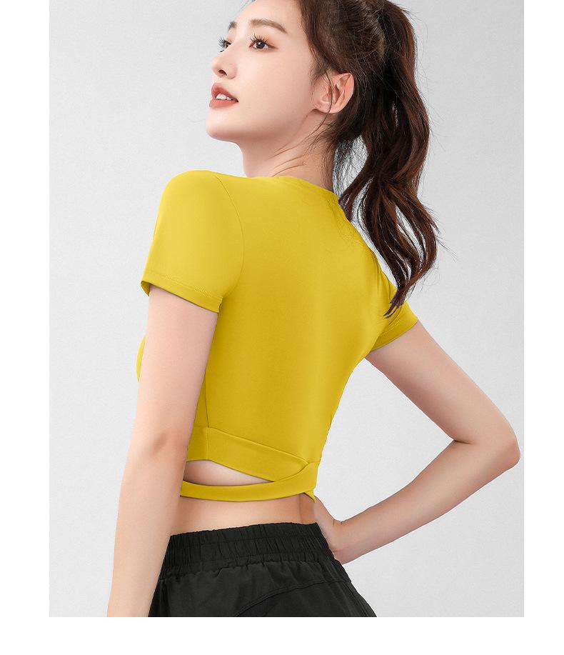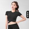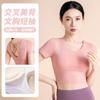 Top de yoga elástico adelgazante de cintura ajustada de color sólido de manga corta con cruz desnuda para mujer