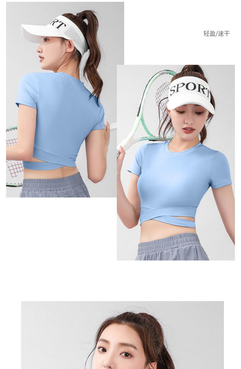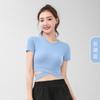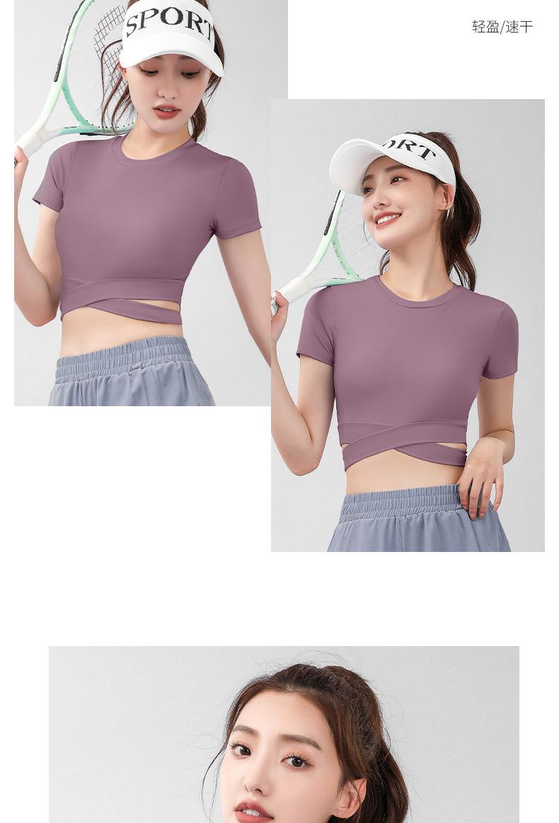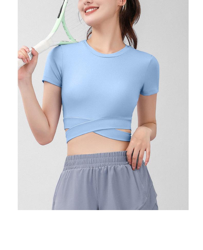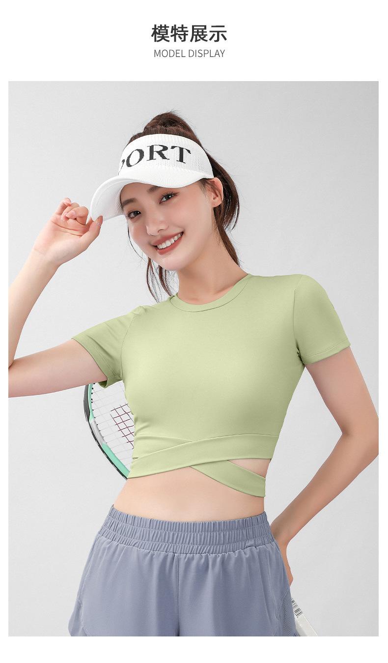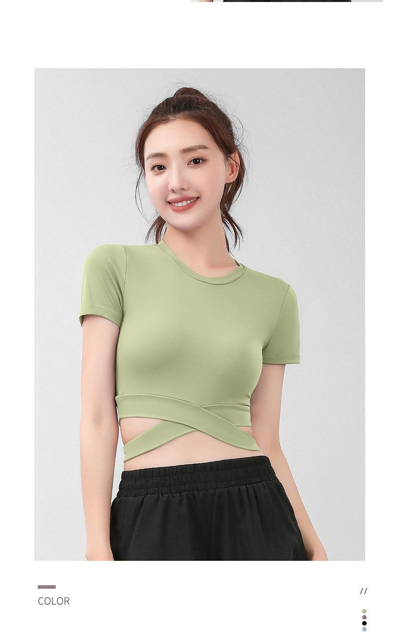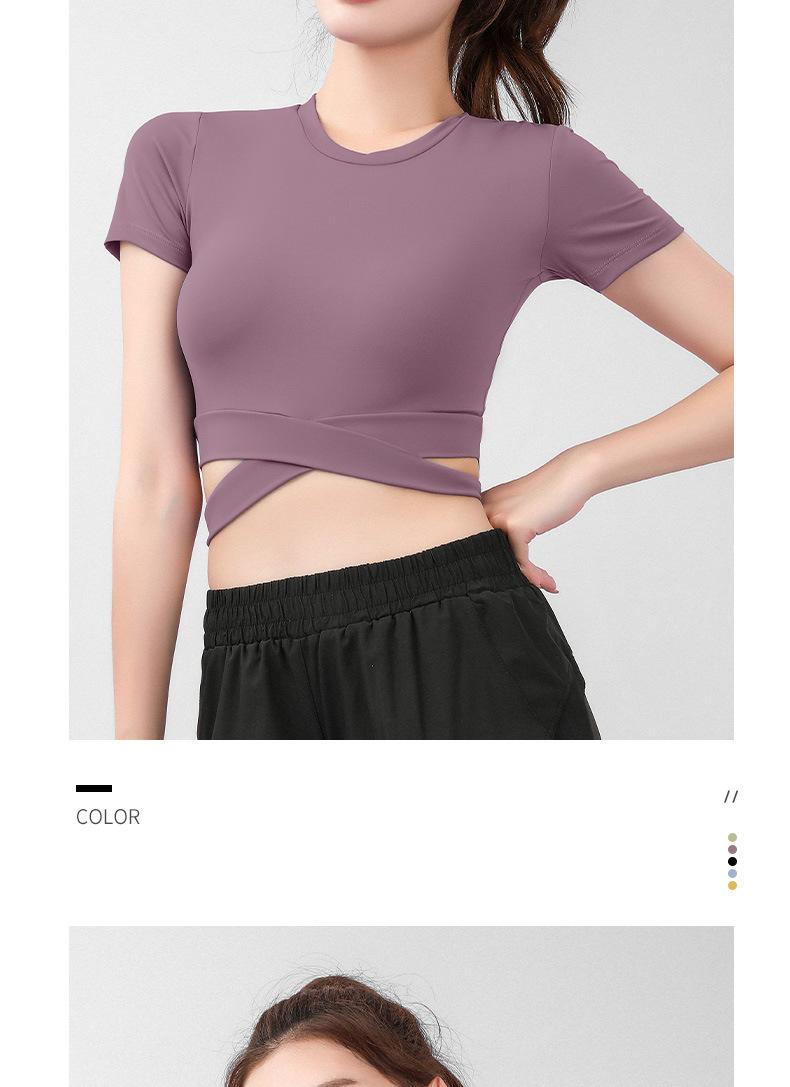 Top de yoga elástico adelgazante de cintura ajustada de color sólido de manga corta con cruz desnuda para mujer