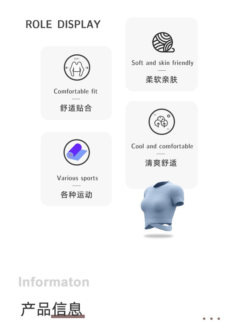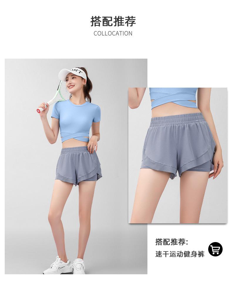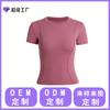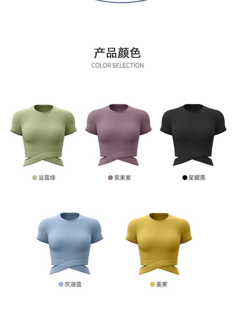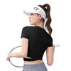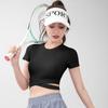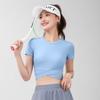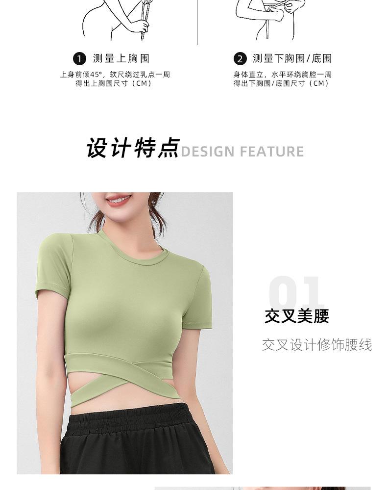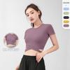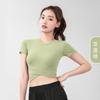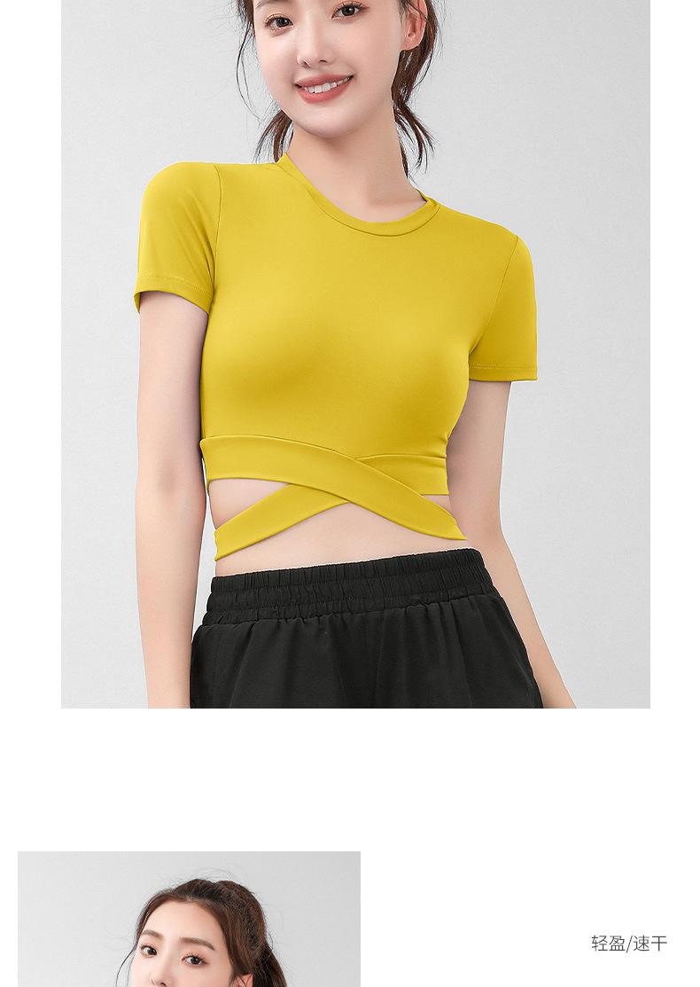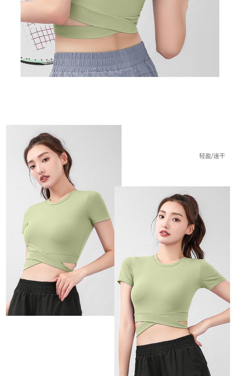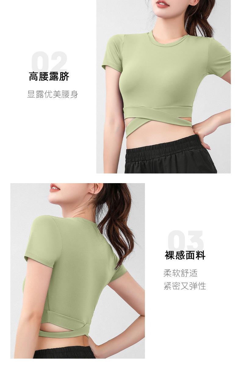 Top de yoga elástico adelgazante de cintura ajustada de color sólido de manga corta con cruz desnuda para mujer