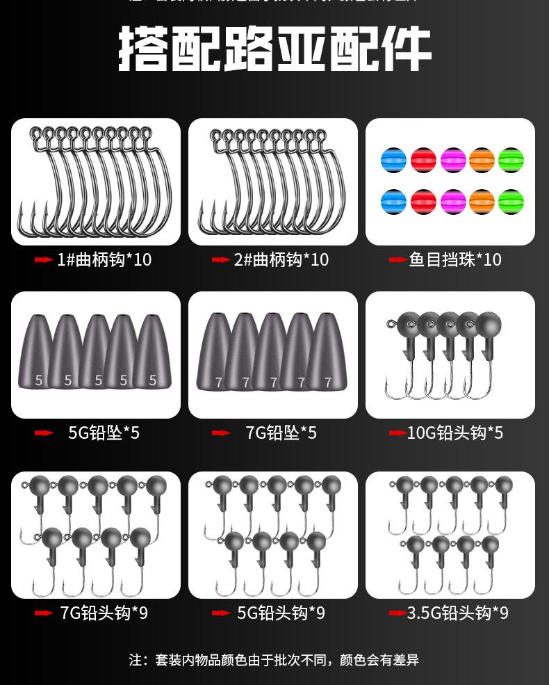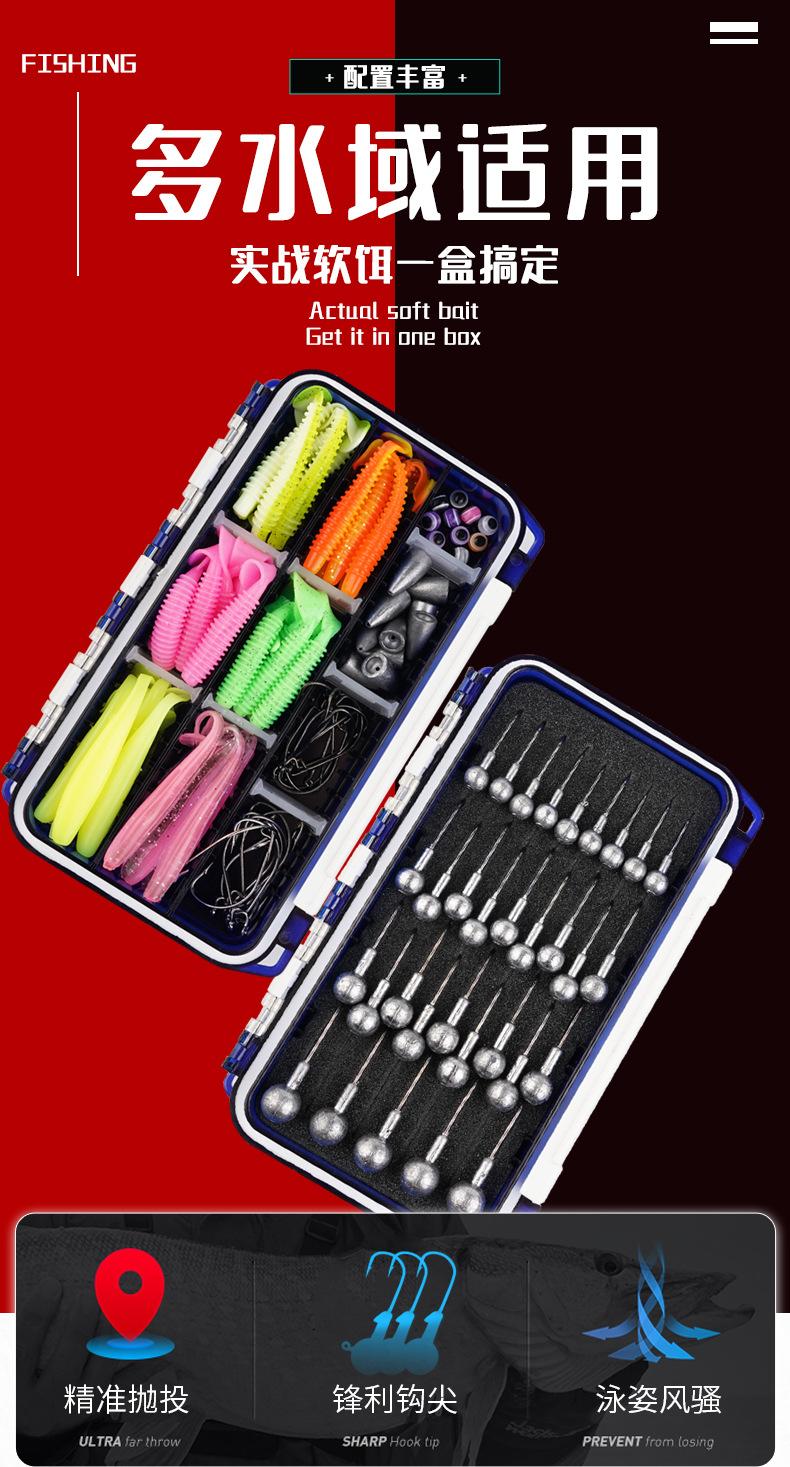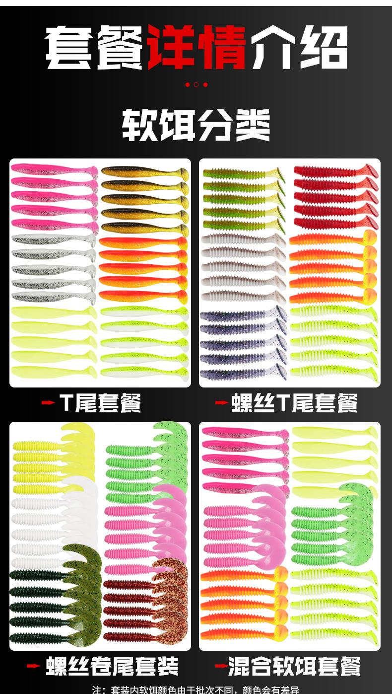 Suministro directo de fábrica, señuelo de capa de agua completa en caja, cebo blando, cola en T, rollo de pez, cola, gusano, anzuelo de manivela, anzuelo de plomo, juego de cebo falso
