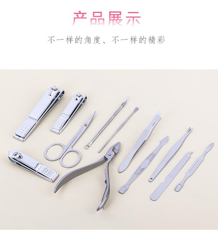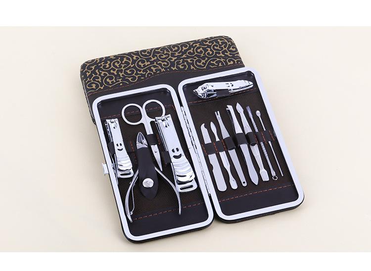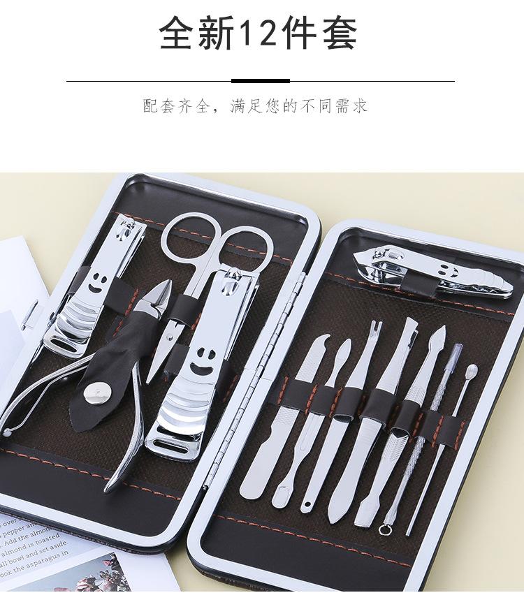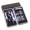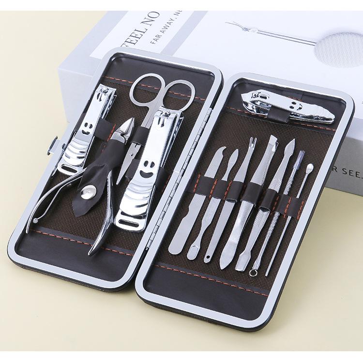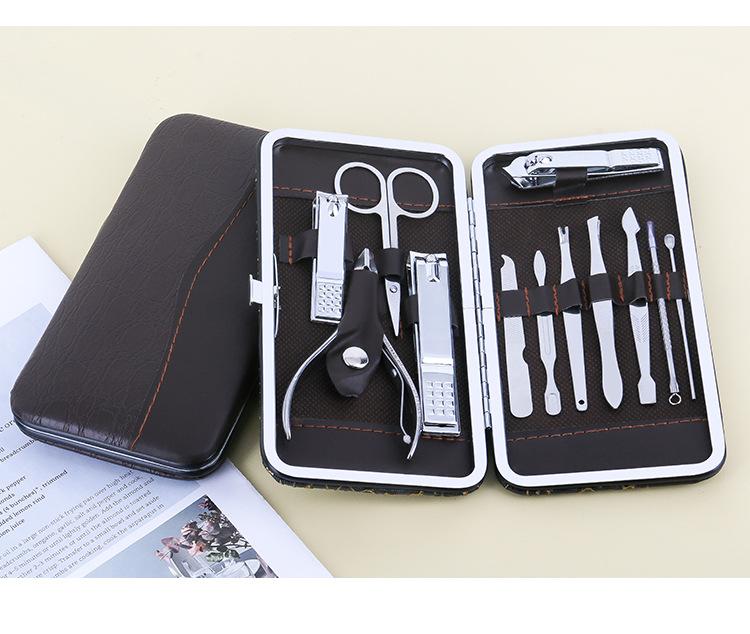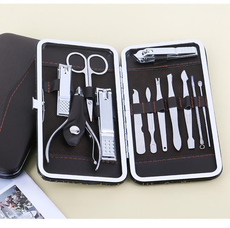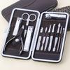 Juego de cortaúñas negro para el hogar, fabricante, caja de cuero, 12 piezas, herramientas de manicura de belleza, juego de cortaúñas con logotipo impreso