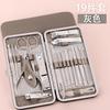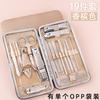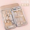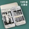 Juego de decoración de uñas al por mayor, juego de 19 piezas de herramientas de manicura de belleza doradas, juego de cortaúñas y tijeras de uñas de regalo.