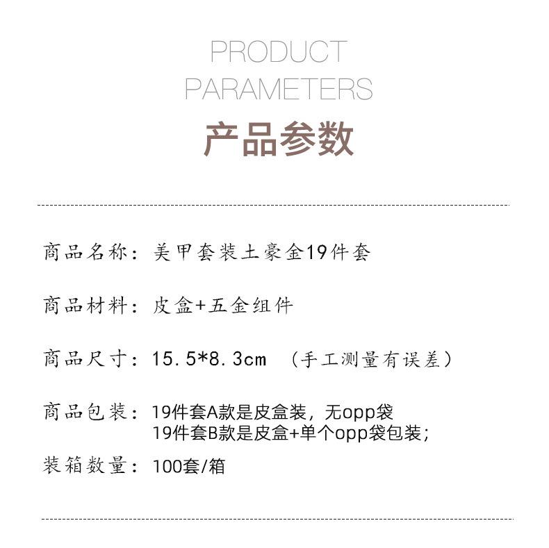 Actualmente, algunos fabricantes, para reducir costos, han reemplazado los accesorios originales de este juego de 19 piezas por otros de menor calidad. Se han cambiado el limpiador de oídos y los cortaúñas.Nuestra fábrica ha insistido en usar piezas originales desde el inicio de la producción hasta ahora. Siempre hemos seguido el principio de que solo la calidad estable puede garantizar ventas a largo plazo.. Estimados clientes nuevos y antiguos, por favor comparen más los accesorios al comprar. Apoyamos el pedido de muestras para comparación. Si necesitan accesorios más baratos, también podemos personalizarlos según su estilo, porque somos el fabricante de origen.Podemos calcular un precio más bajo para los mismos accesorios.(Detalles de personalización, consulte el servicio de atención al cliente en línea).