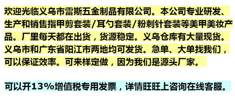 Gracias a todos por visitar Yiwu Leisi Hardware Products Co., Ltd. Nos especializamos en la investigación, desarrollo, producción y venta de juegos de cortaúñas, juegos de púas para orejas, juegos de agujas para el acné y otros productos de belleza para uñas. Ofrecemos muestras personalizadas, diseños personalizados y personalización de regalos. Nos adherimos a la filosofía empresarial de "cooperación beneficiosa para todos" para ofrecer a nuestros clientes productos más competitivos y un servicio posventa de alta calidad.