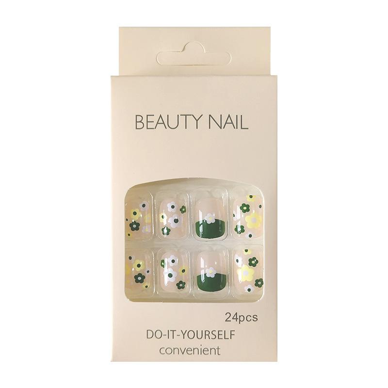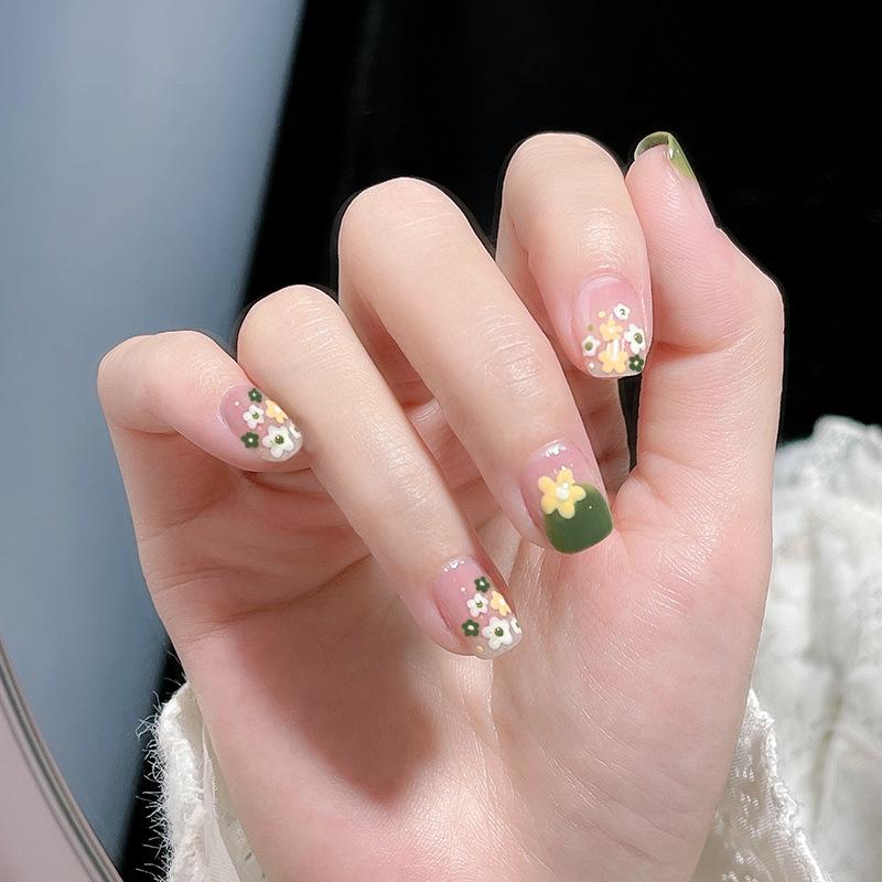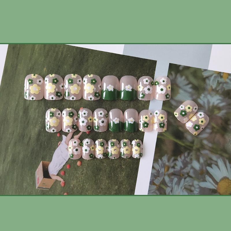 Parche para uñas con diseño de flores de primavera en verde, parche para uñas desmontable, parche para uñas postizas, parche para uñas terminado.