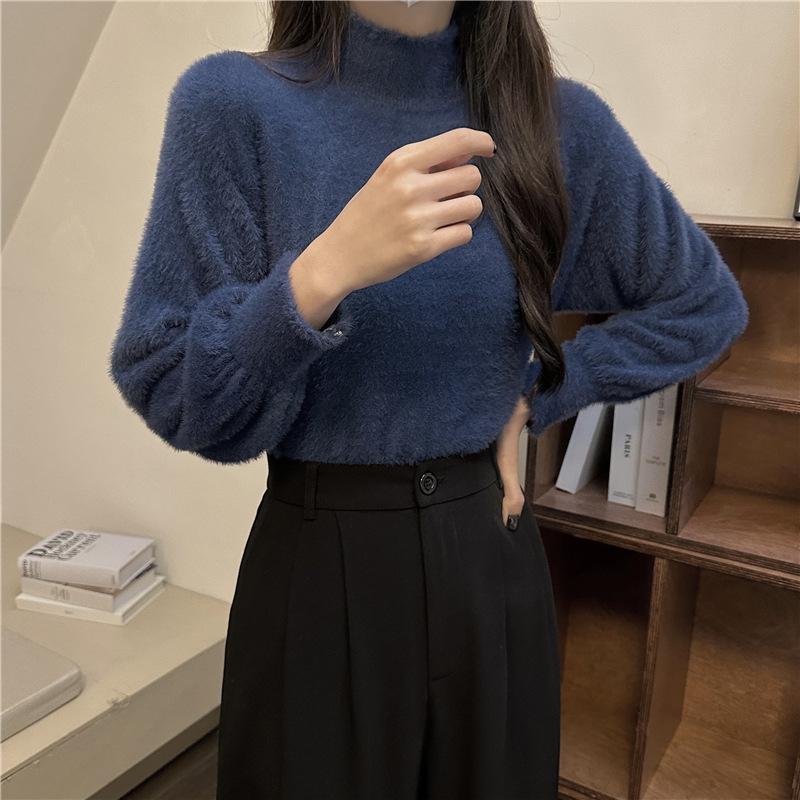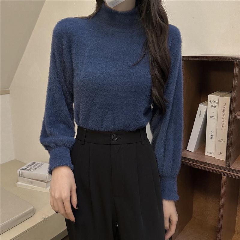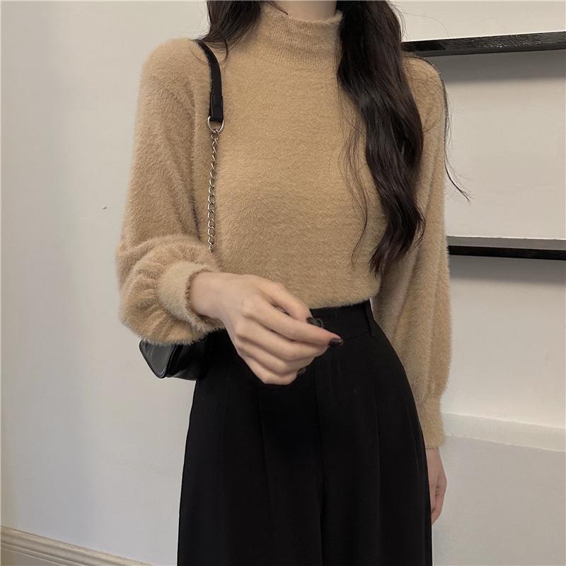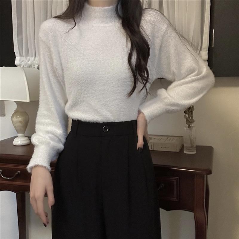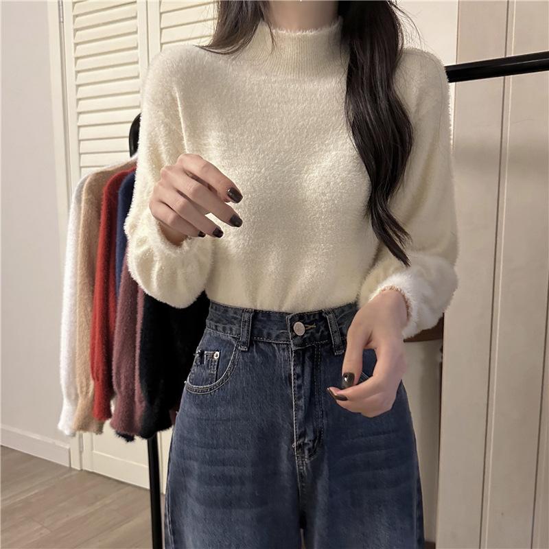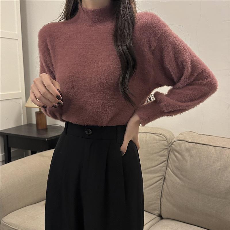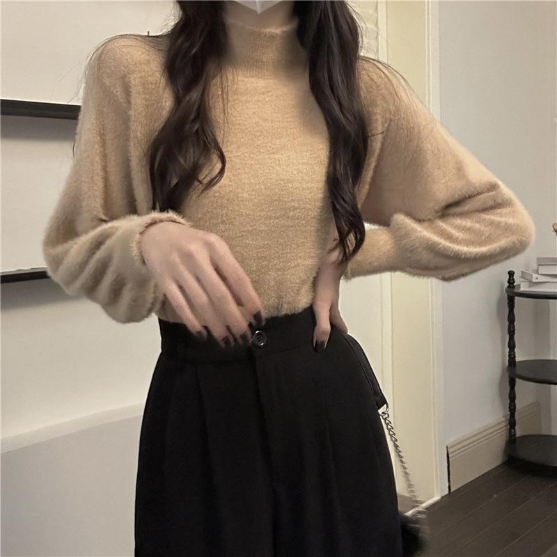 2023 Nuevo Otoño e Invierno Suéter Holgado de Cuello Medio Top Cálido Interior Imitación Visón Cuello Alto Medio Tejido de Punto para Fondo