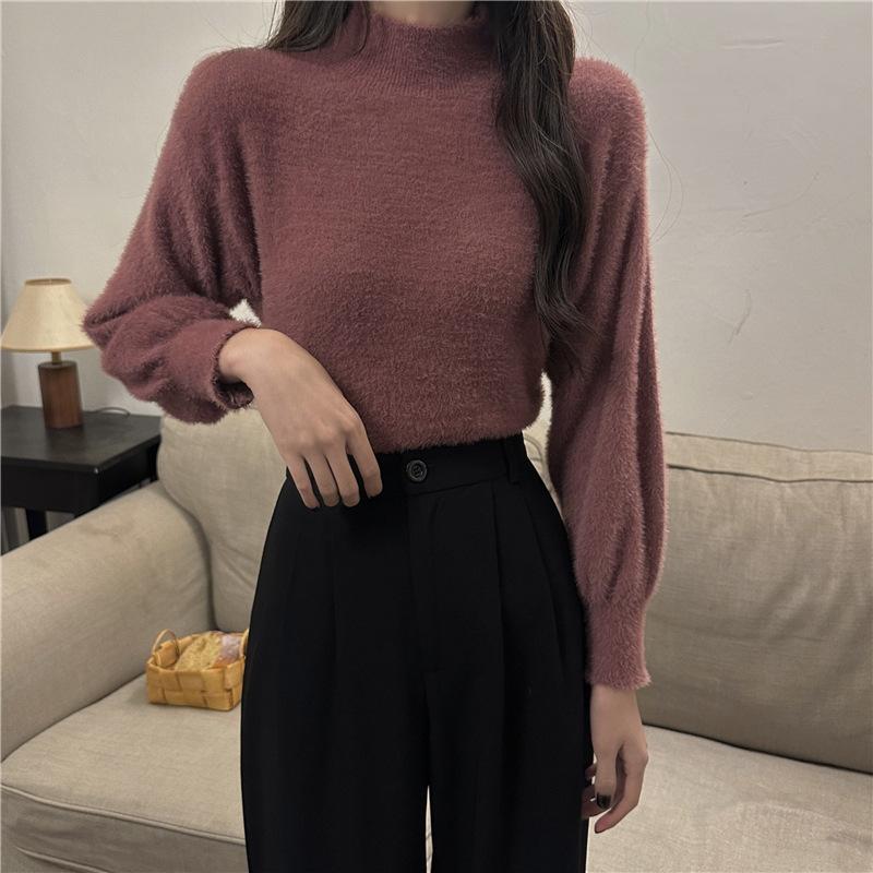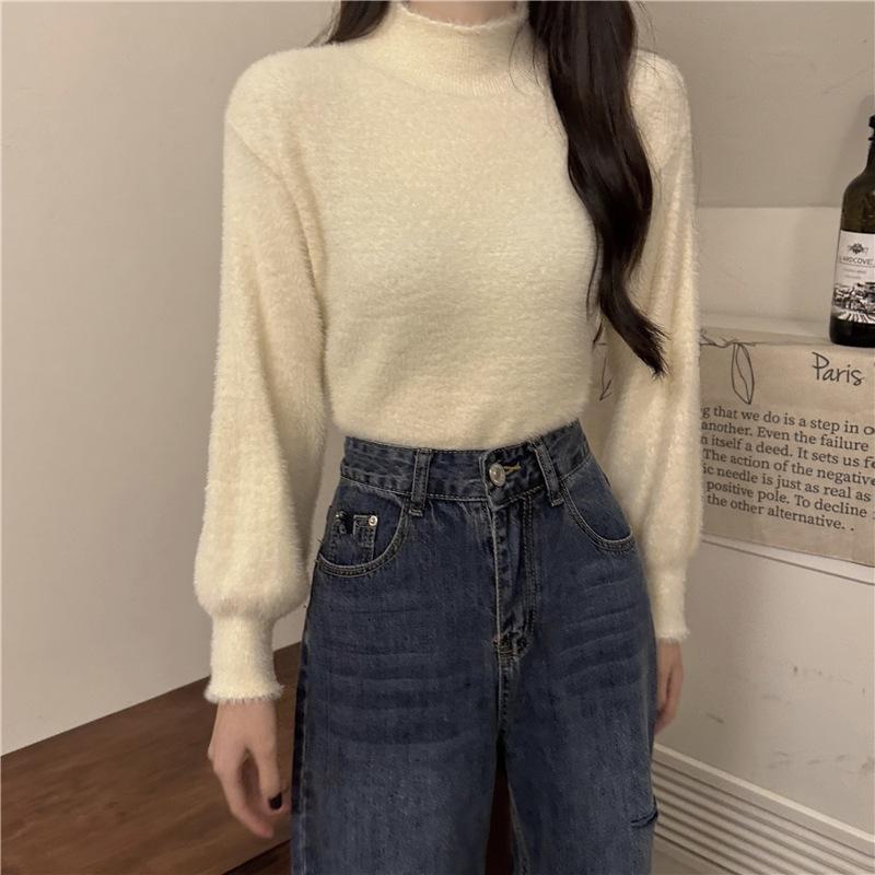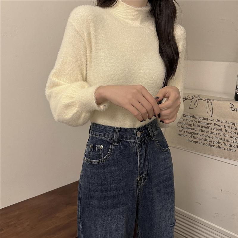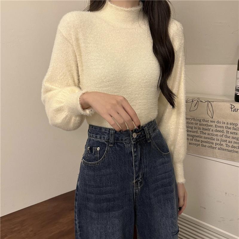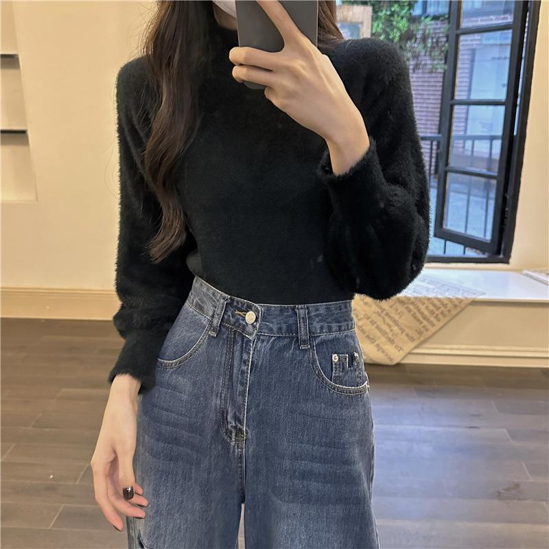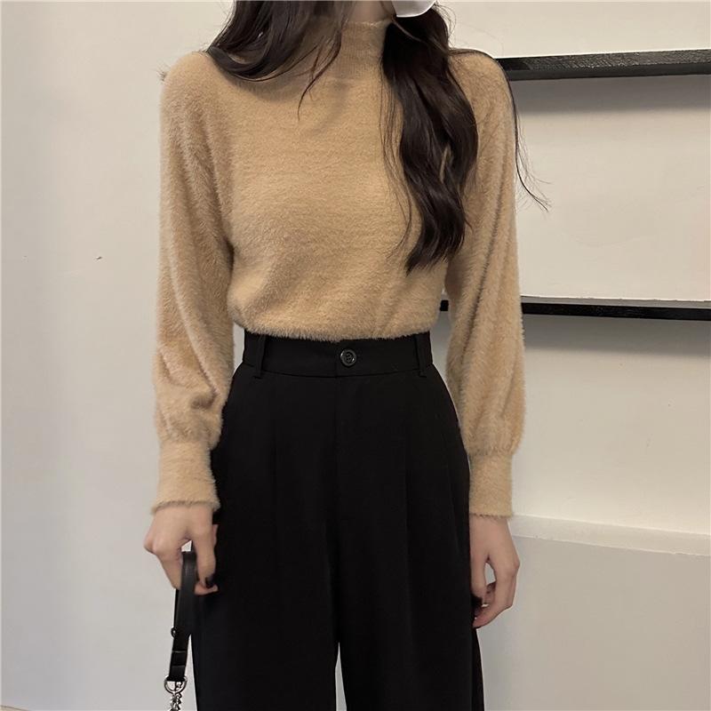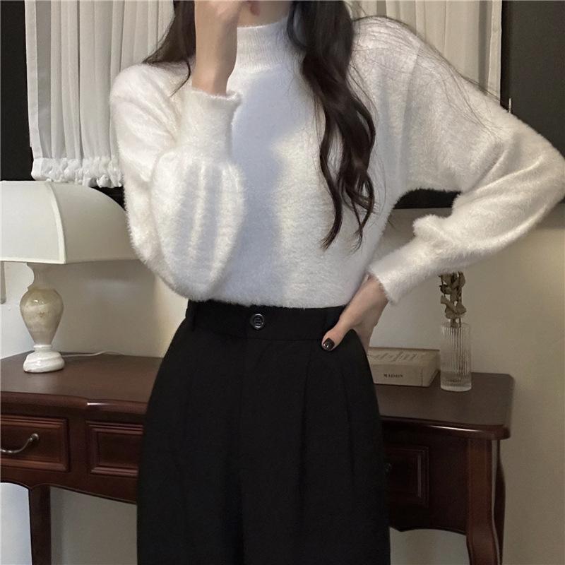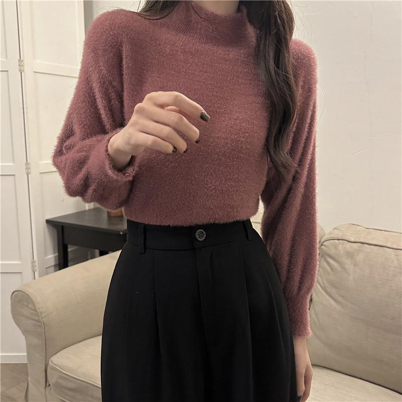 2023 Nuevo Otoño e Invierno Suéter Holgado de Cuello Medio Top Cálido Interior Imitación Visón Cuello Alto Medio Tejido de Punto para Fondo