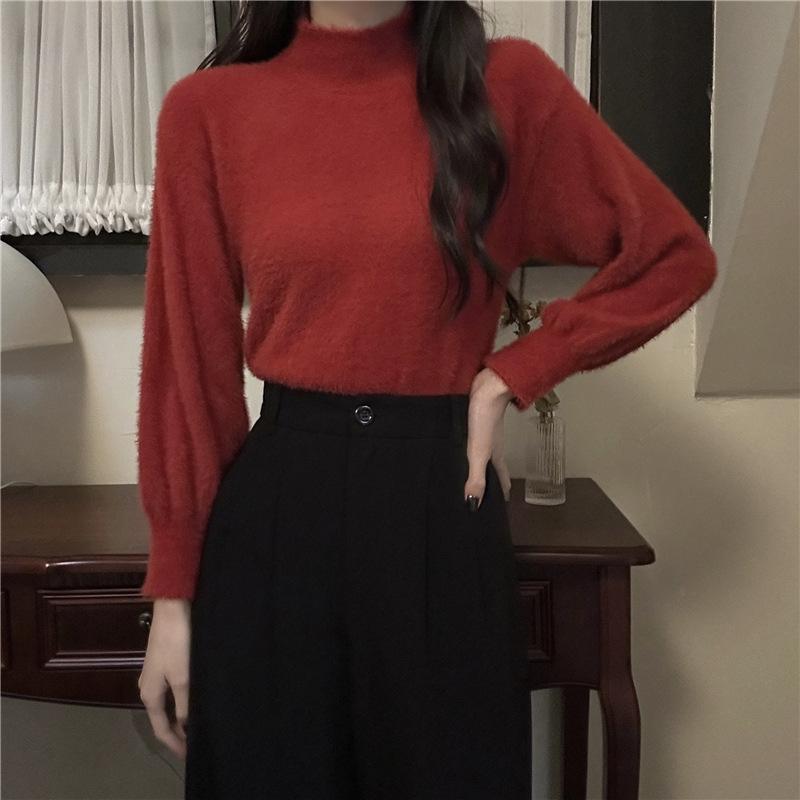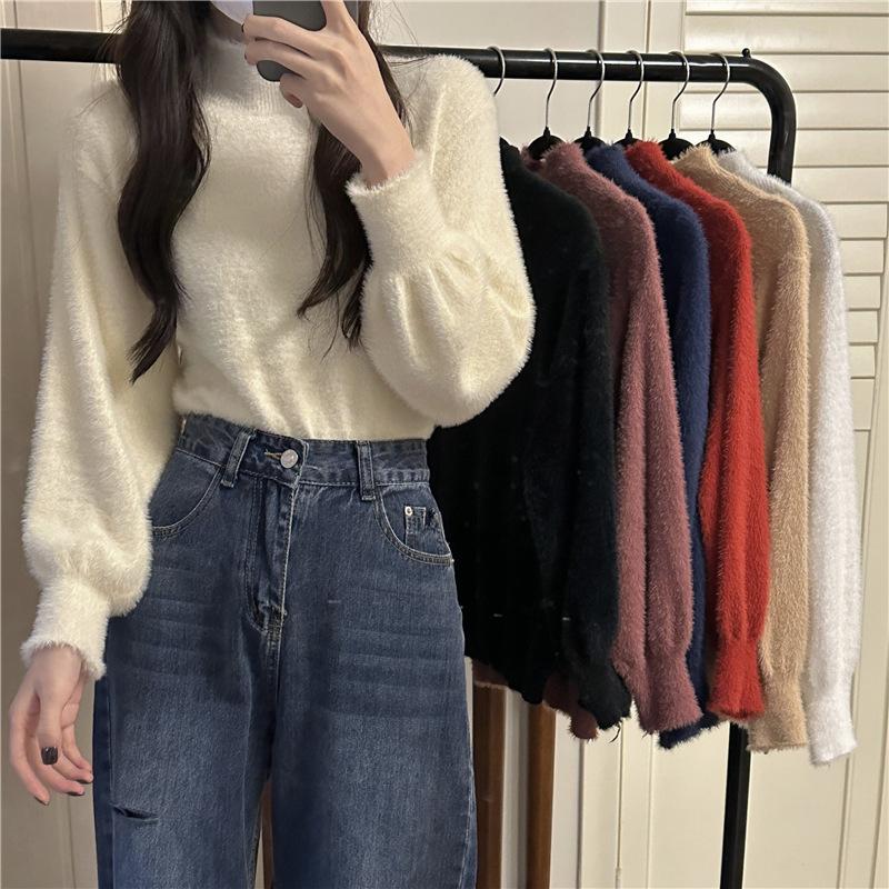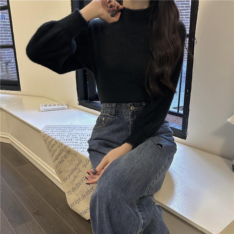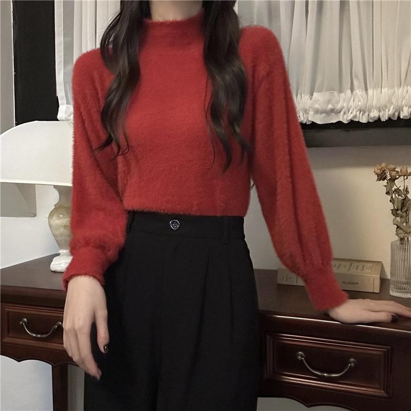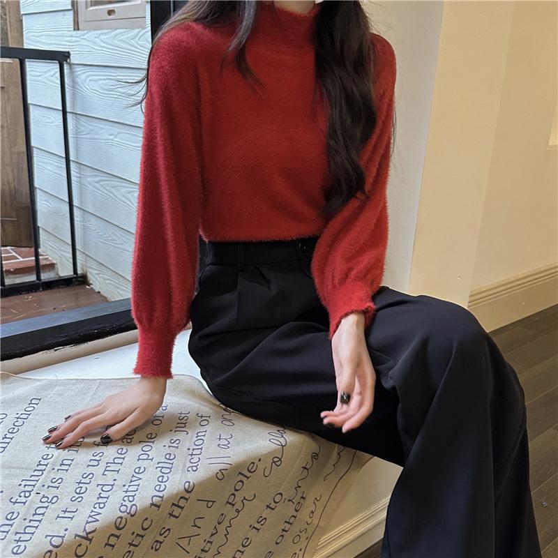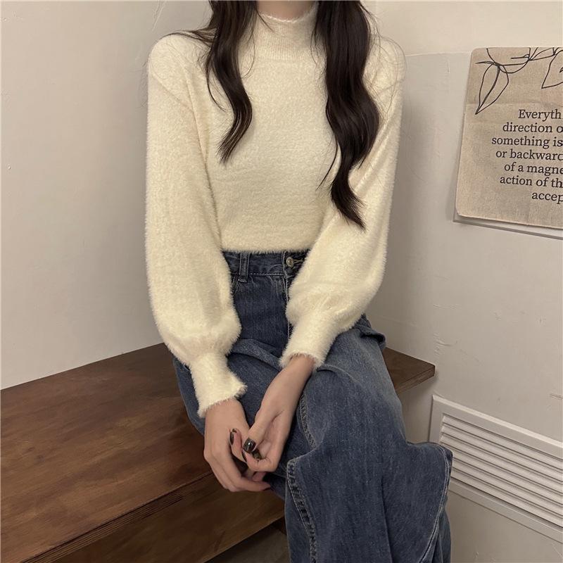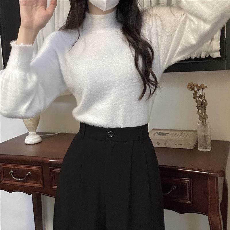 2023 Nuevo Otoño e Invierno Suéter Holgado de Cuello Medio Top Cálido Interior Imitación Visón Cuello Alto Medio Tejido de Punto para Fondo