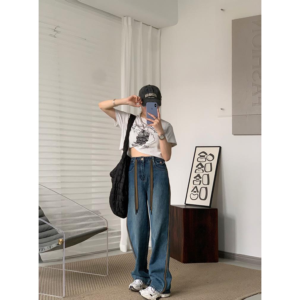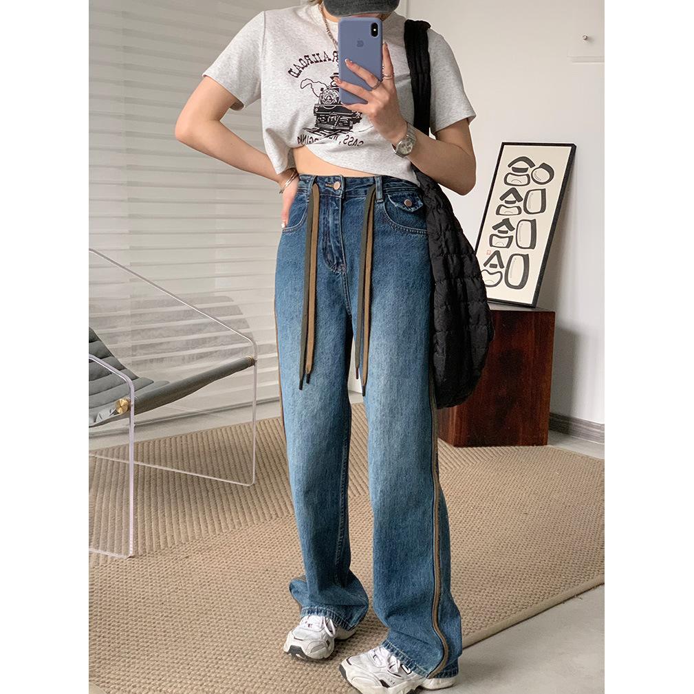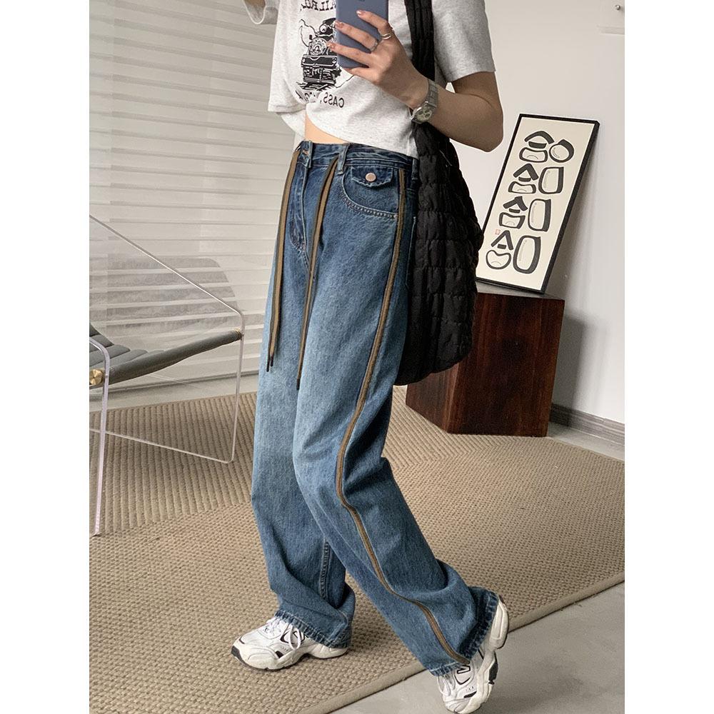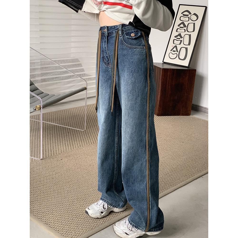 Jeans de pierna recta de talle alto para mujer 2025 Primavera Nuevo Suelto Pera Retro Cordón Largo hasta el suelo Jeans de pierna ancha