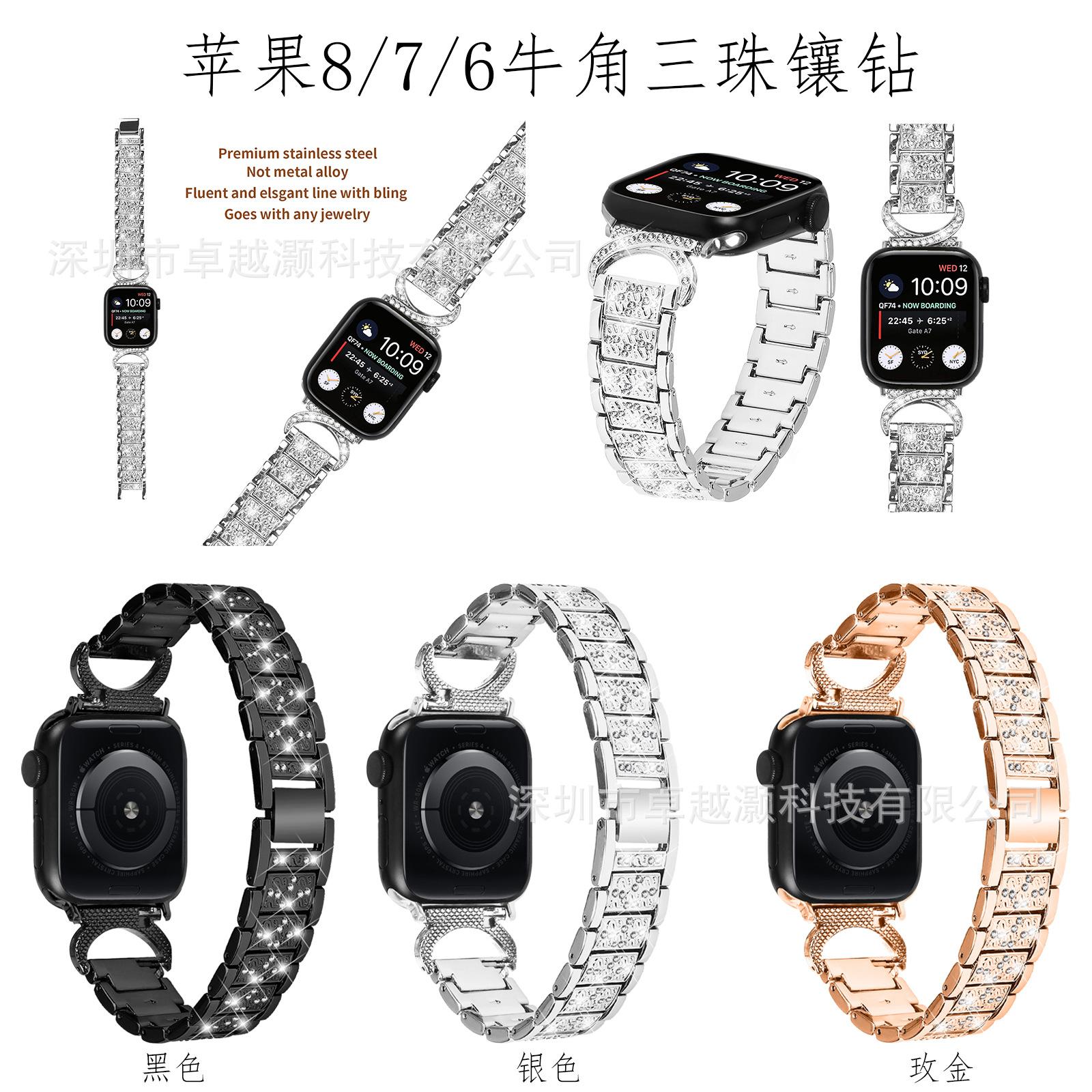 Compatible con Apple iWatch 9/Ultra, correa de metal simple con tres cuentas y diamantes.