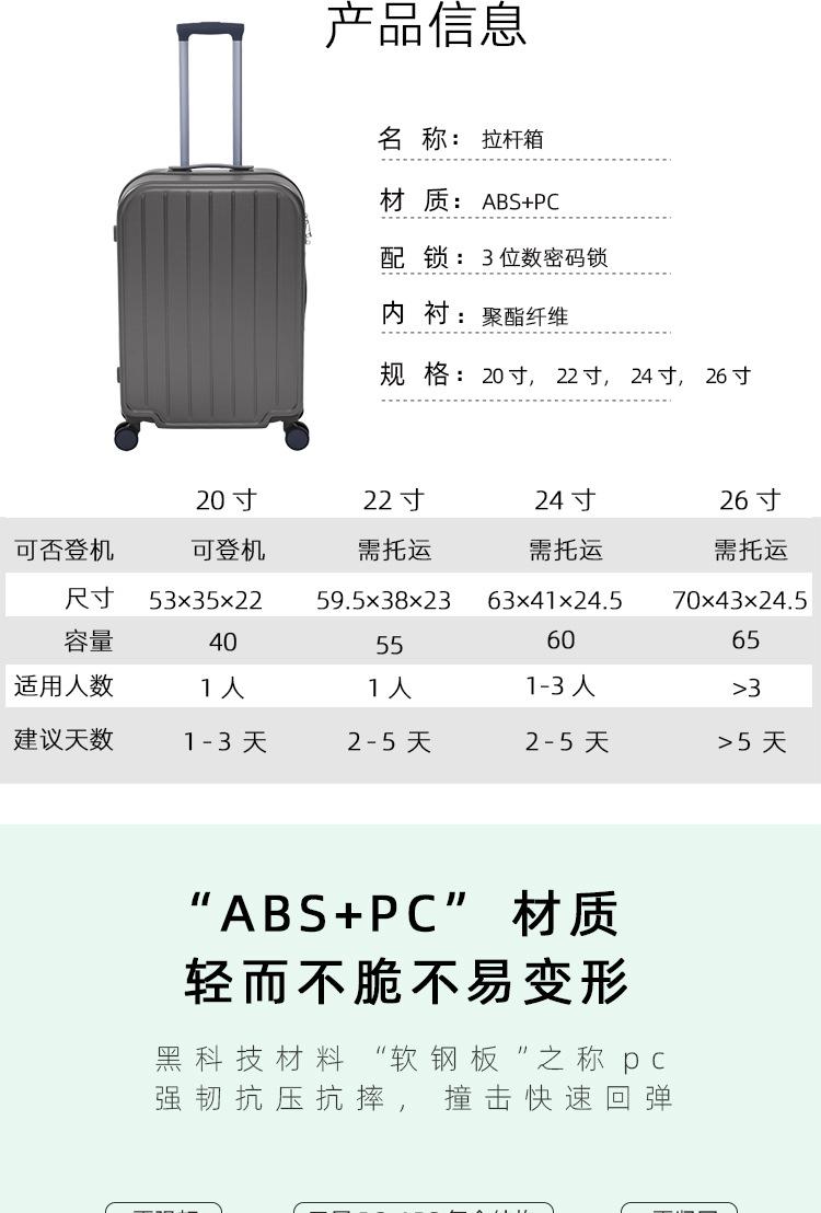 20 inch boarding box, 22 inch short trip, 24 inch for high school students, 26 inch for college students