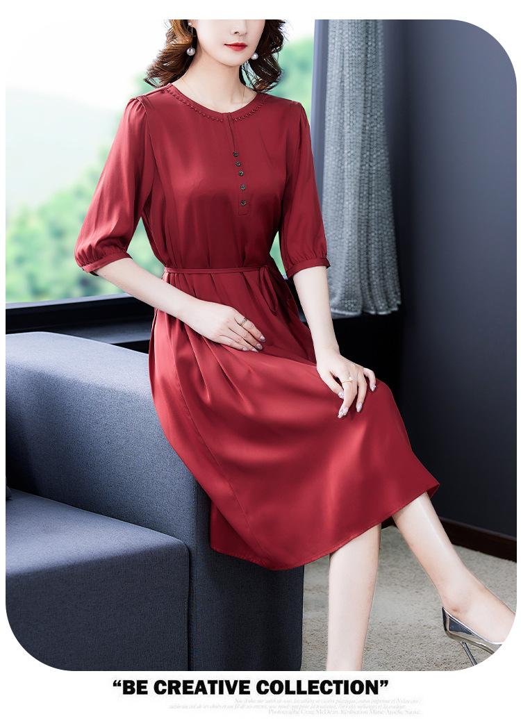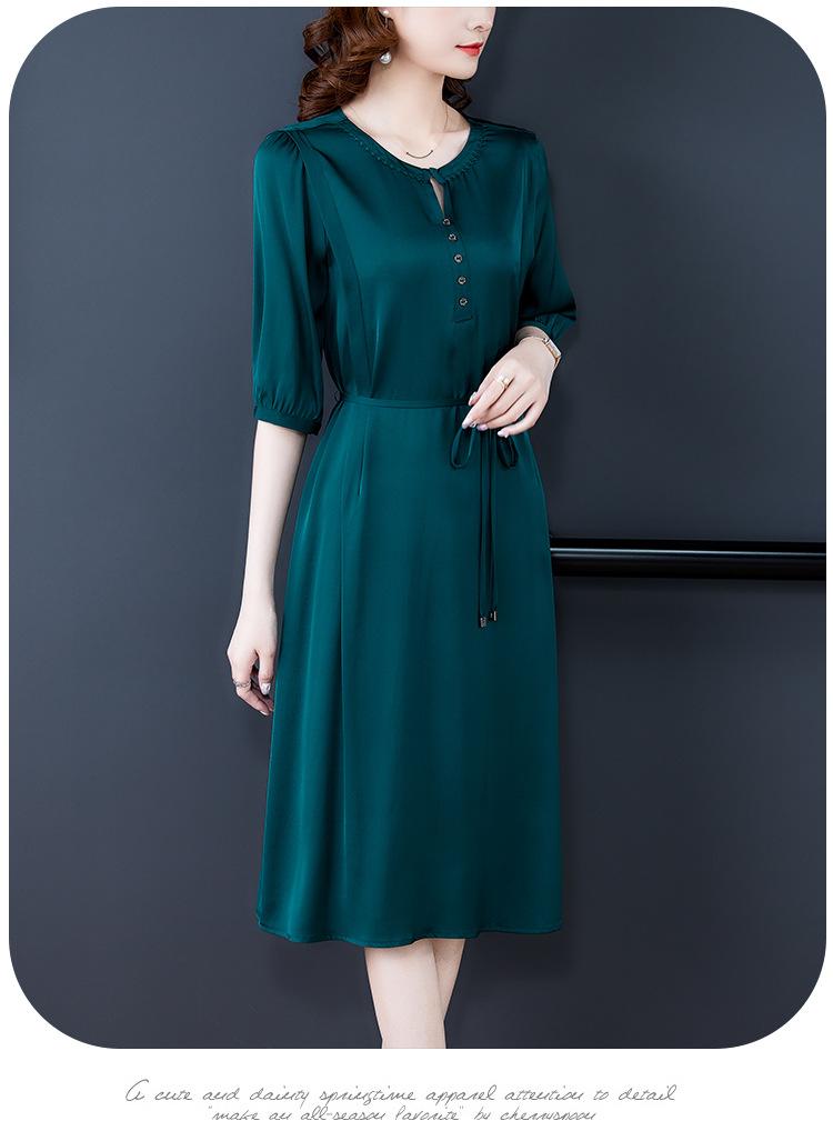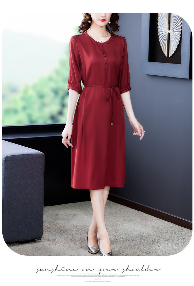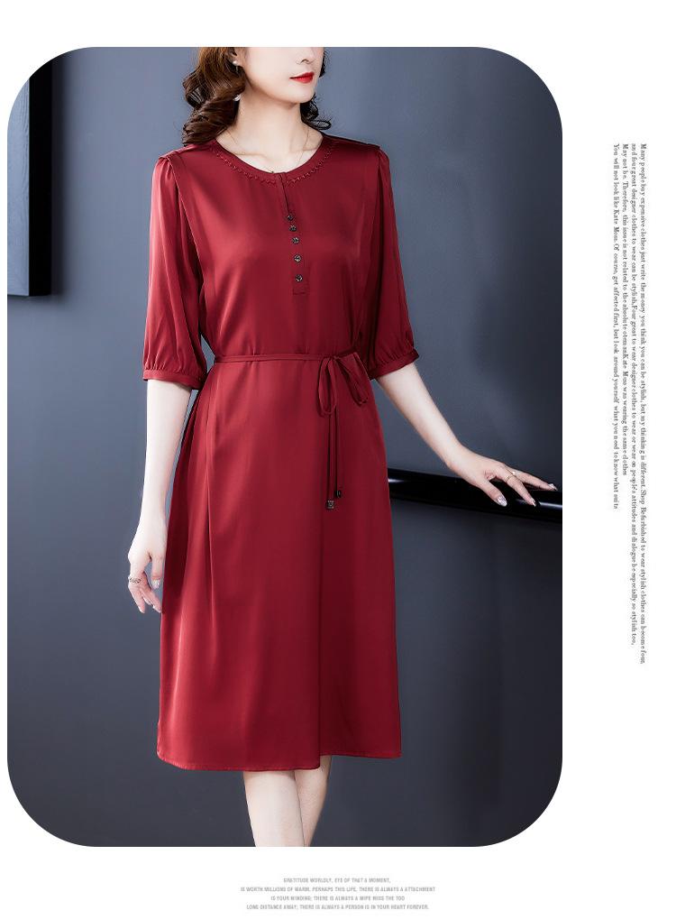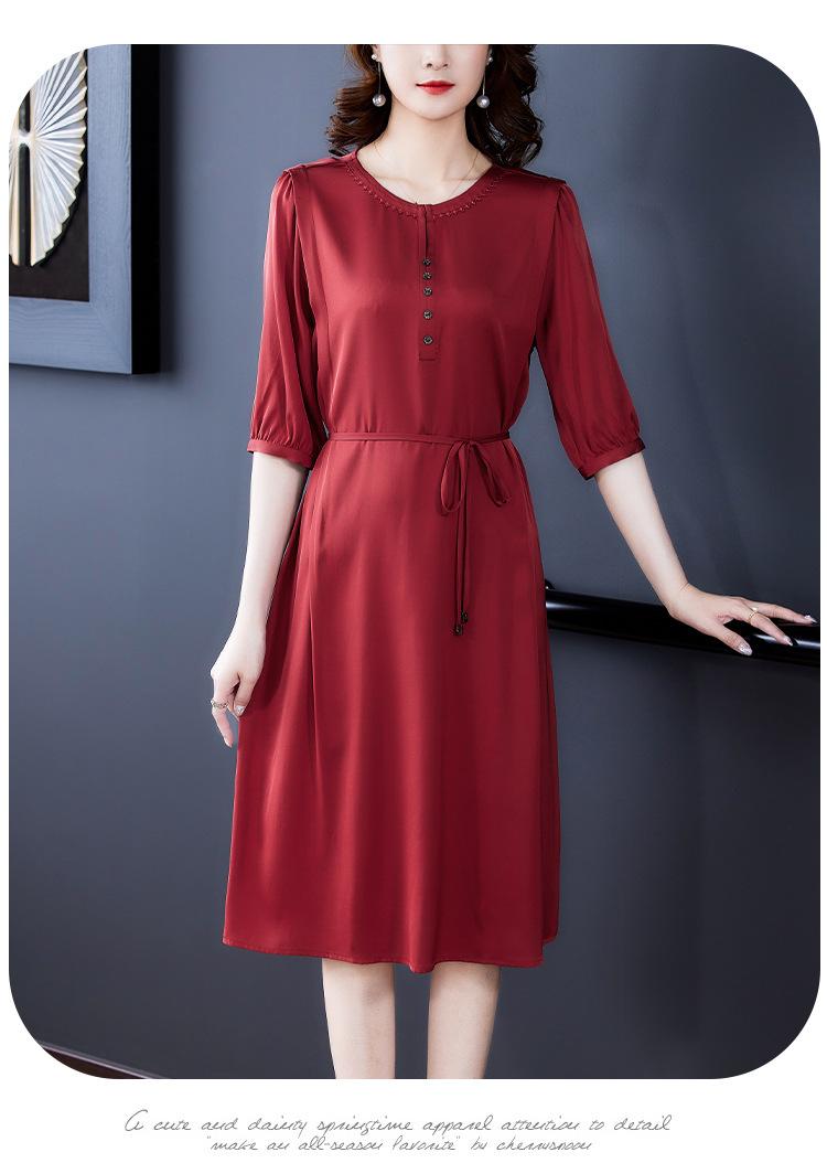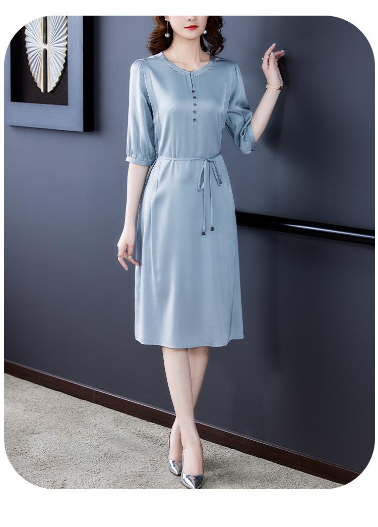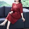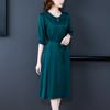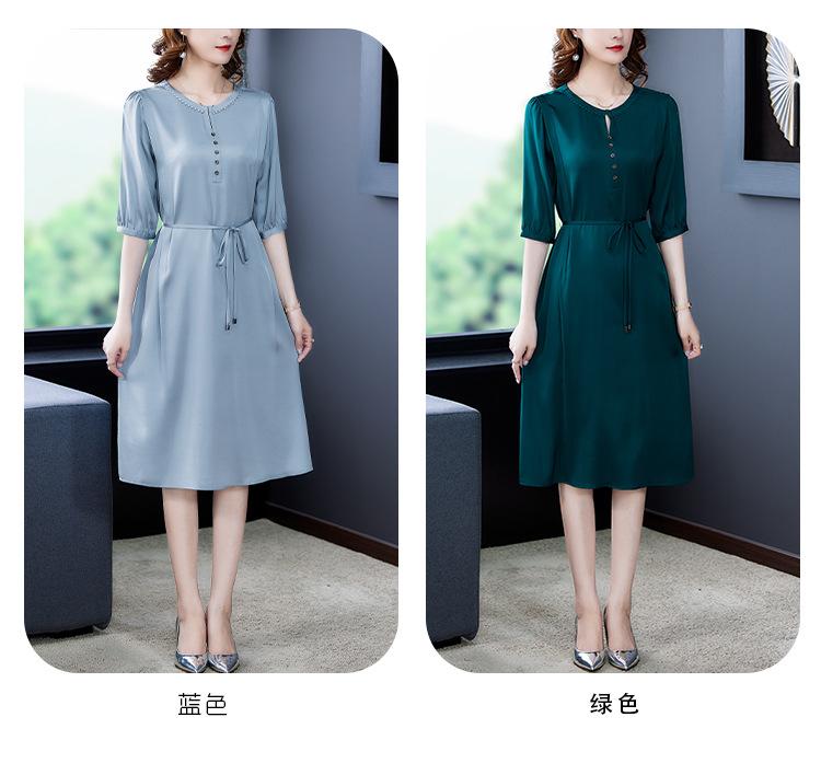 Vestido de Seda de Color Sólido con Cuello Redondo para Mujer 2023 Verano Nuevo Estilo Moda para Madre Retro Ajustado a la Cintura con Cordones Vestido Midi