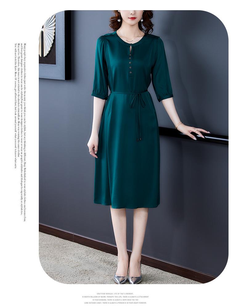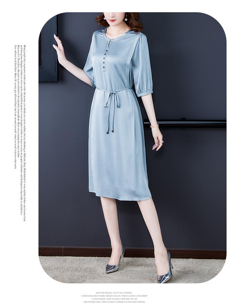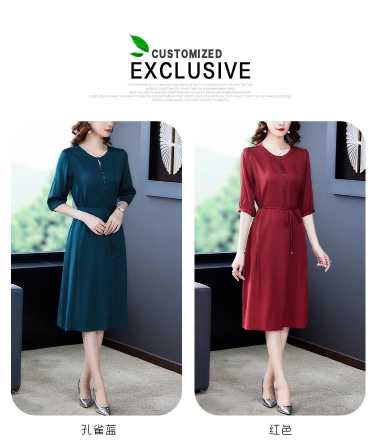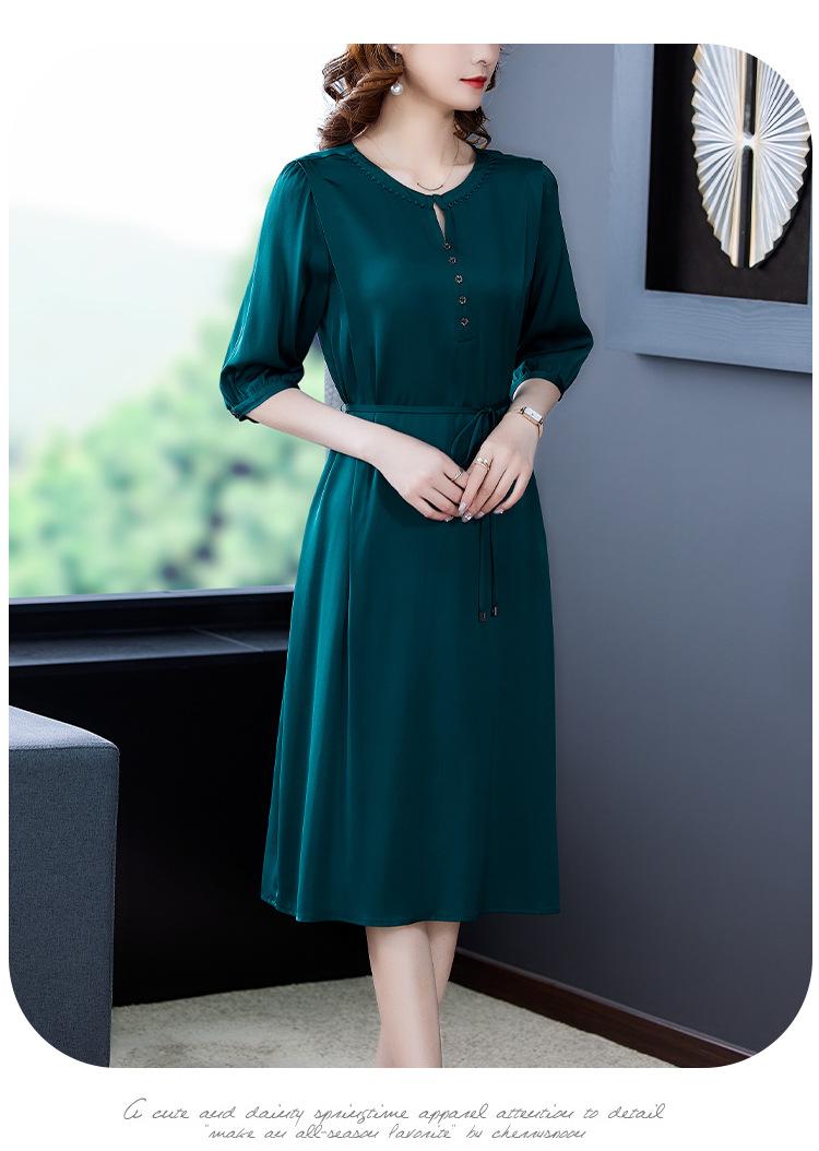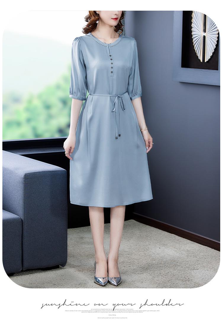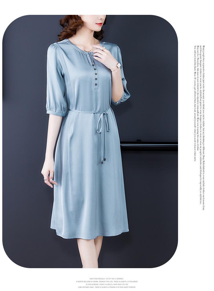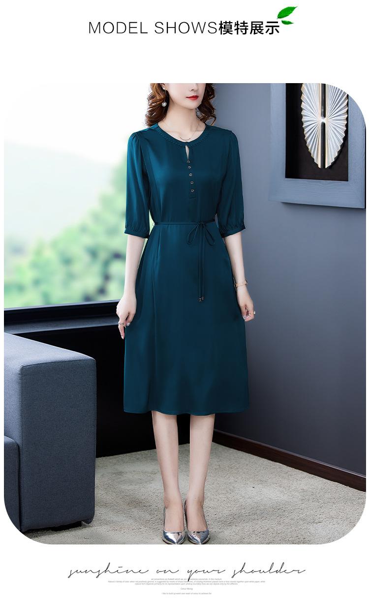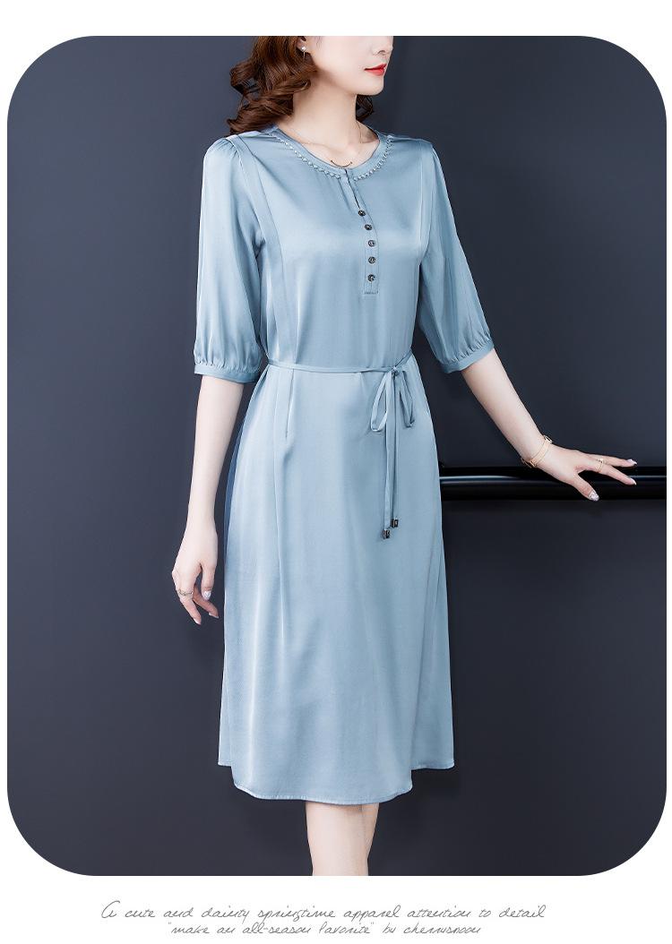Vestido de Seda de Color Sólido con Cuello Redondo para Mujer 2023 Verano Nuevo Estilo Moda para Madre Retro Ajustado a la Cintura con Cordones Vestido Midi