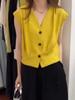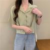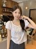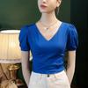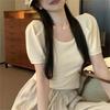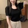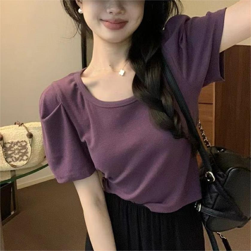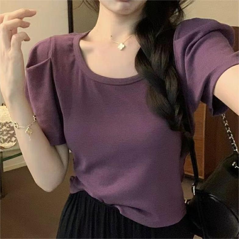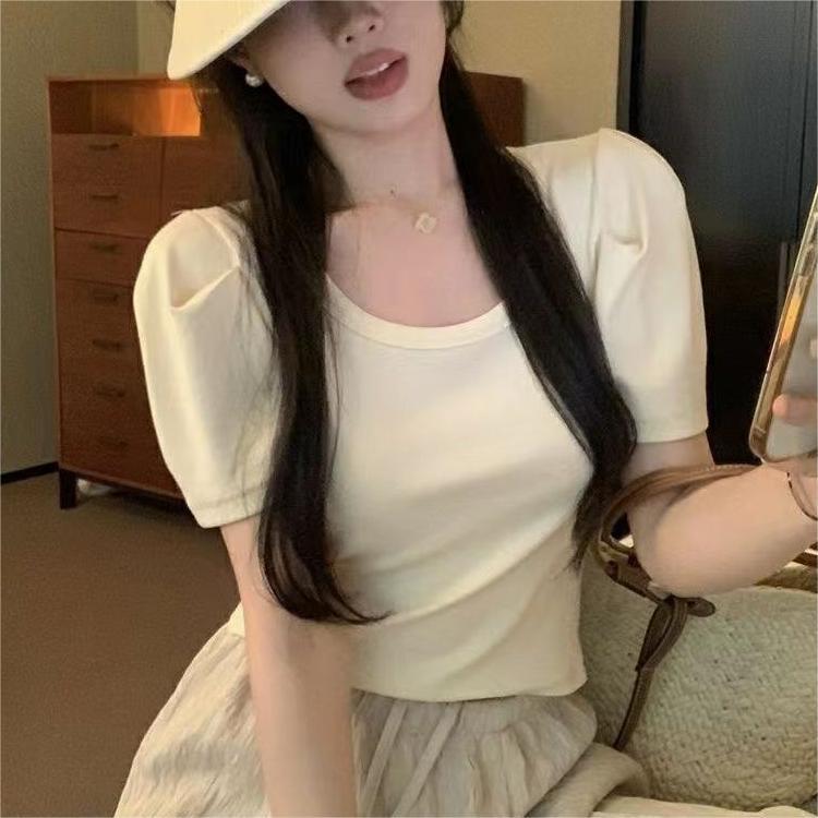 Camiseta de manga corta de verano 2023 para mujer, de color liso, con cuello corto, diseño de nicho, estilo casual, combina con todo, con mangas abullonadas