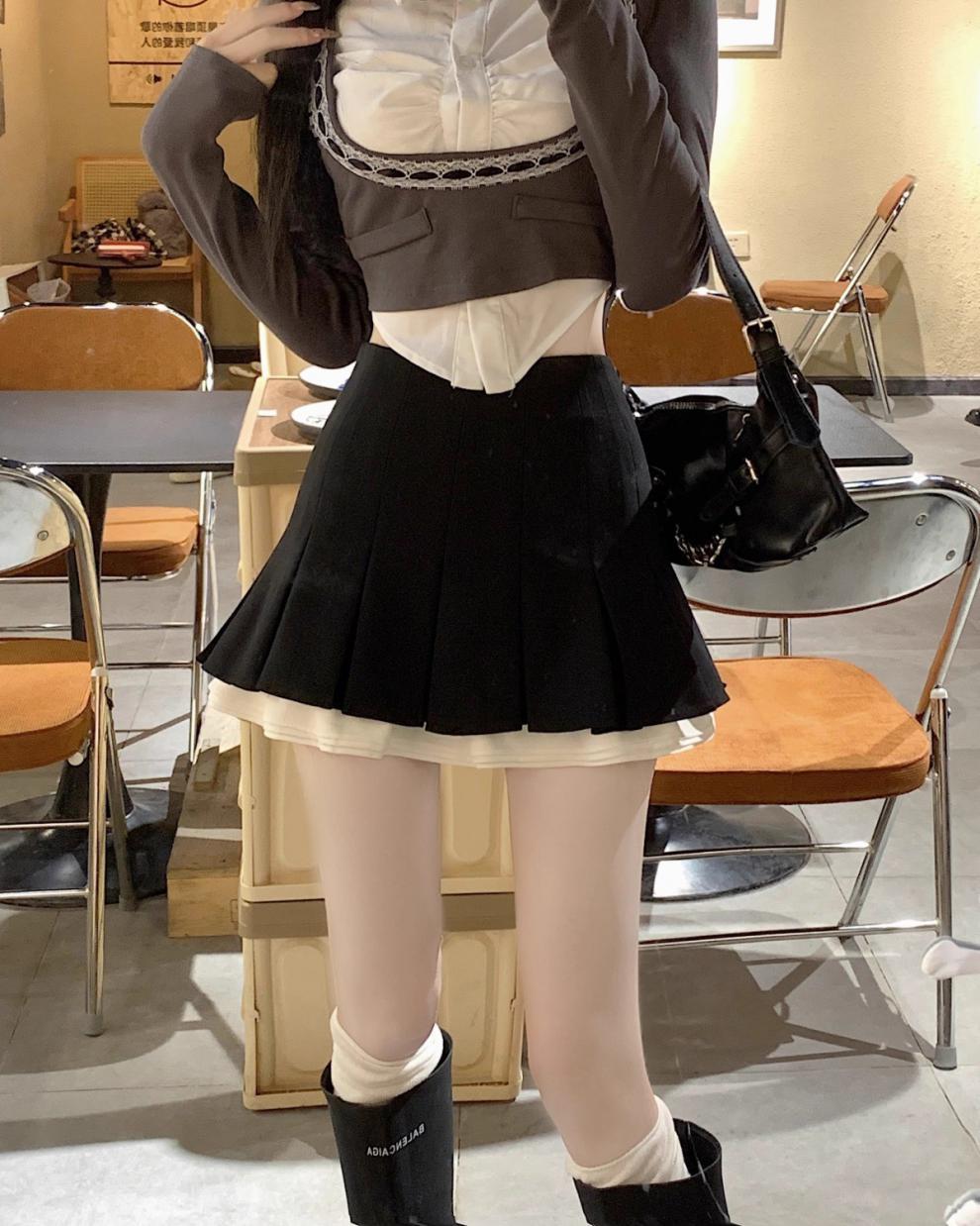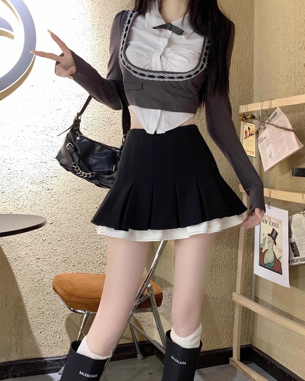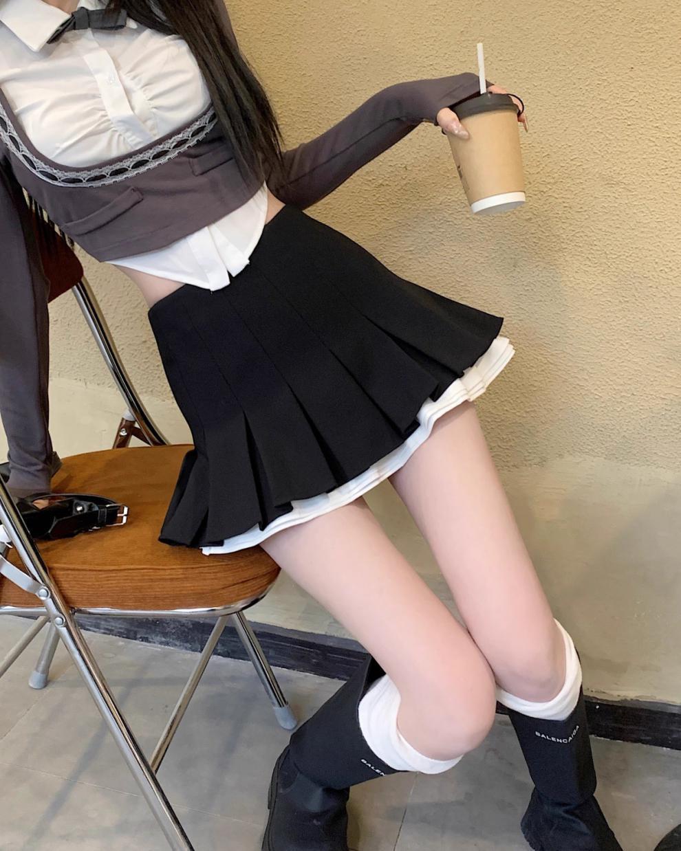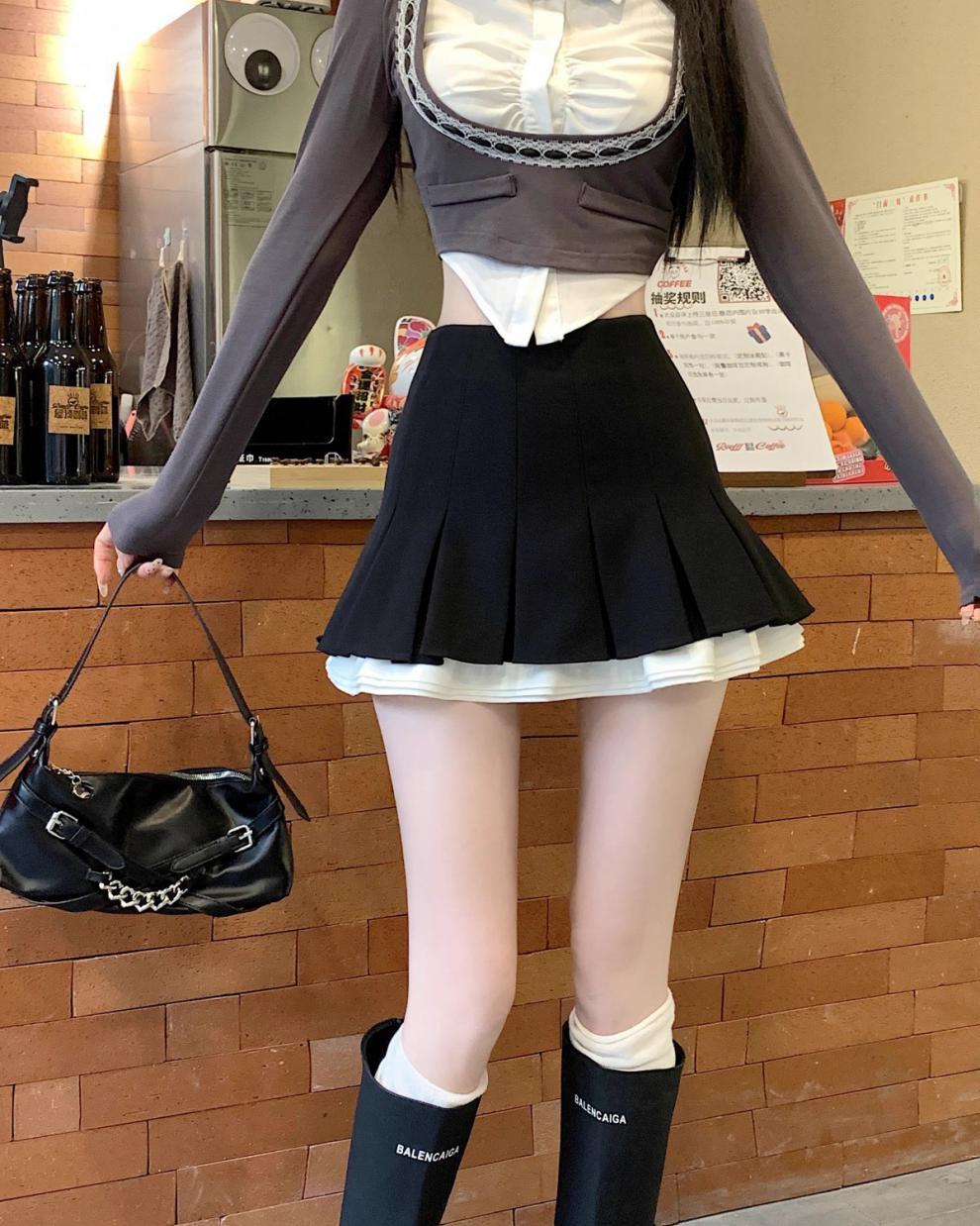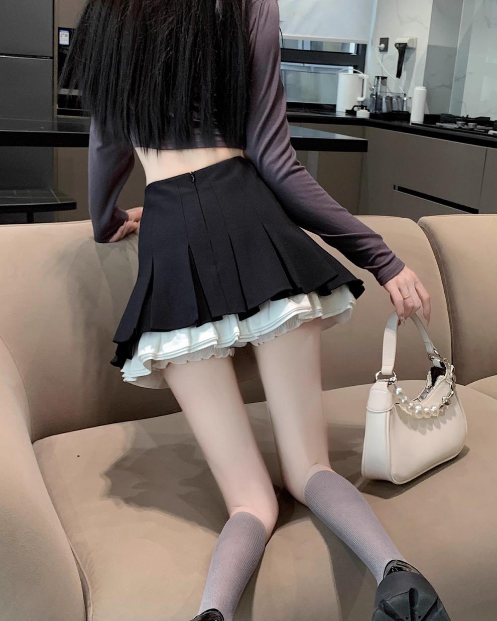 Falda Plisada de Verano para Mujer de Cintura Alta y Corte Ajustado con Costuras de Color en Contraste Dulce y Picante Negro Falda Corta Línea A Anti-transparente Spice Girl