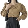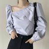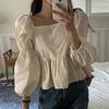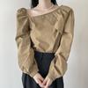 Camisa Coreana Chic de Primavera y Otoño Estilo Retro Escote Irregular Diseño Plisado Manga Abullonada Suelta para Mujer