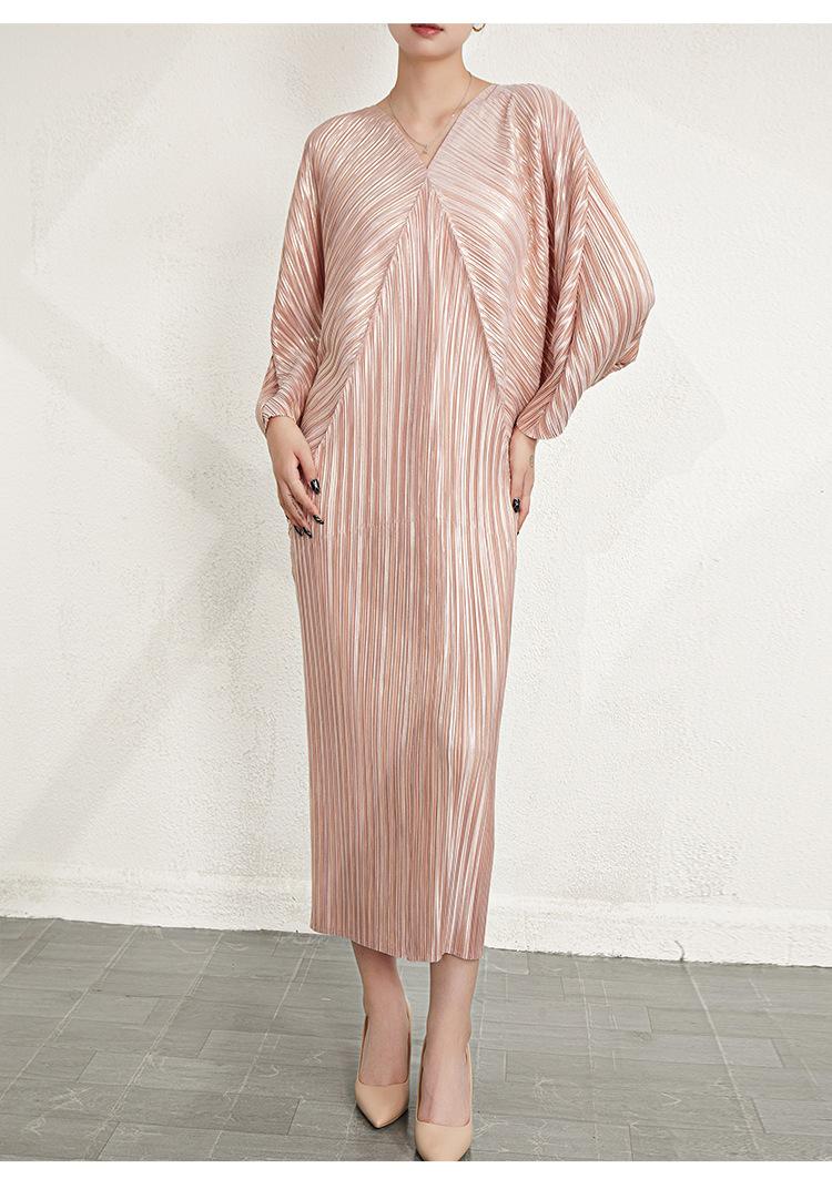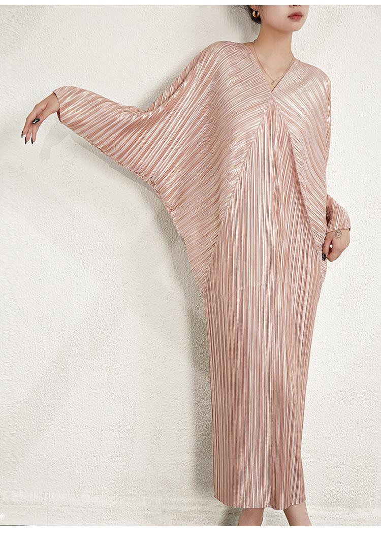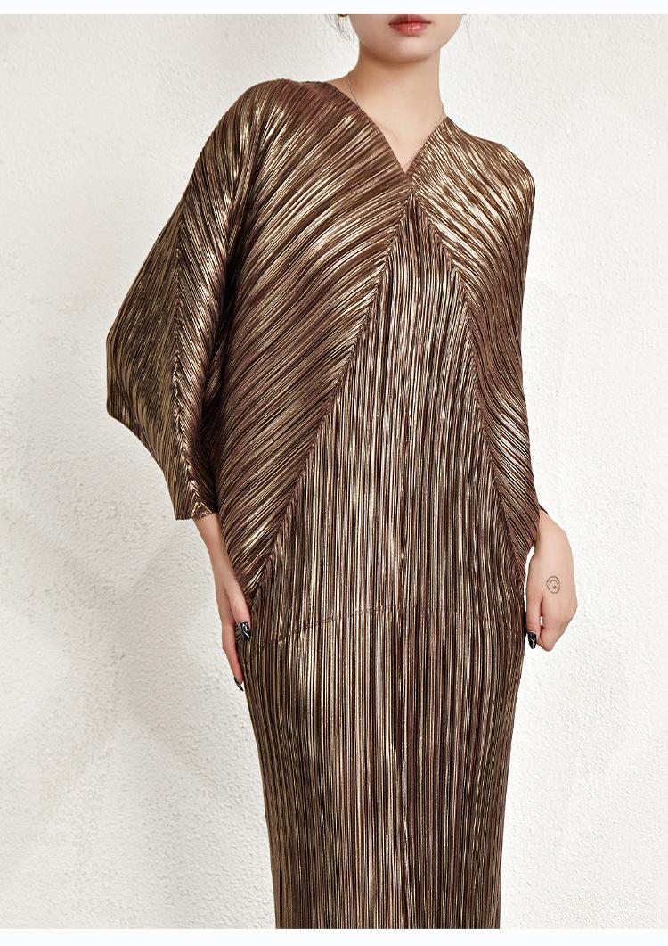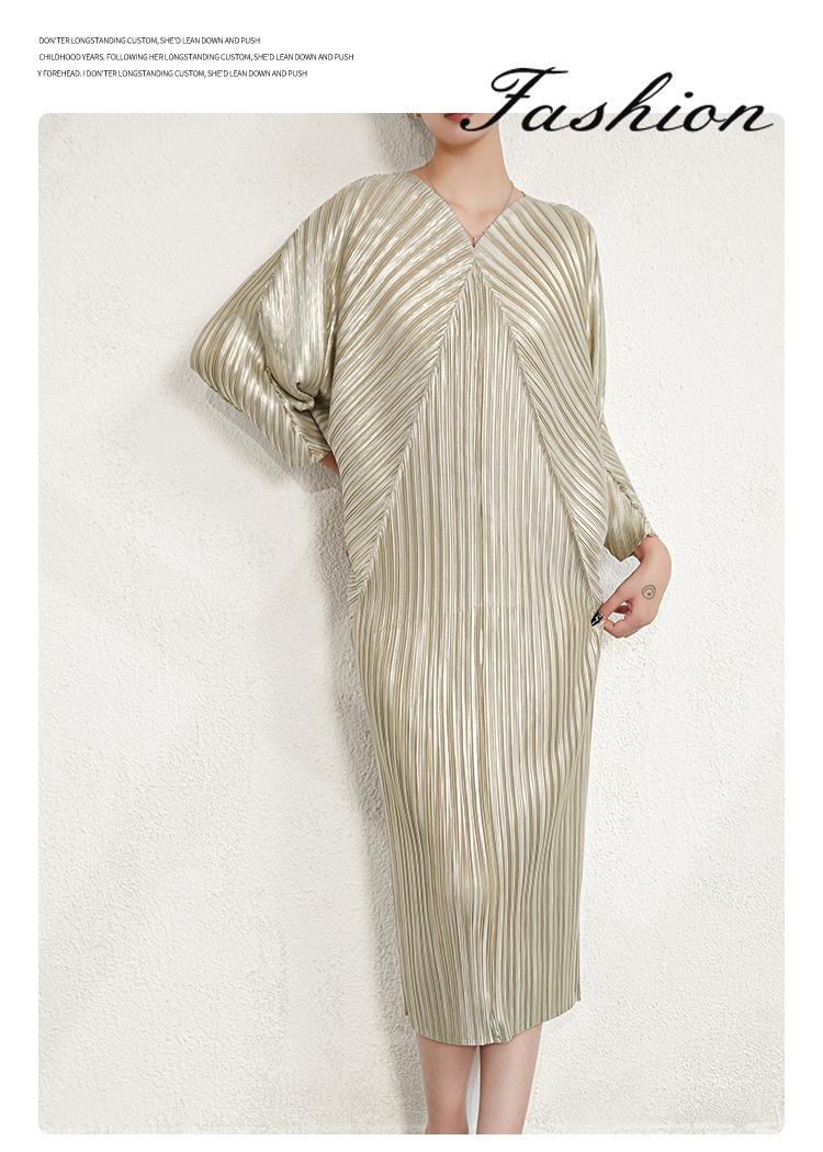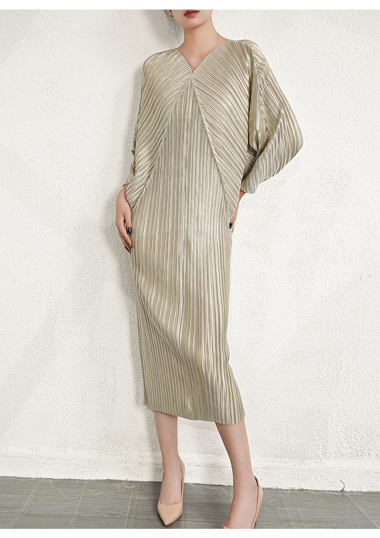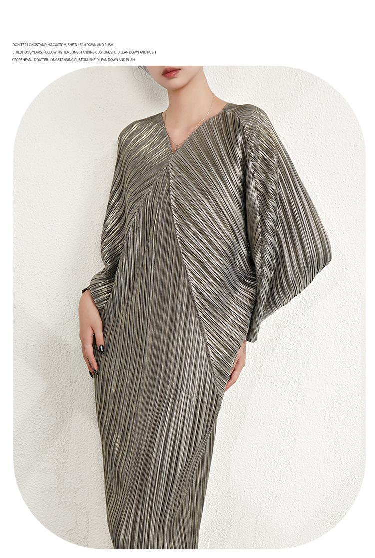 Vestido largo estilo francés con escote en V, mangas murciélago y ligero para mujer, estilo europeo y americano, talla grande, plisado, metálico, cintura alta, aspecto ajustado.