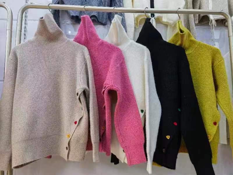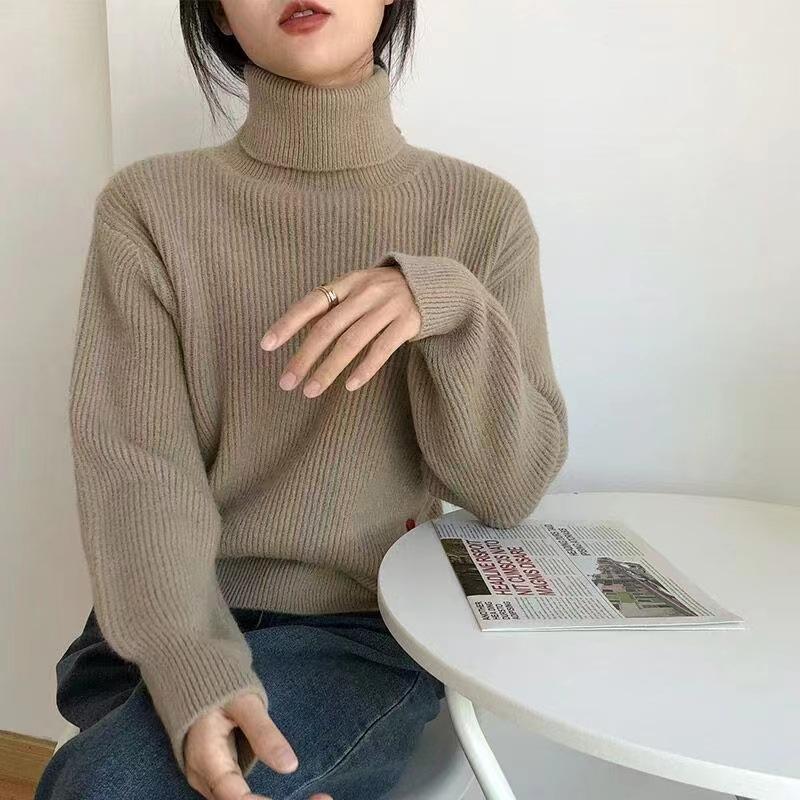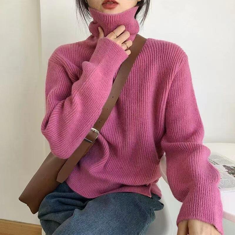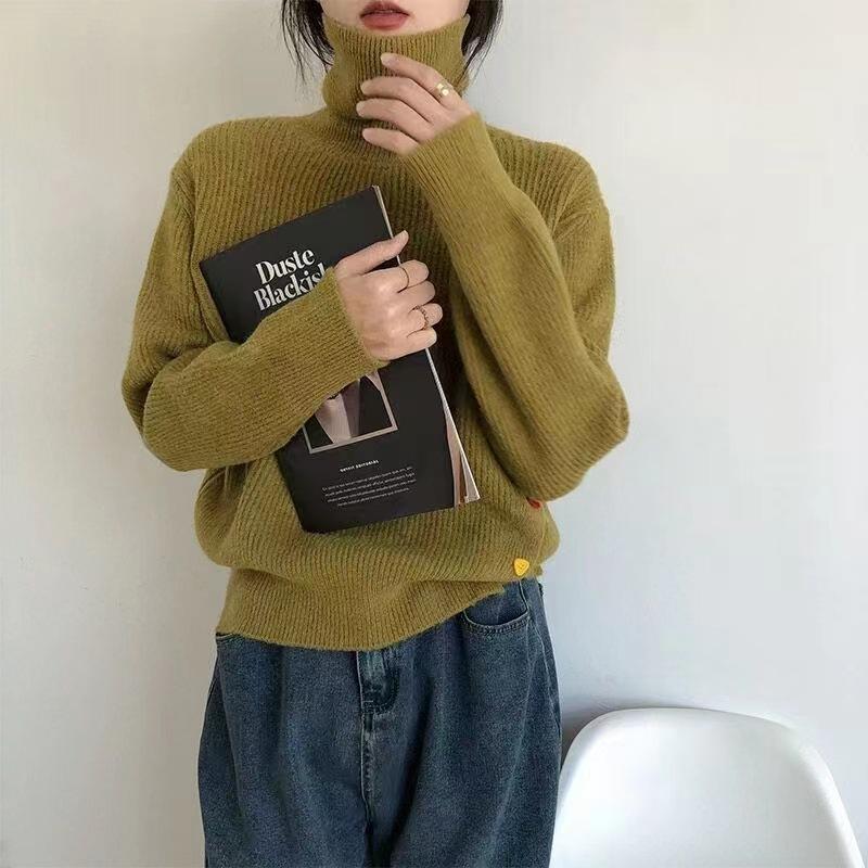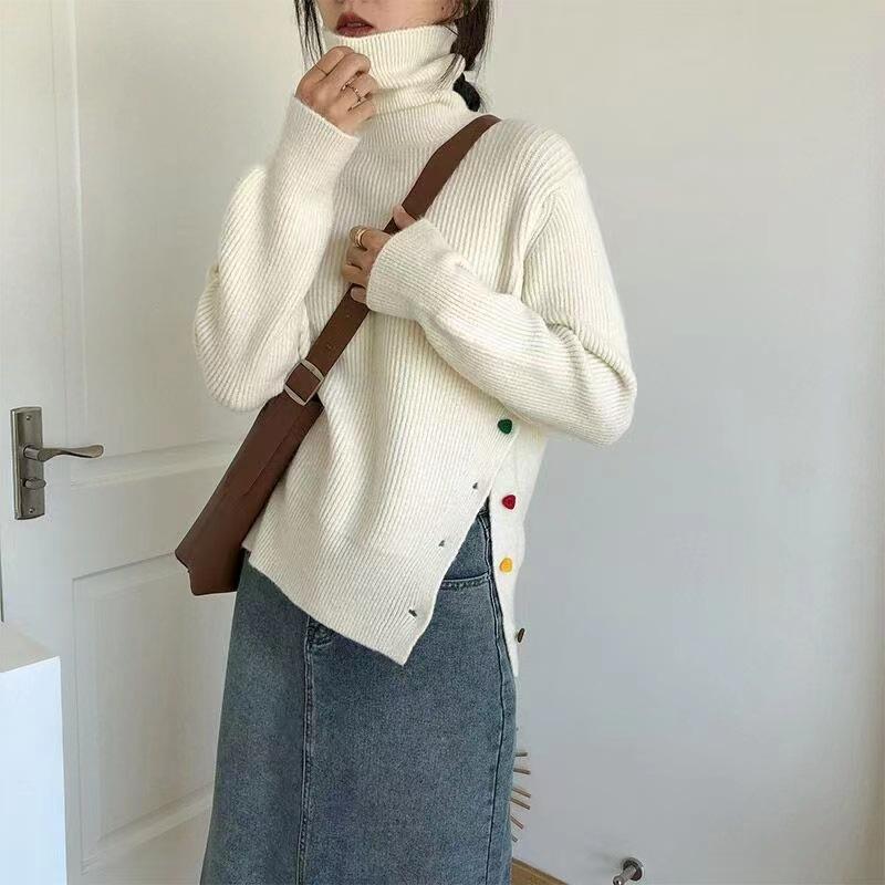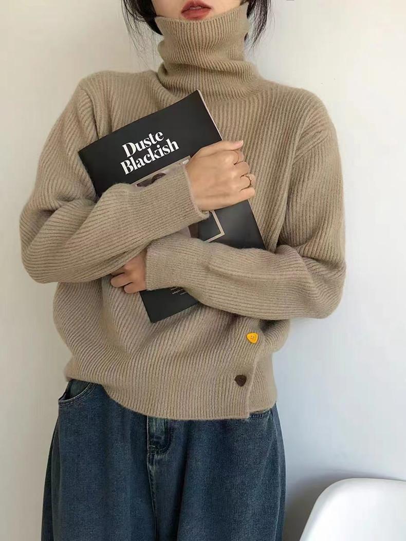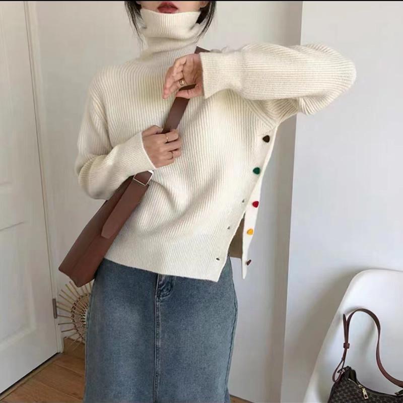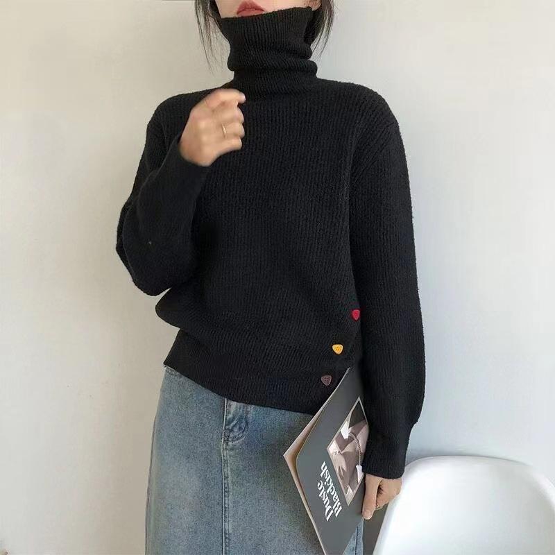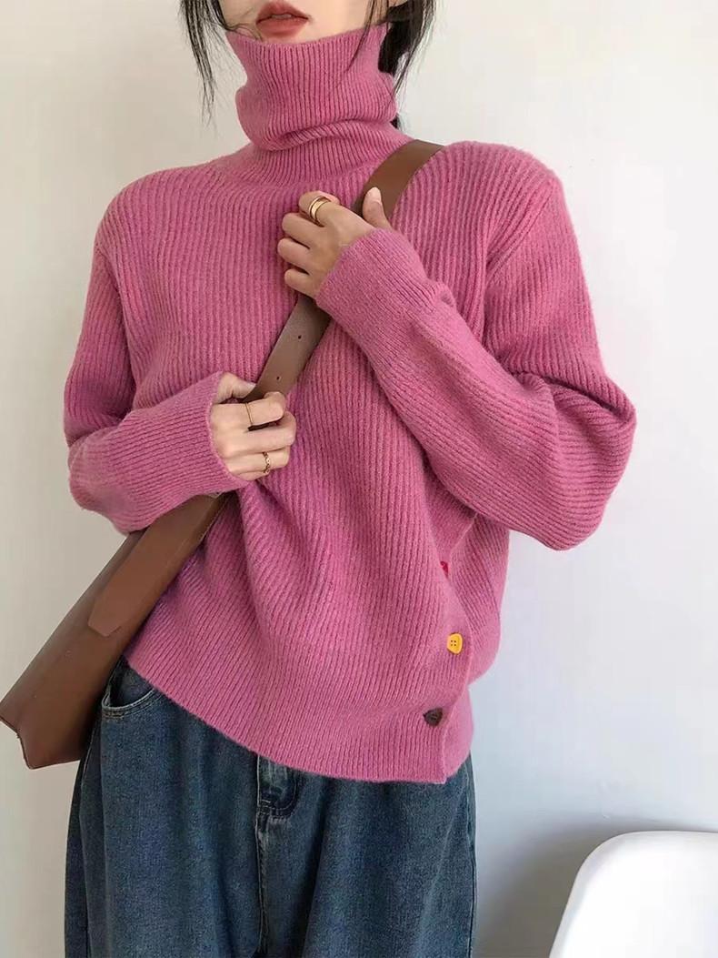 Suéter Elegante de Cuello Alto con Botones Laterales a Color para Mujer, Suave y Holgado, Pulóver Grueso Camiseta Base para Otoño e Invierno Nuevas Llegadas