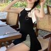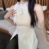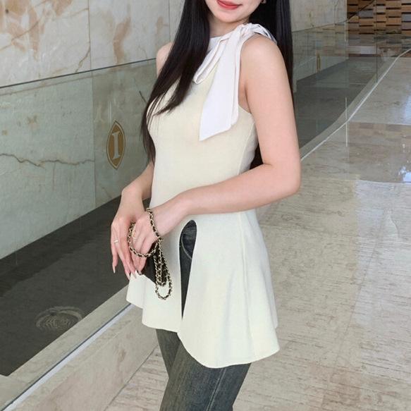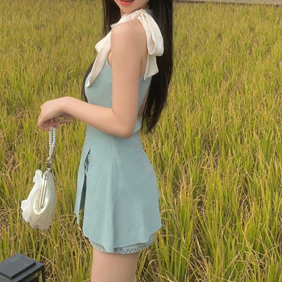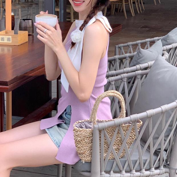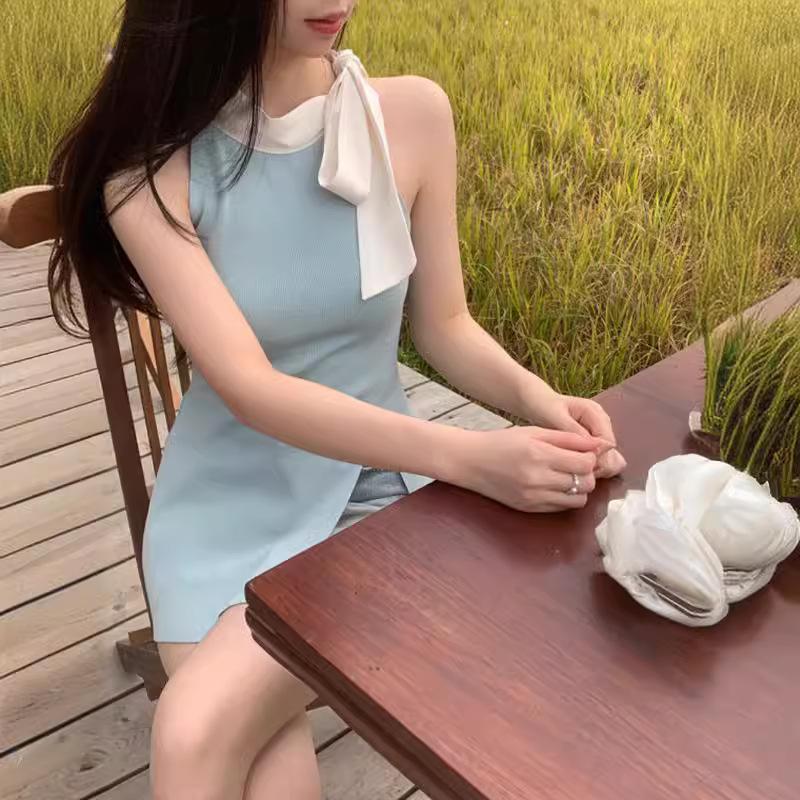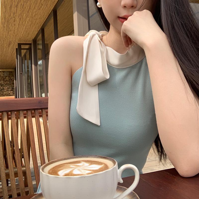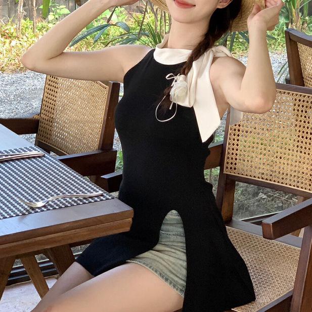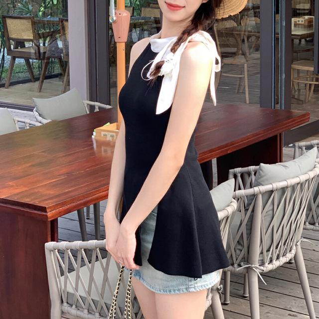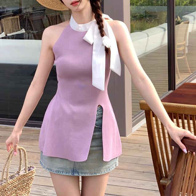 Chaleco sin mangas con cuello colgante y tirantes de lazo a juego de colores para mujer, prenda exterior de verano, top de base entallada con abertura sexy y puro
