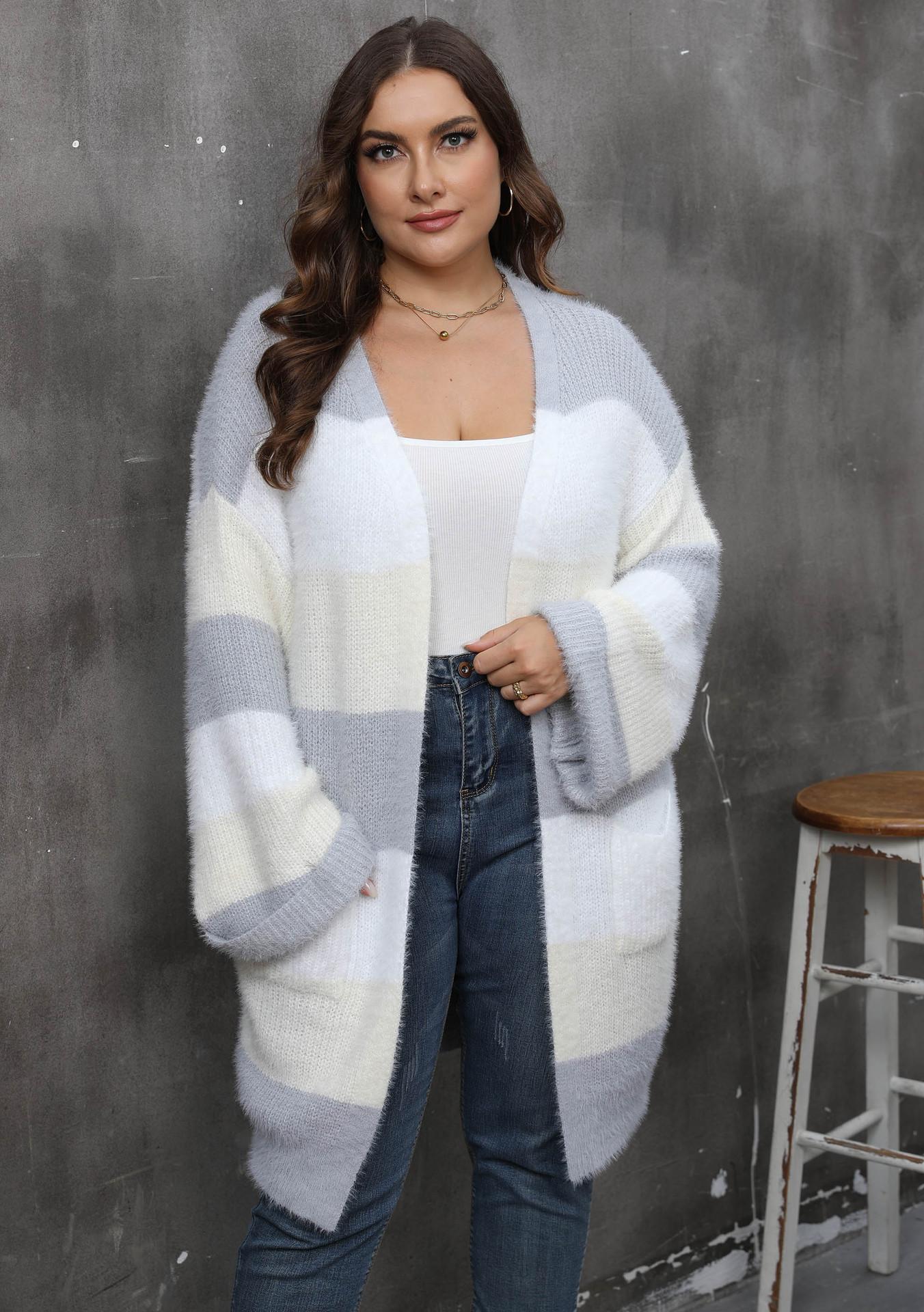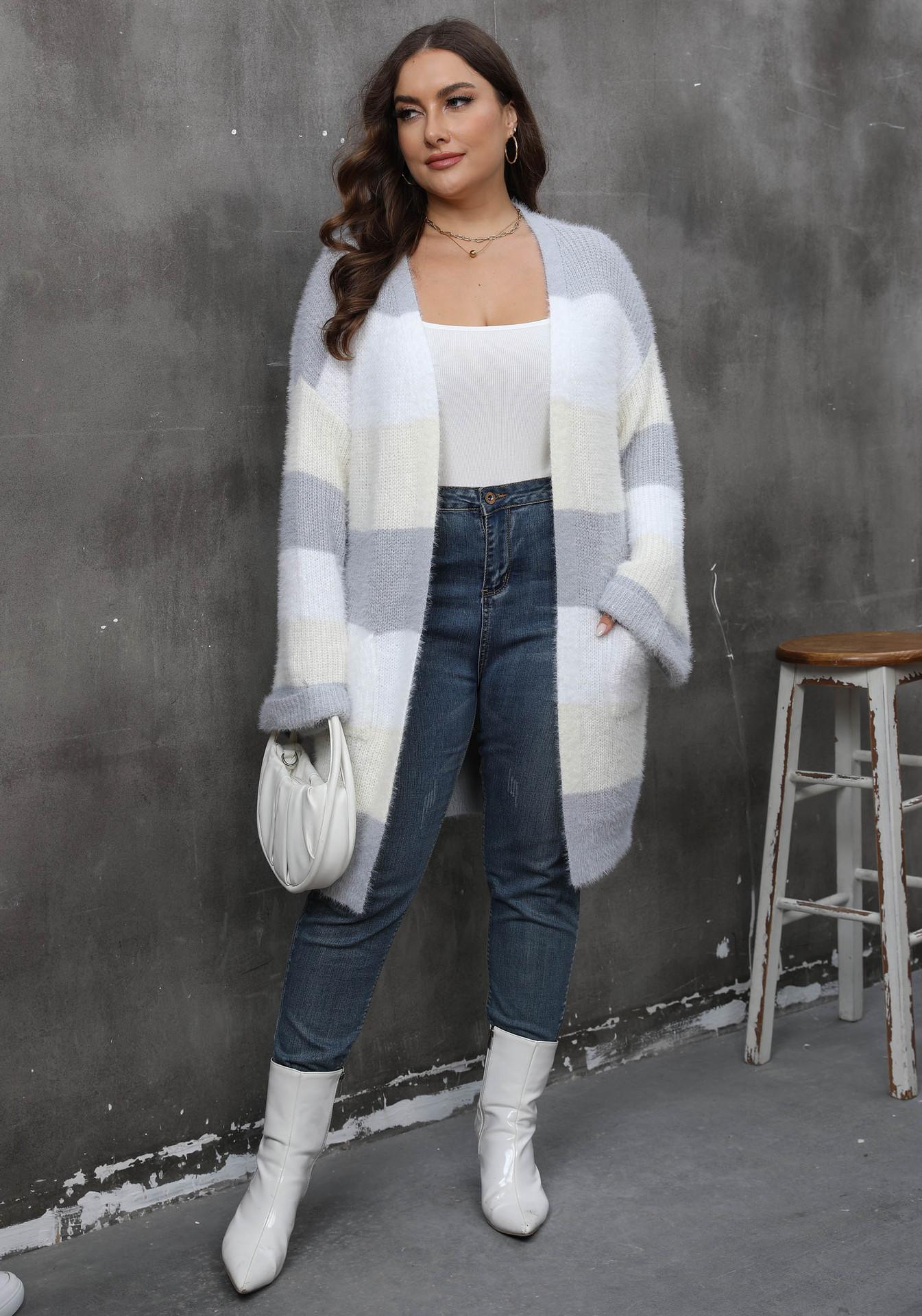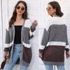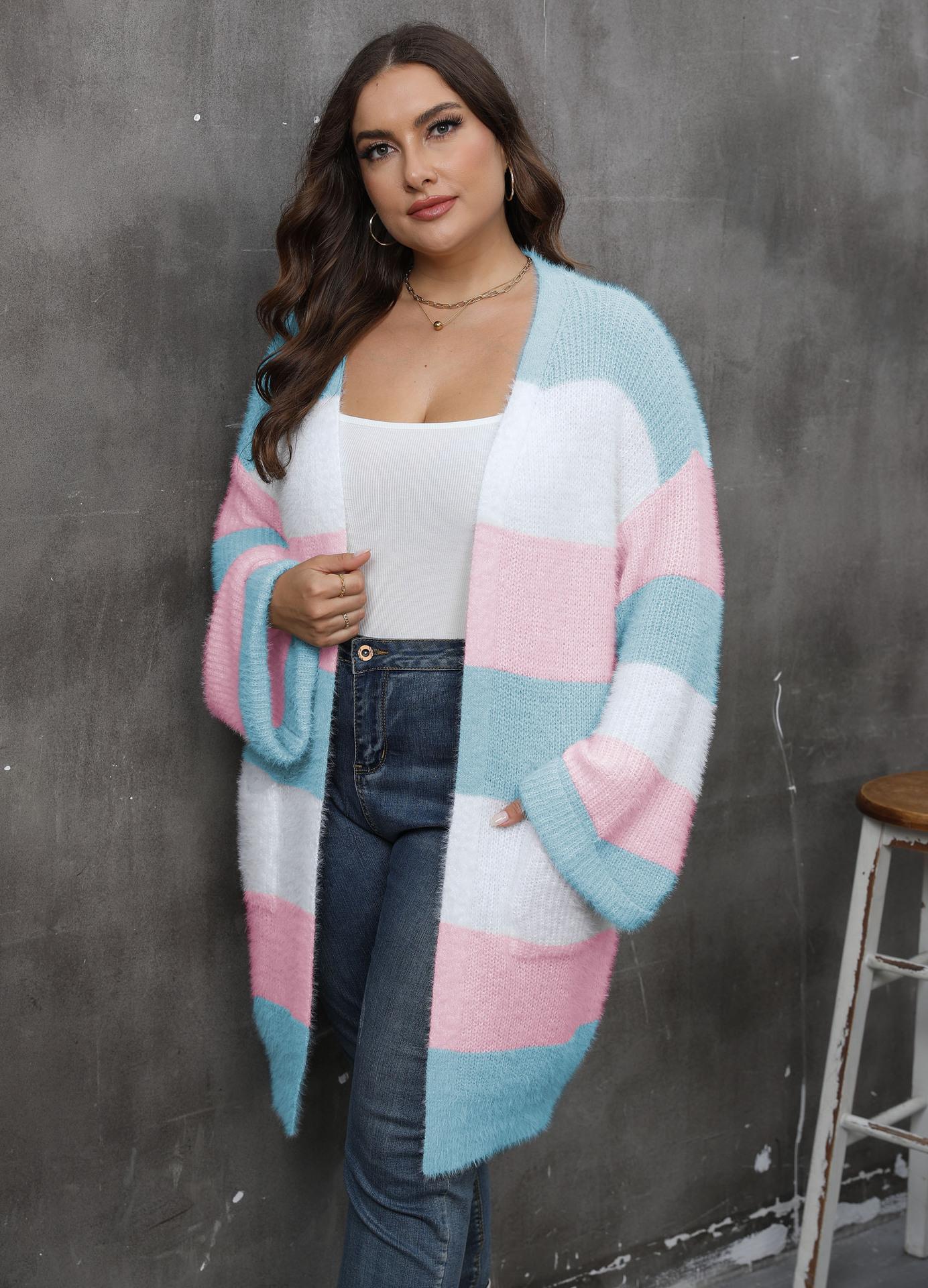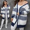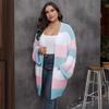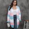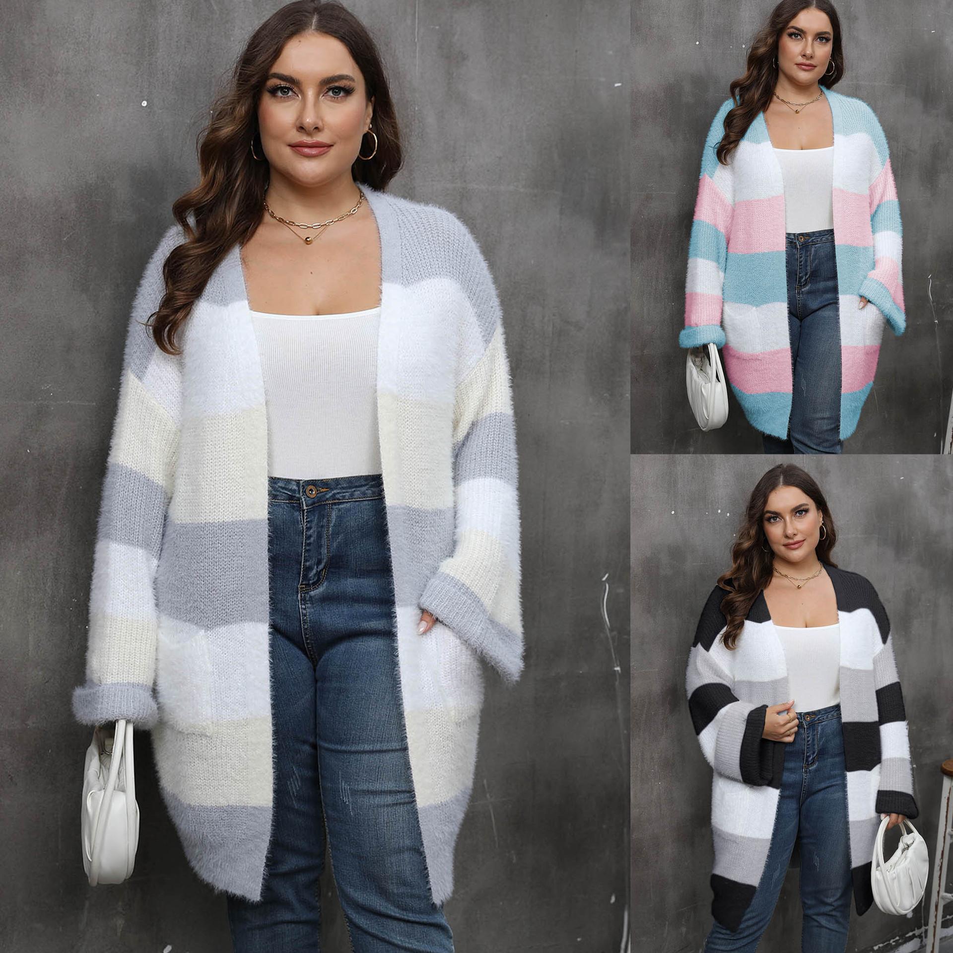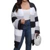 Cárdigan de mujer, talla grande europea y americana, con costuras en contraste de color, tejido entre colores, chaqueta de rayas con doble bolsillo.