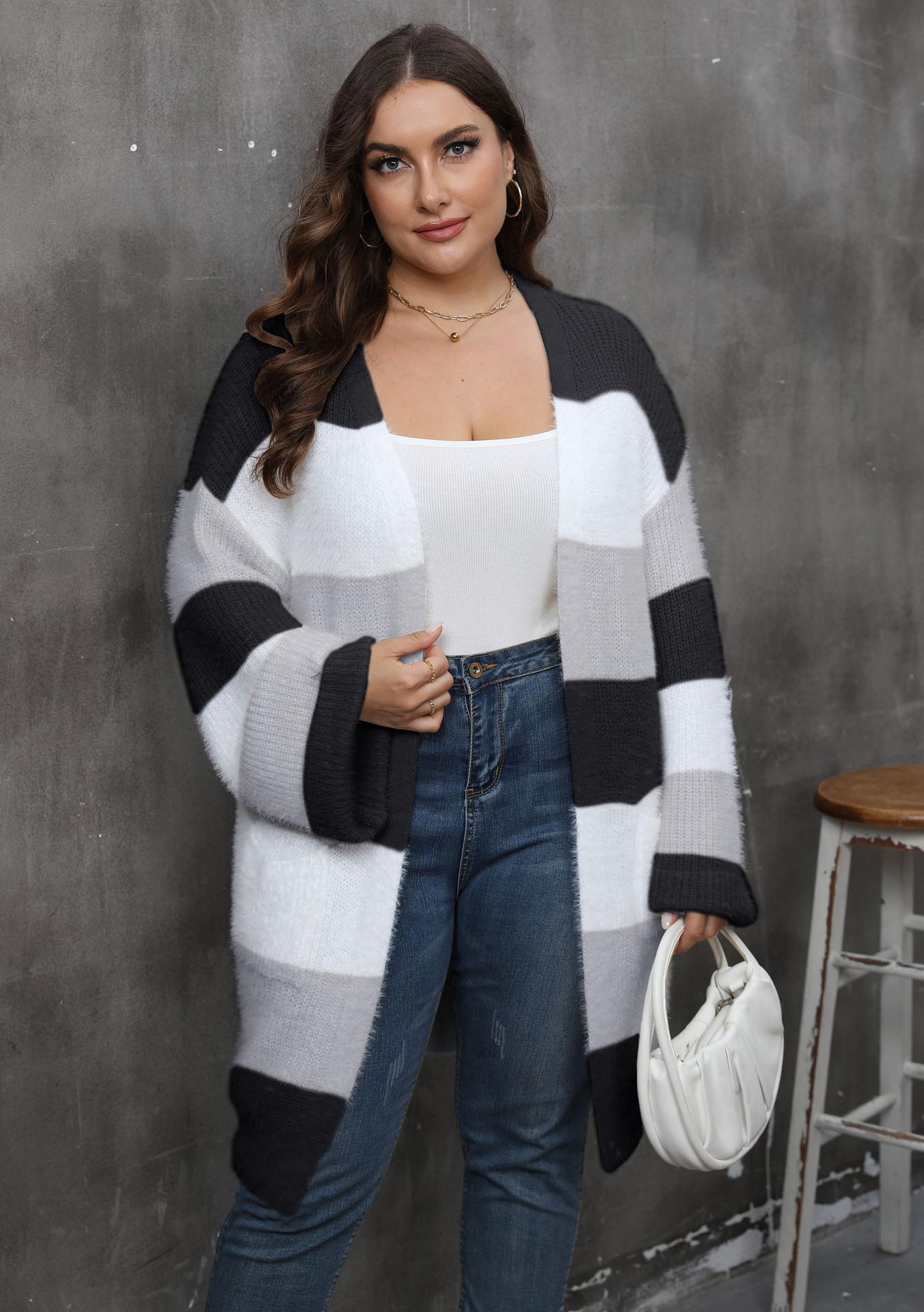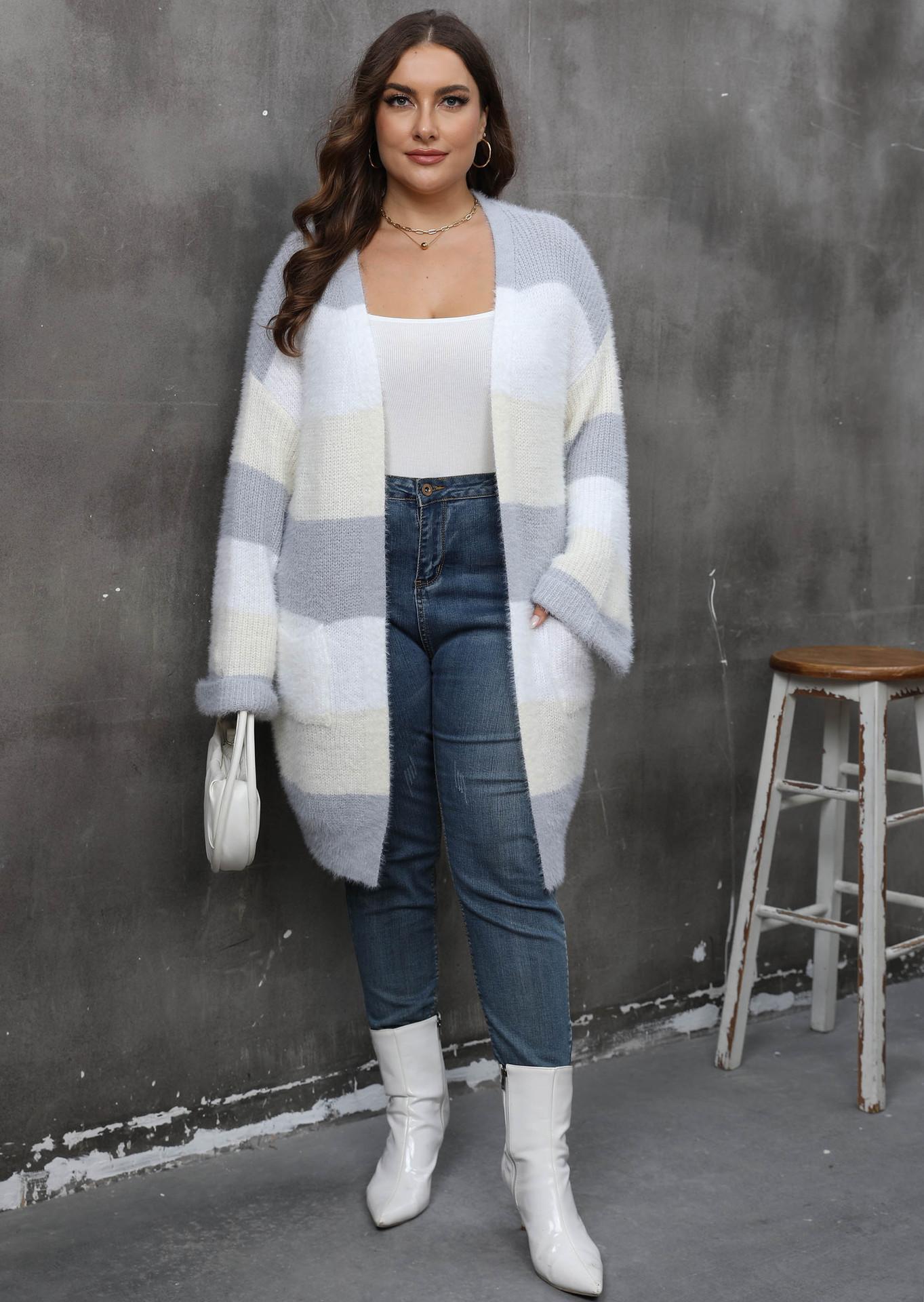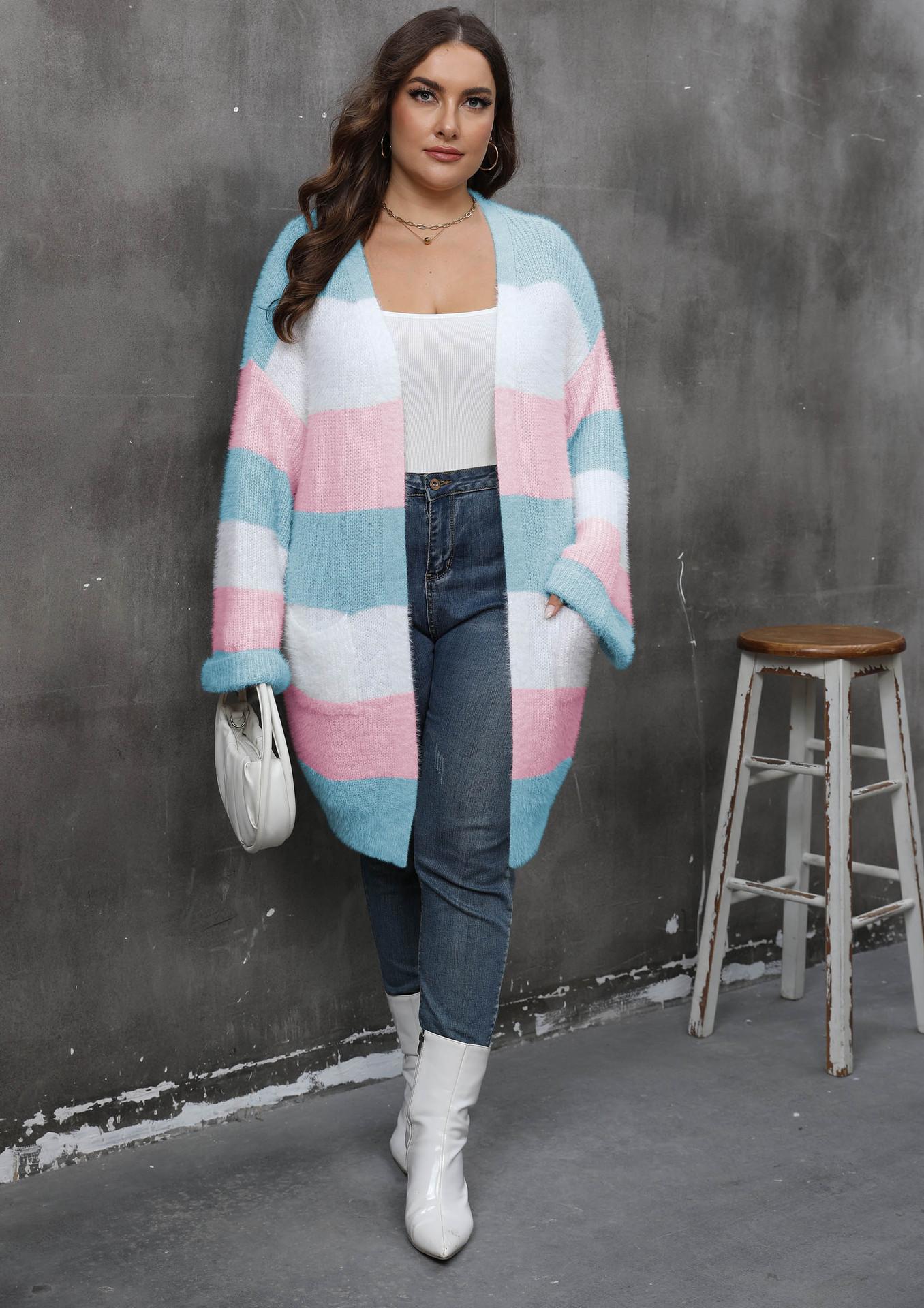Cárdigan de mujer, talla grande europea y americana, con costuras en contraste de color, tejido entre colores, chaqueta de rayas con doble bolsillo.
