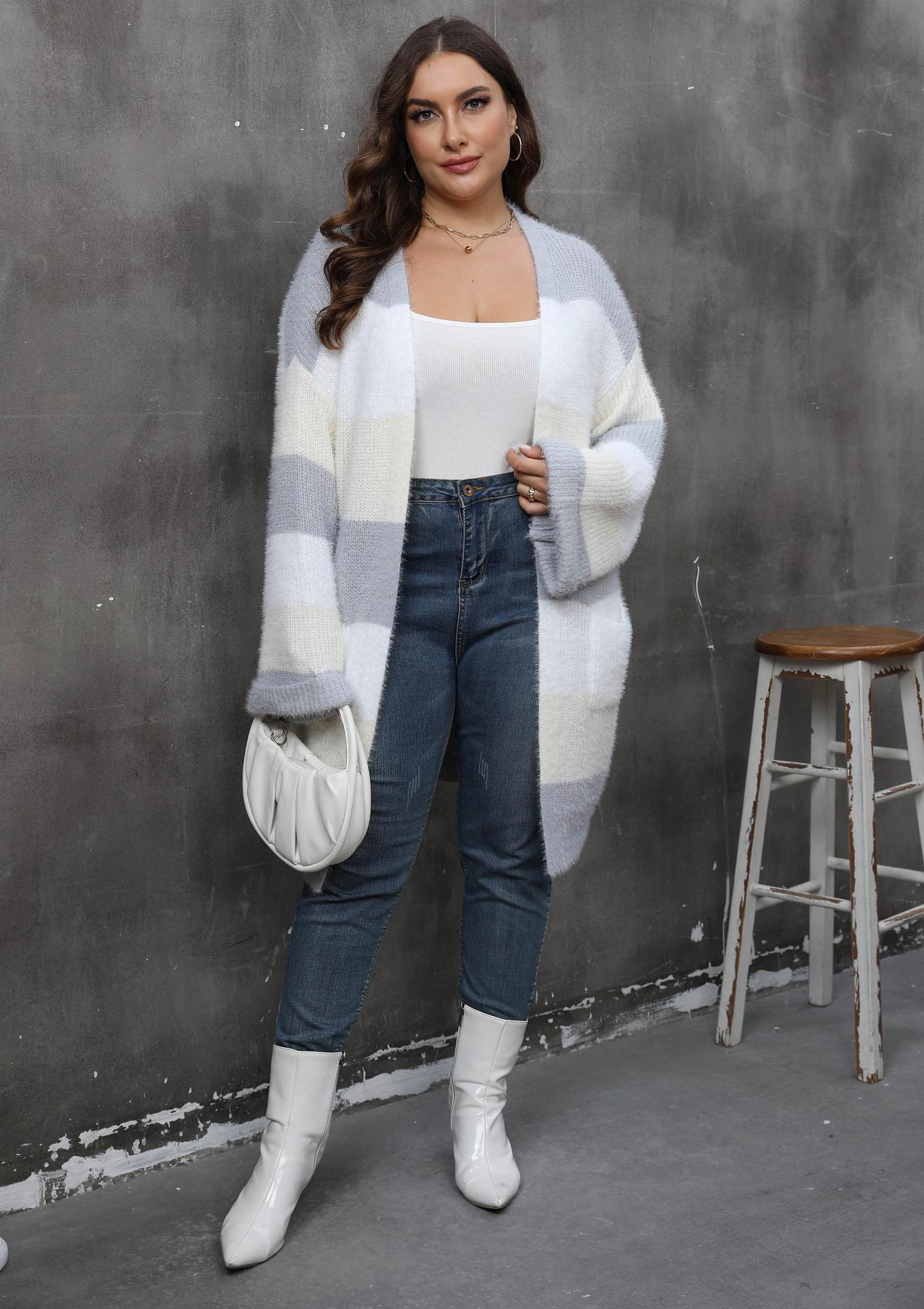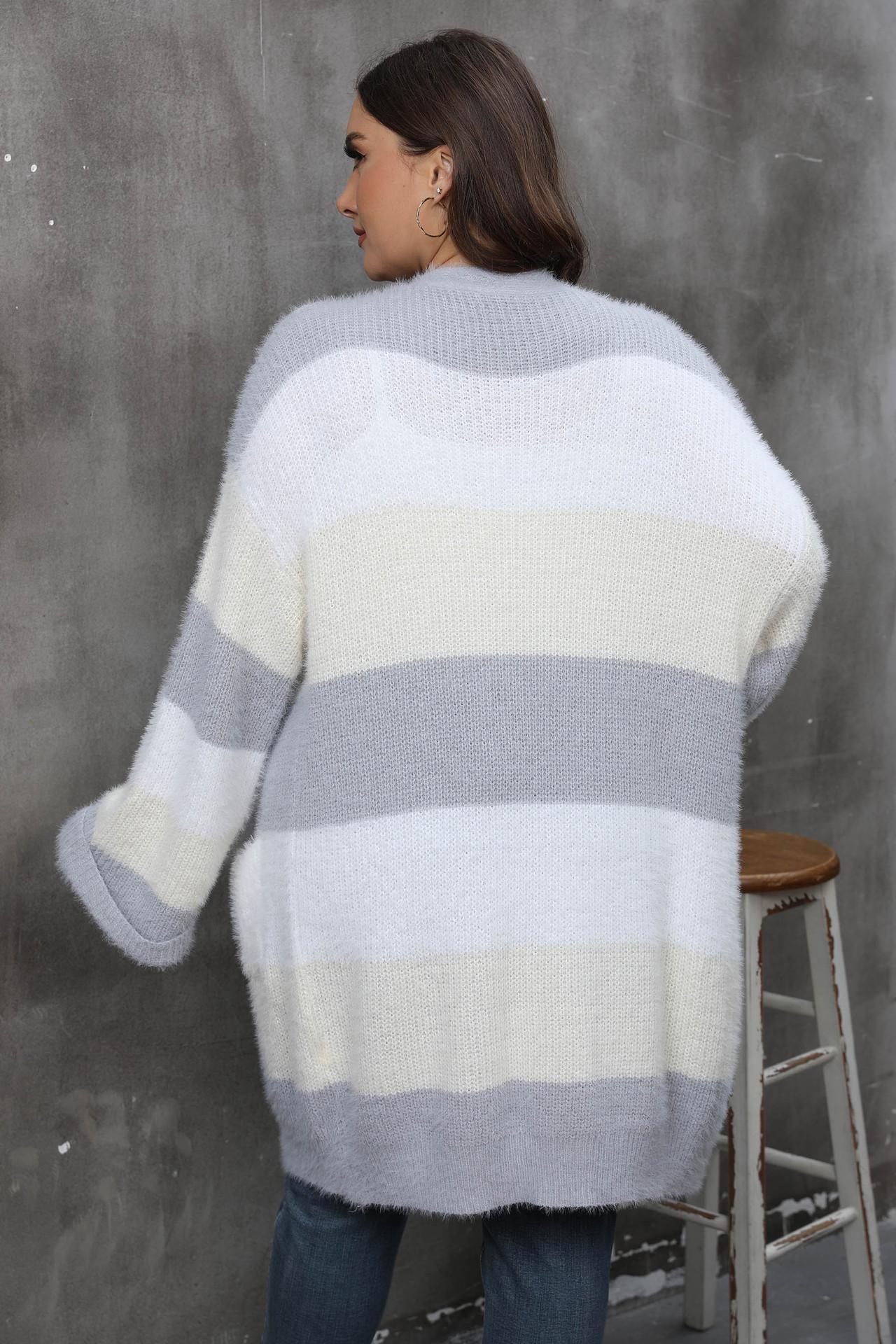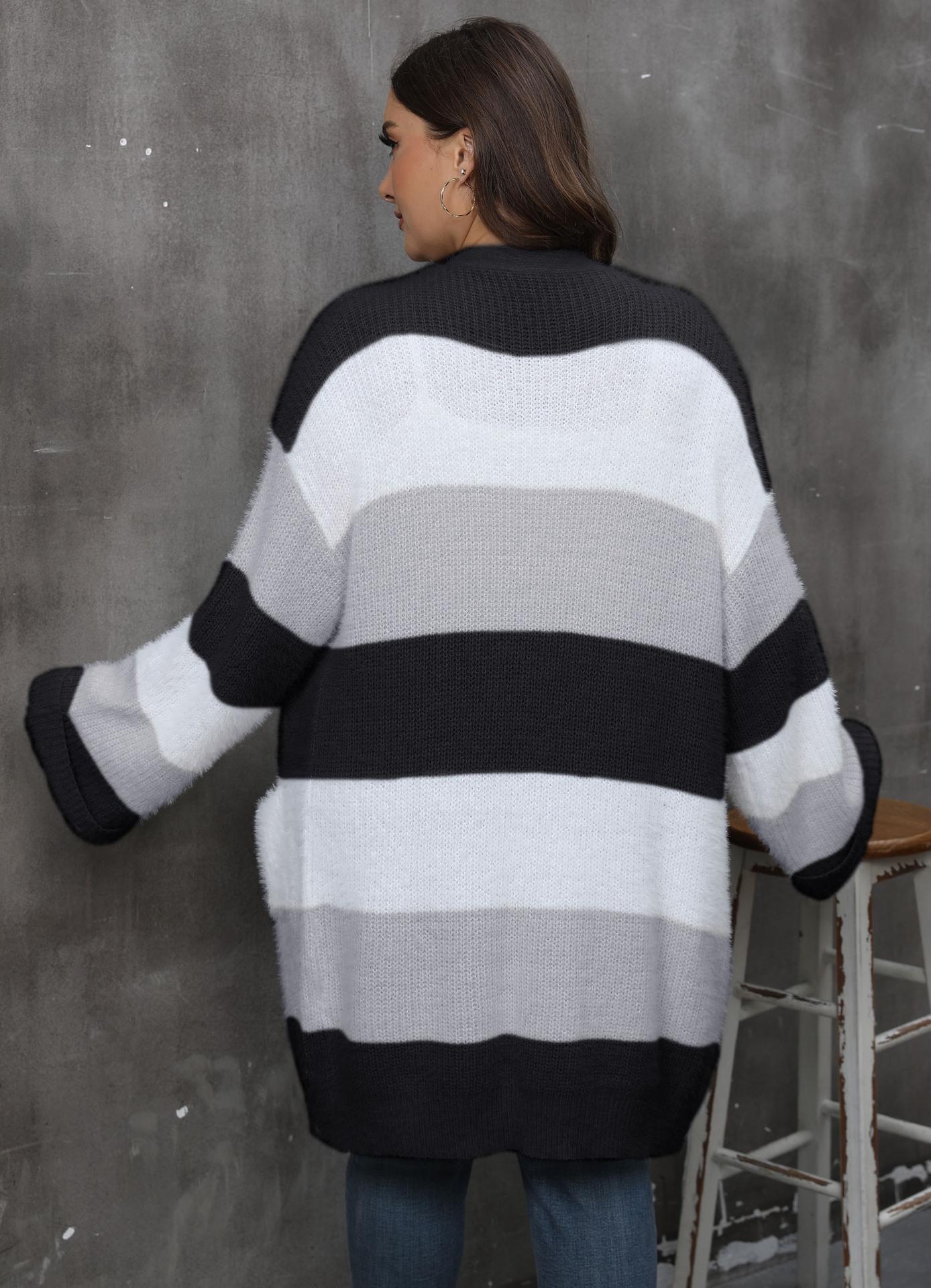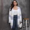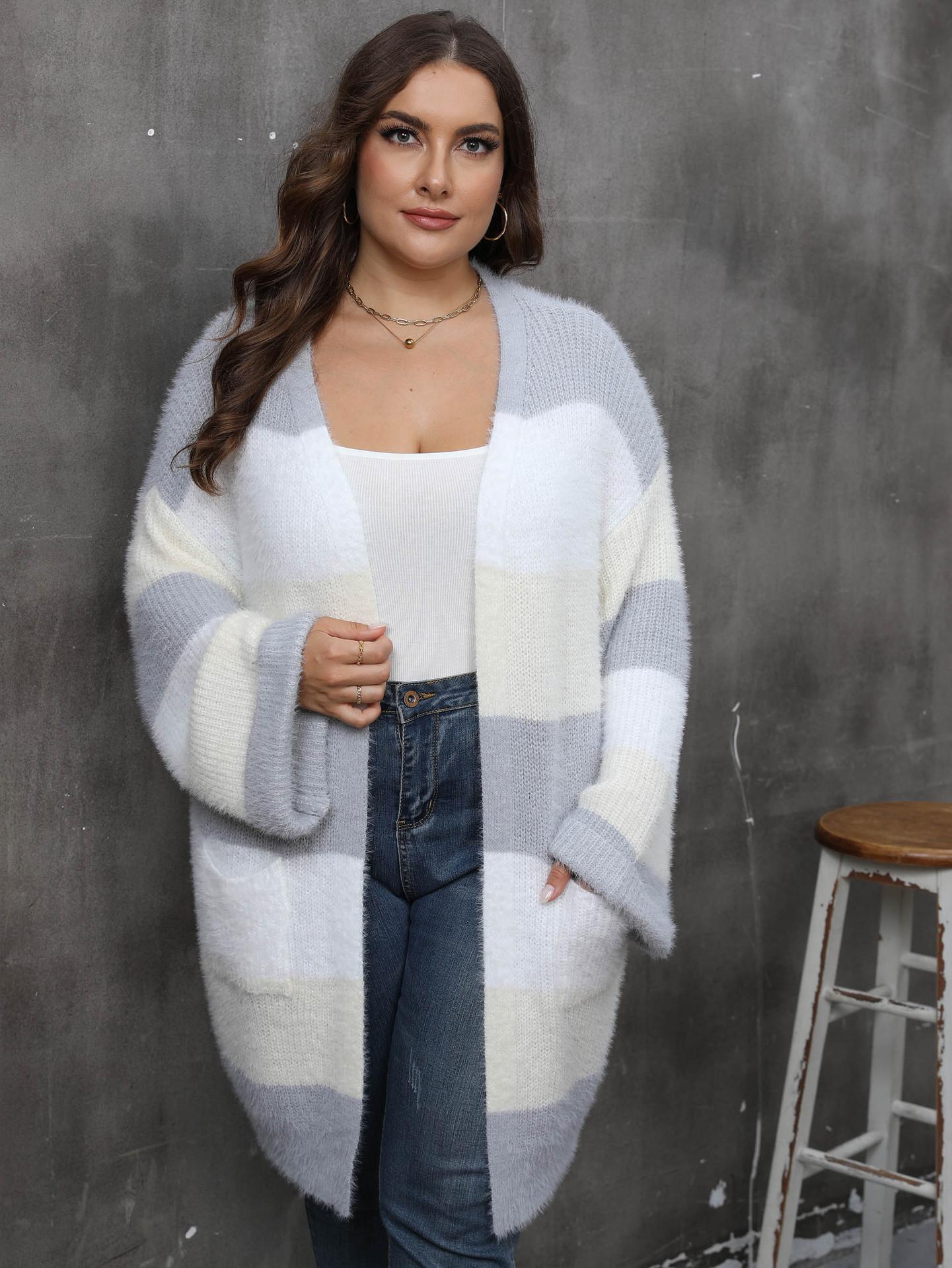 Cárdigan de mujer, talla grande europea y americana, con costuras en contraste de color, tejido entre colores, chaqueta de rayas con doble bolsillo.