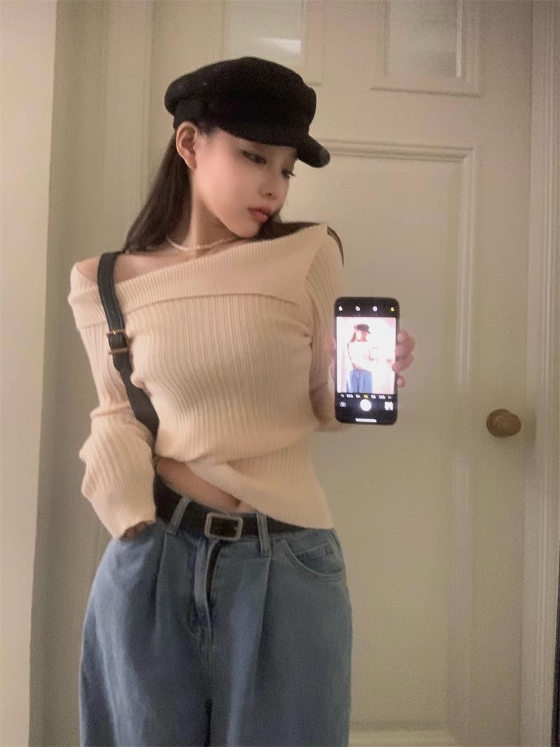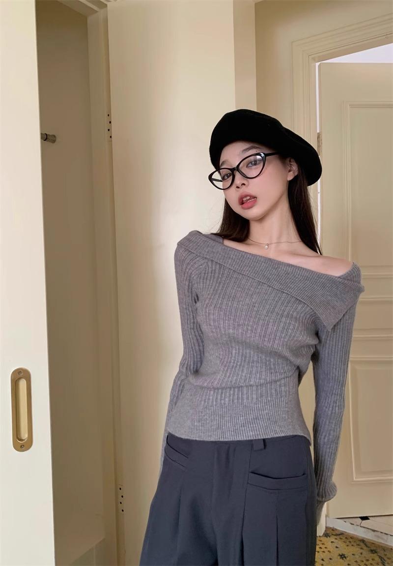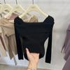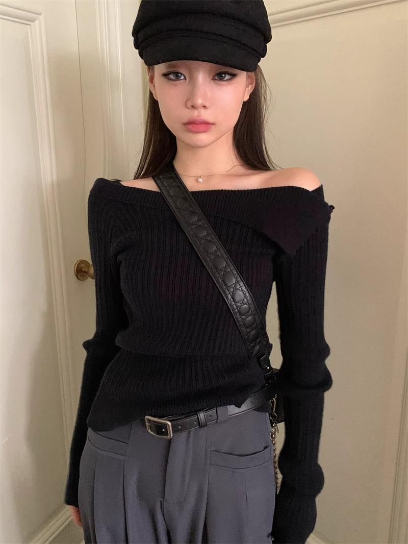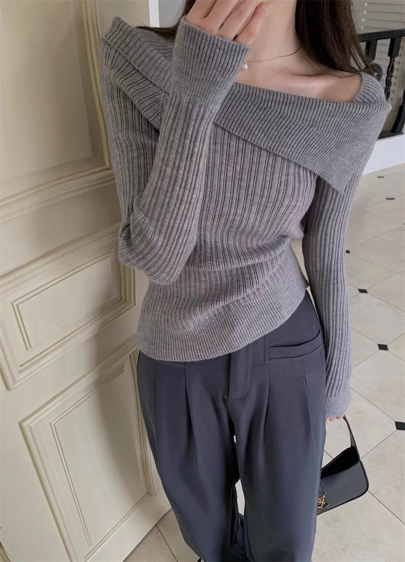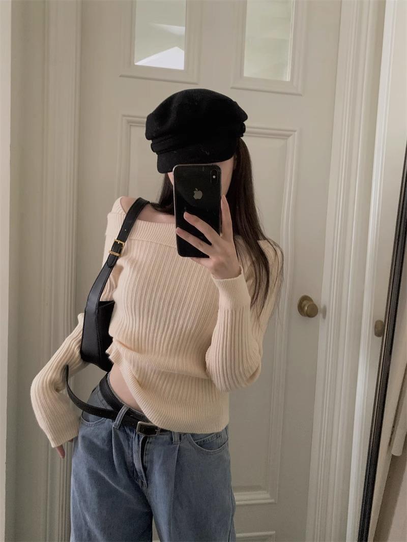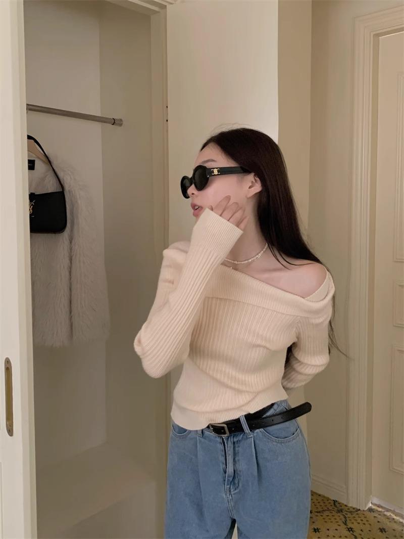 Top popular de otoño temprano para mujer con hombros descubiertos, suéter básico coreano chic de color sólido
