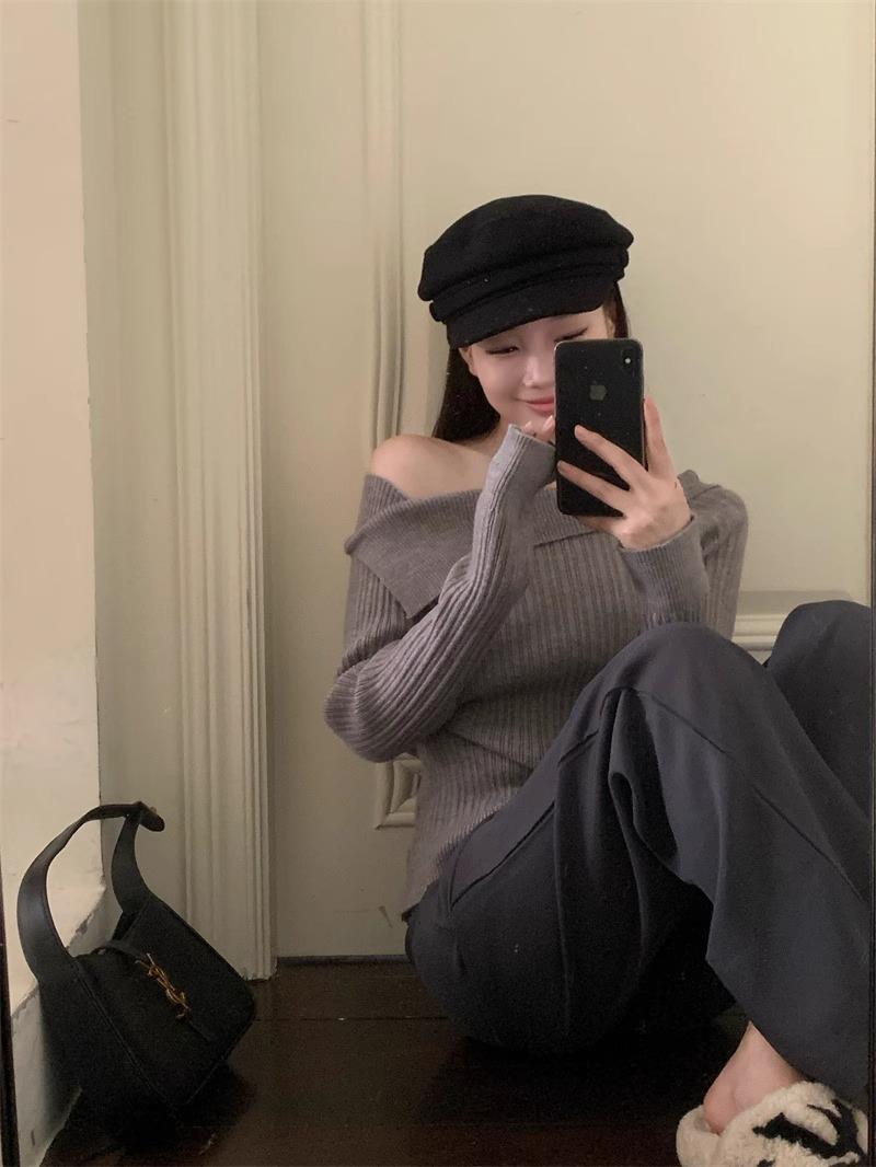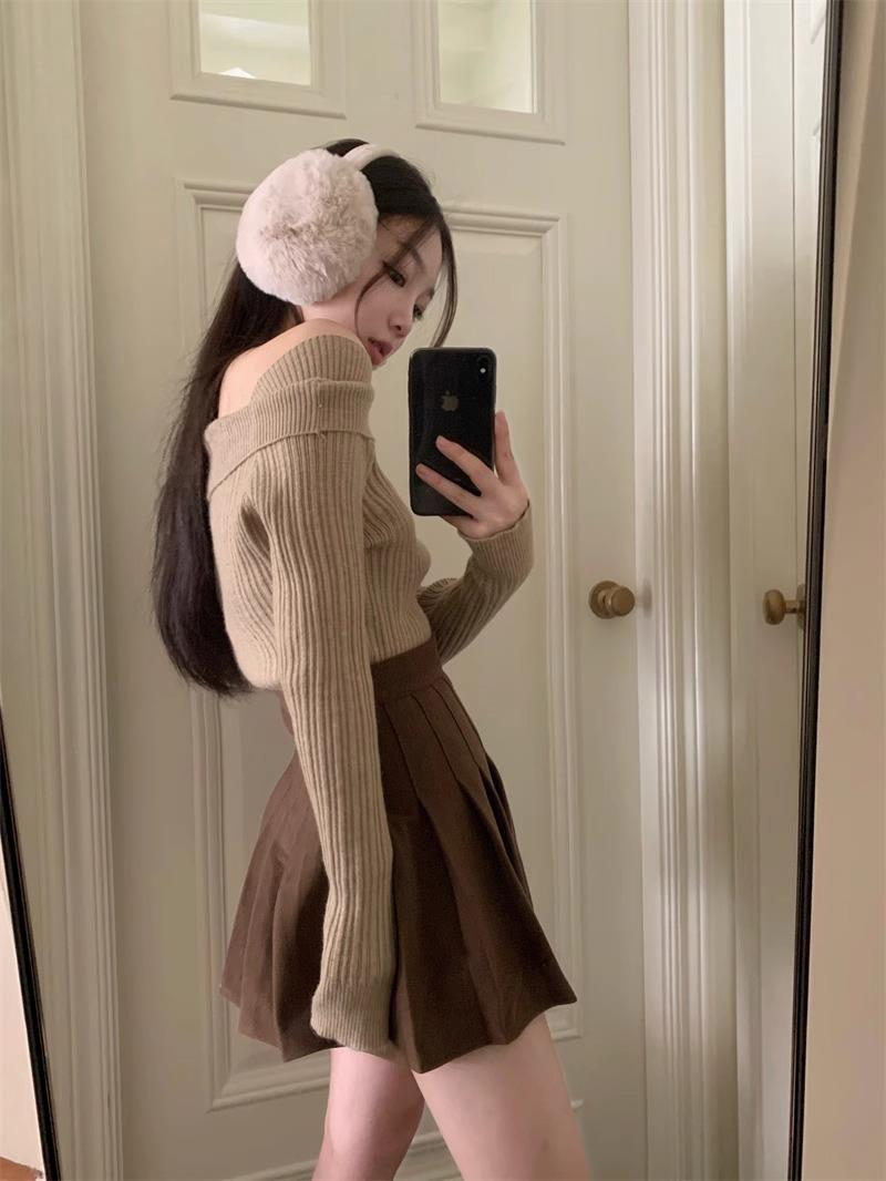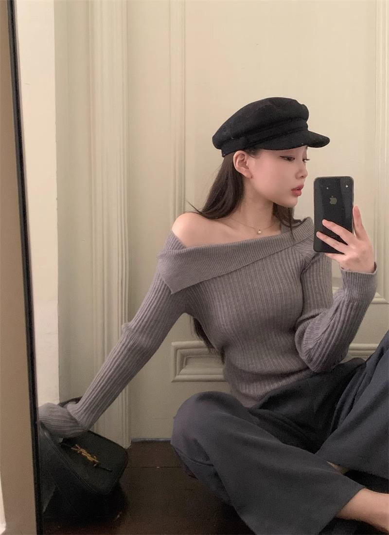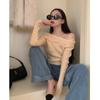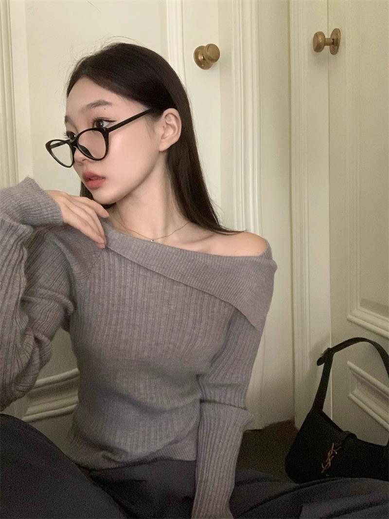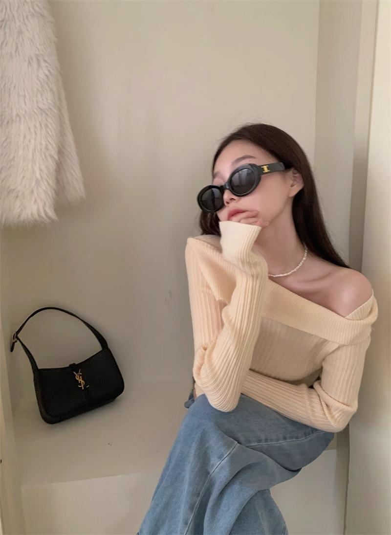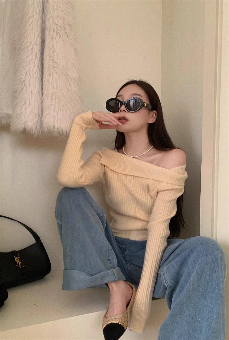 Top popular de otoño temprano para mujer con hombros descubiertos, suéter básico coreano chic de color sólido