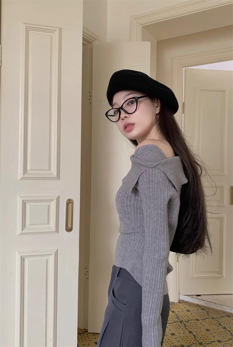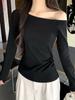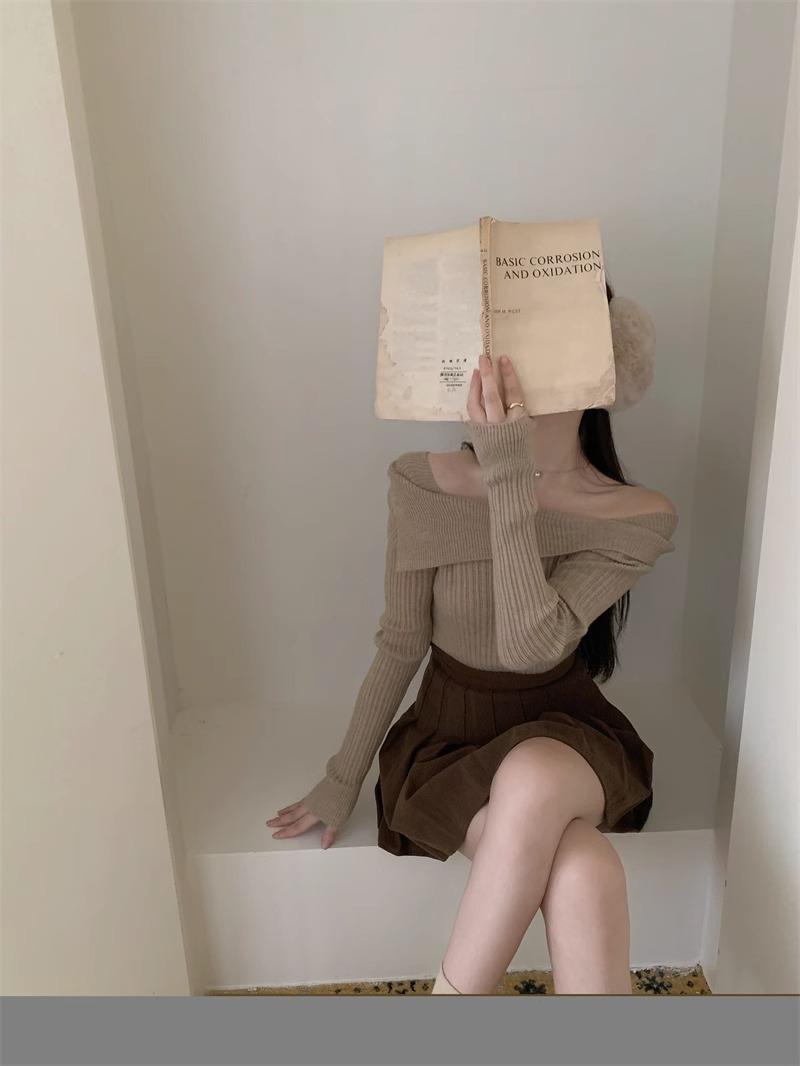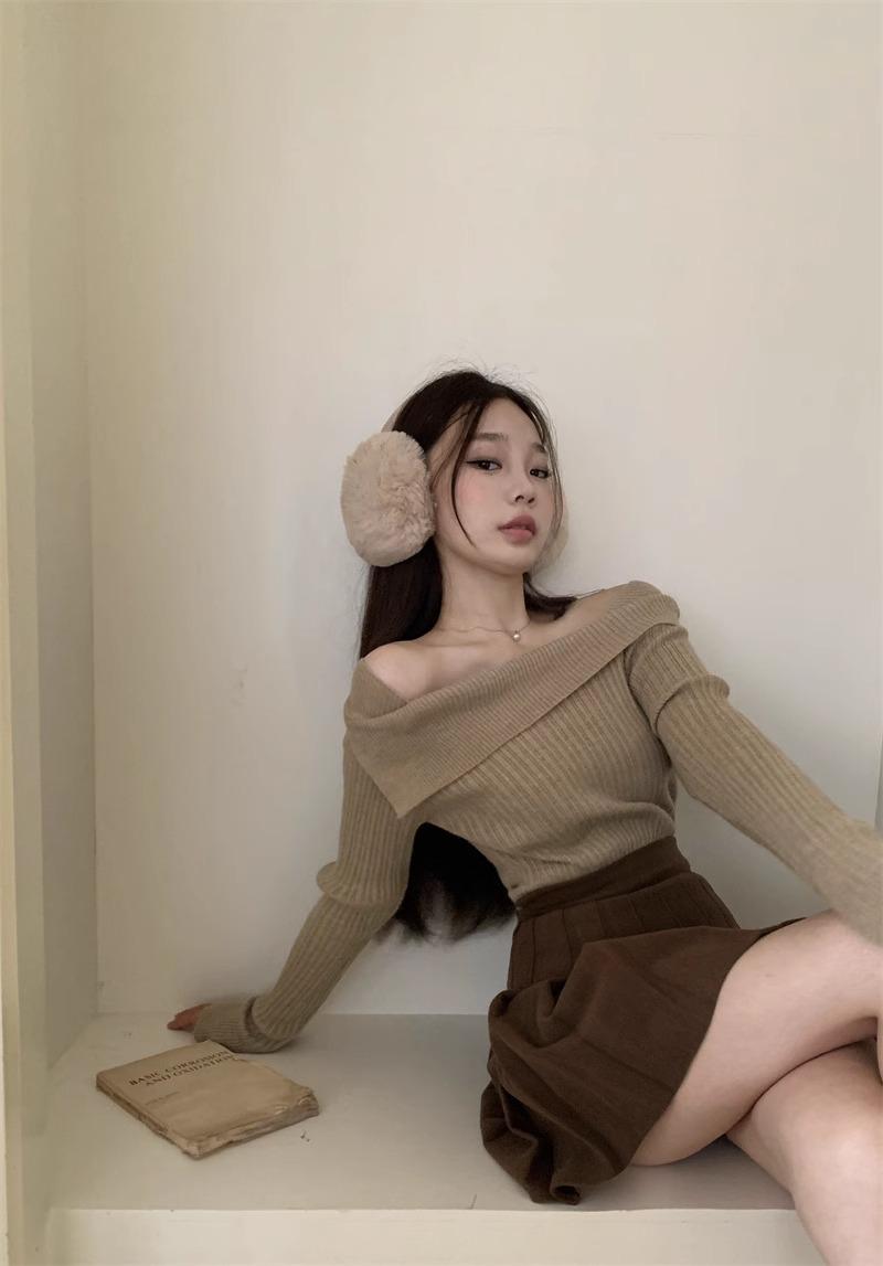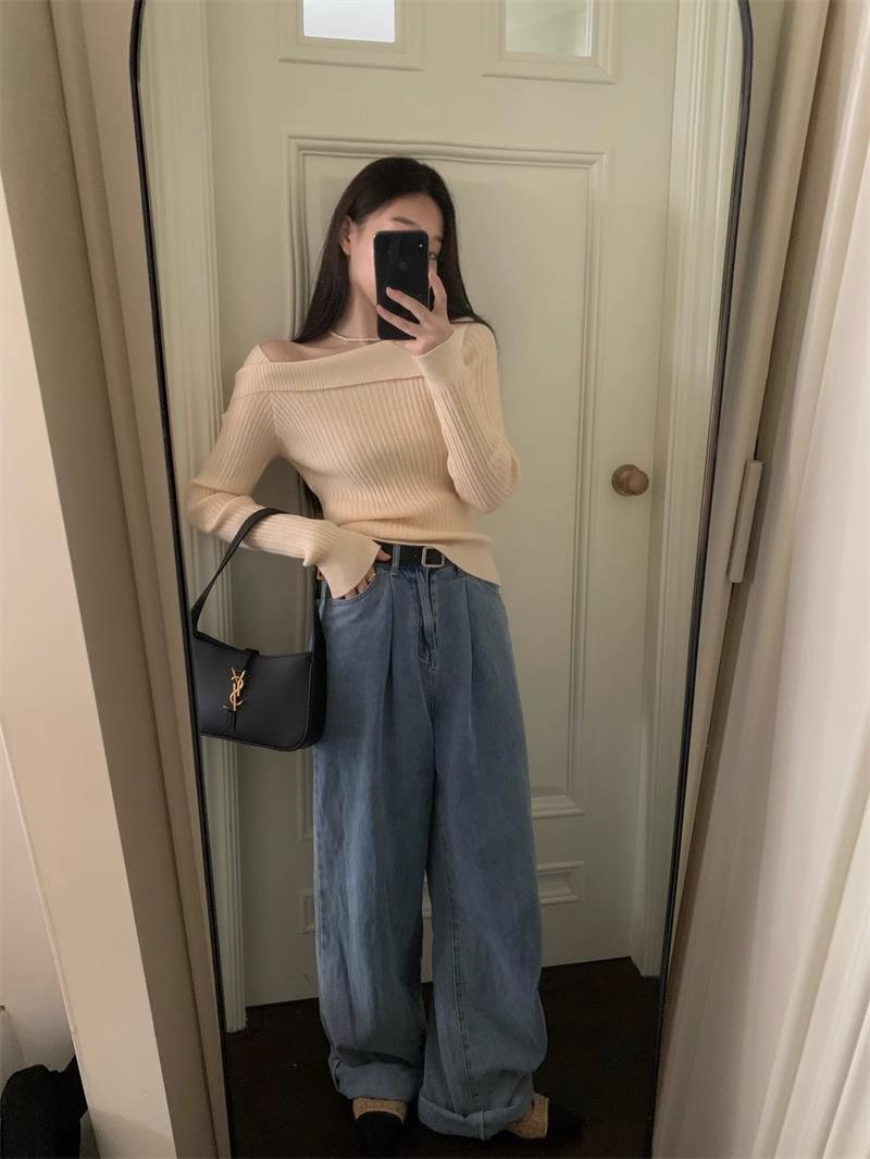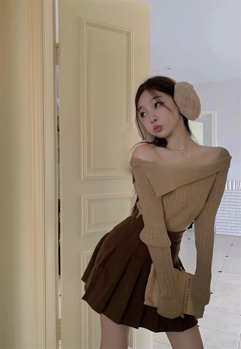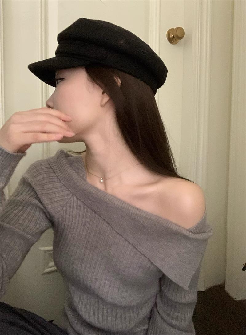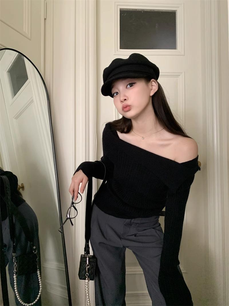 Top popular de otoño temprano para mujer con hombros descubiertos, suéter básico coreano chic de color sólido