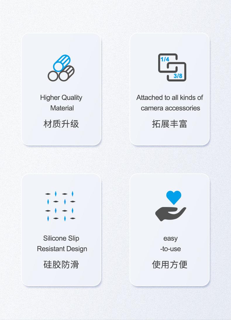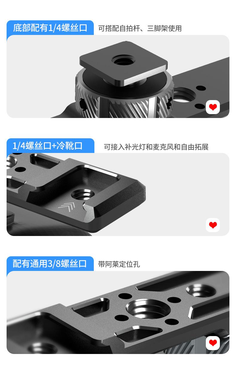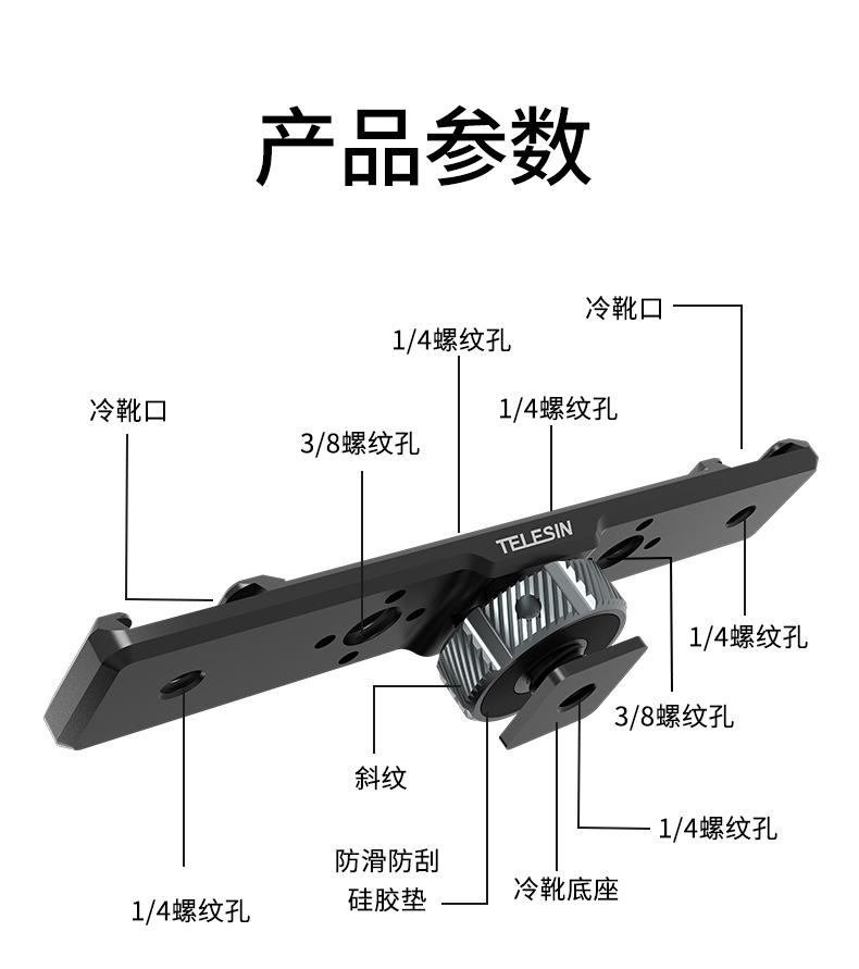 Estructura del producto:Conector de zapata fría universal en la parte inferior (el soporte de zapata fría también tiene uno)agujero roscado de 1/4), dos interfaces de zapata fría, cuatro interfaces de tornillo de 1/4 y dos interfaces roscadas de 3/8 (con orificios de posicionamiento Arri)