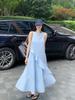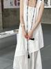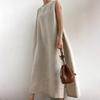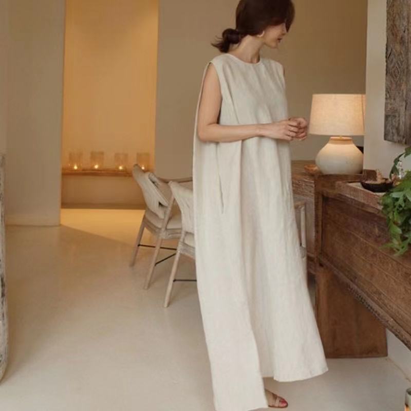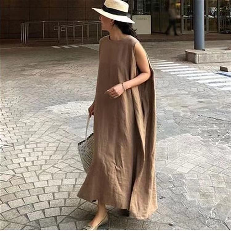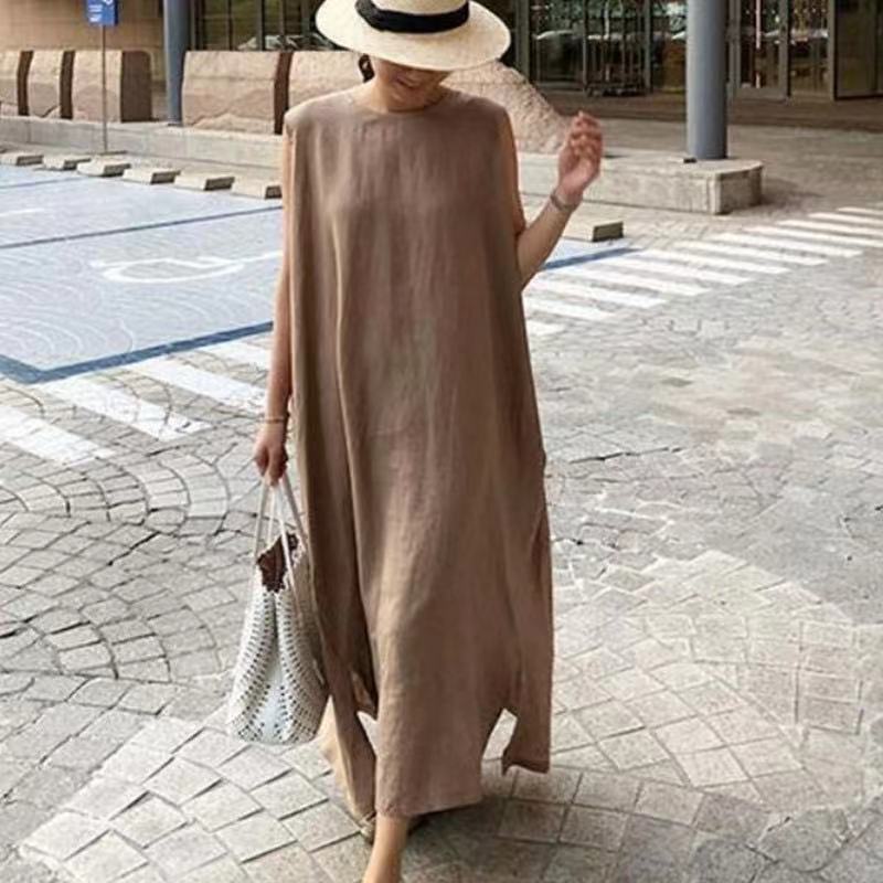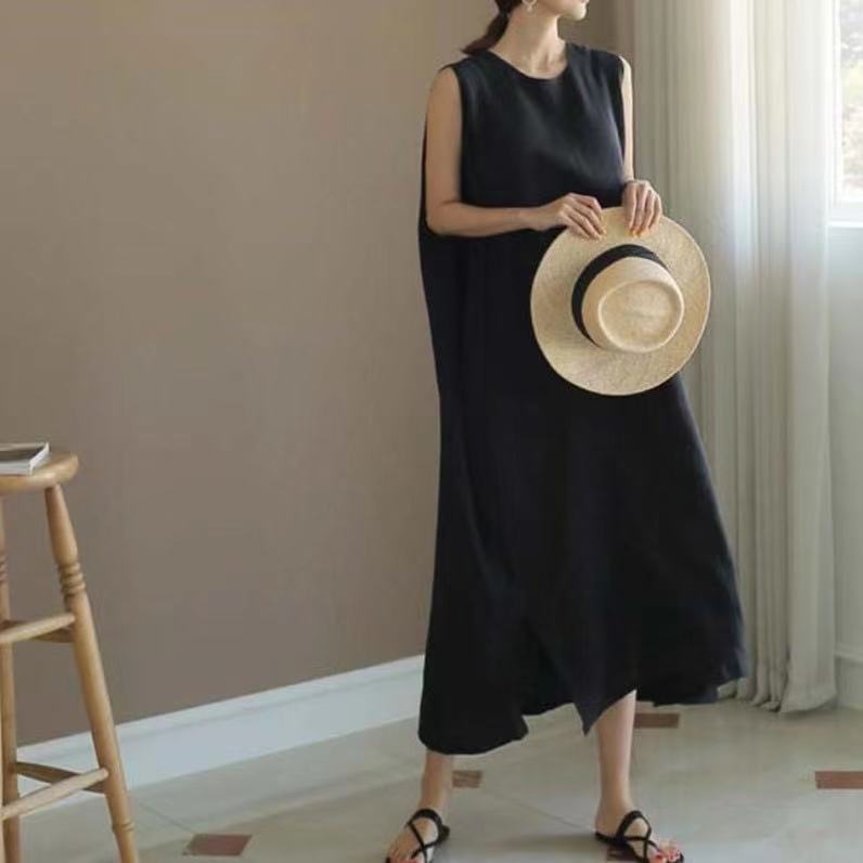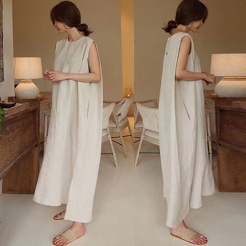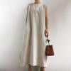Chic Celebridad de Internet Recomendado Algodón y Lino Vestido sin Mangas con Abertura para Mujer Vestido Chaleco Color Sólido Holgado Estilo Frío Perezoso Vestido Largo